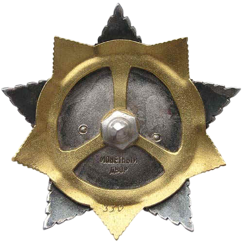 Золотого содержания в ордене первой степени — около 20 г, серебряного — не менее 26 г. Общий вес ордена – 42 г. Размеры знака ордена меж концом звезды и противолежащим ему концом пучка лучей — 56 мм. Муаровая лента к ордену светло-синего цвета, с одной продольной белой полосой посреди ленты, шириной 5 мм. Ширина ленты — 24 мм.