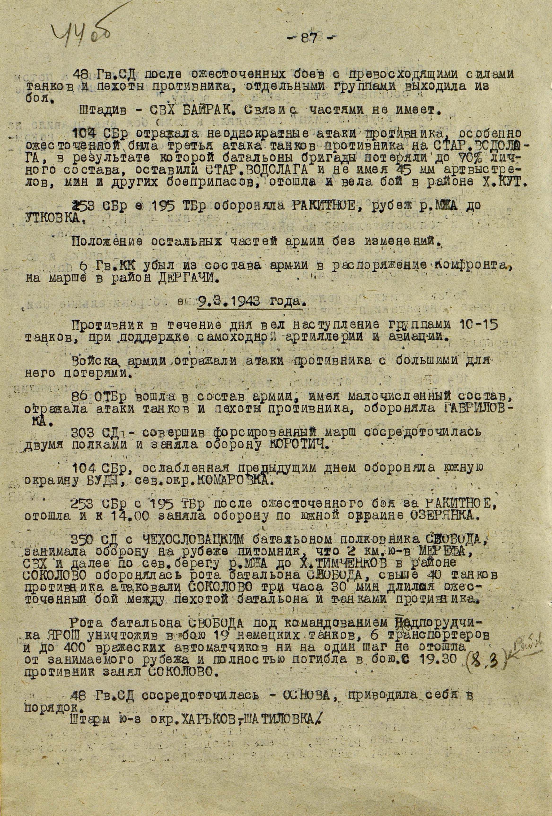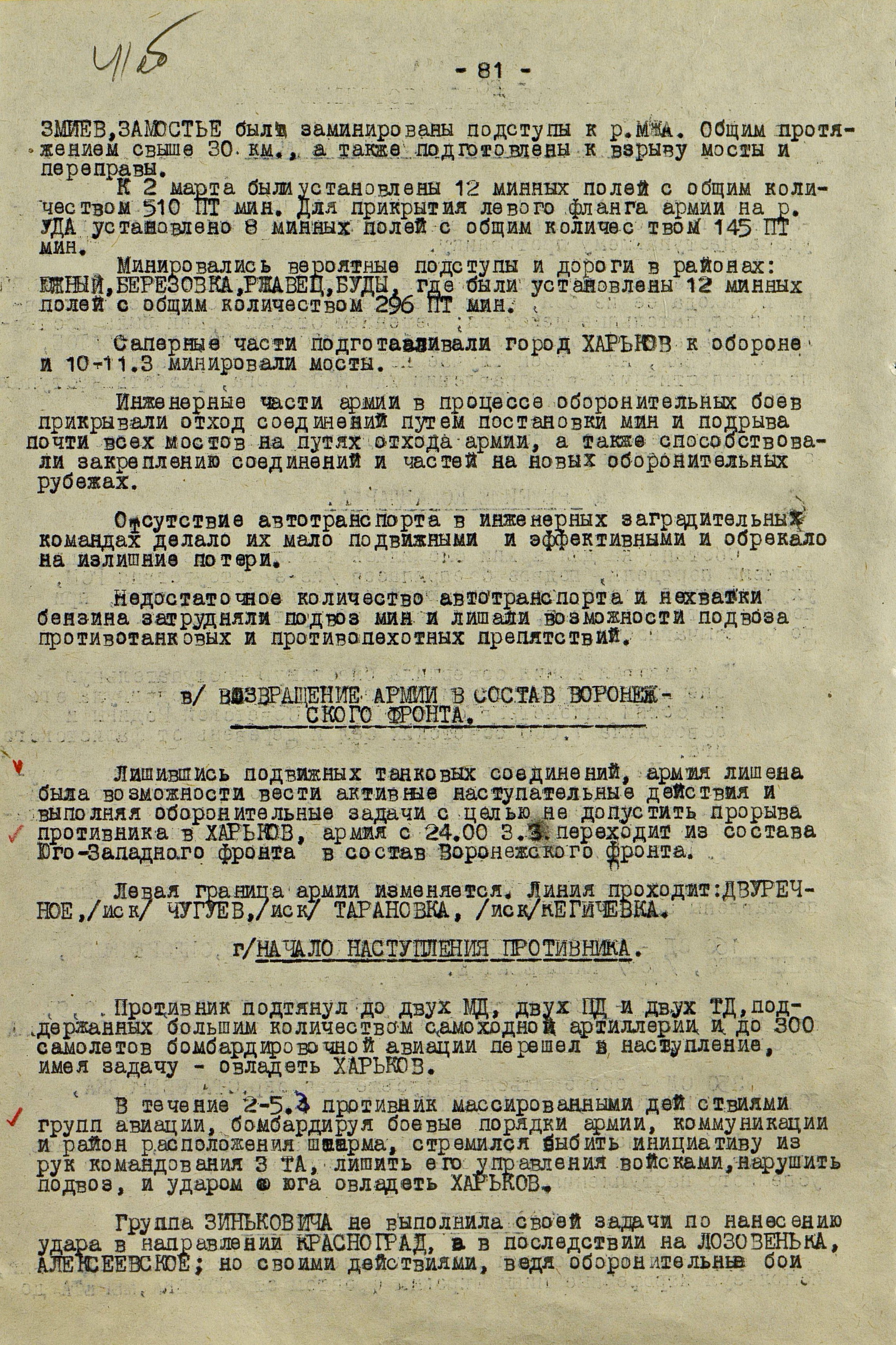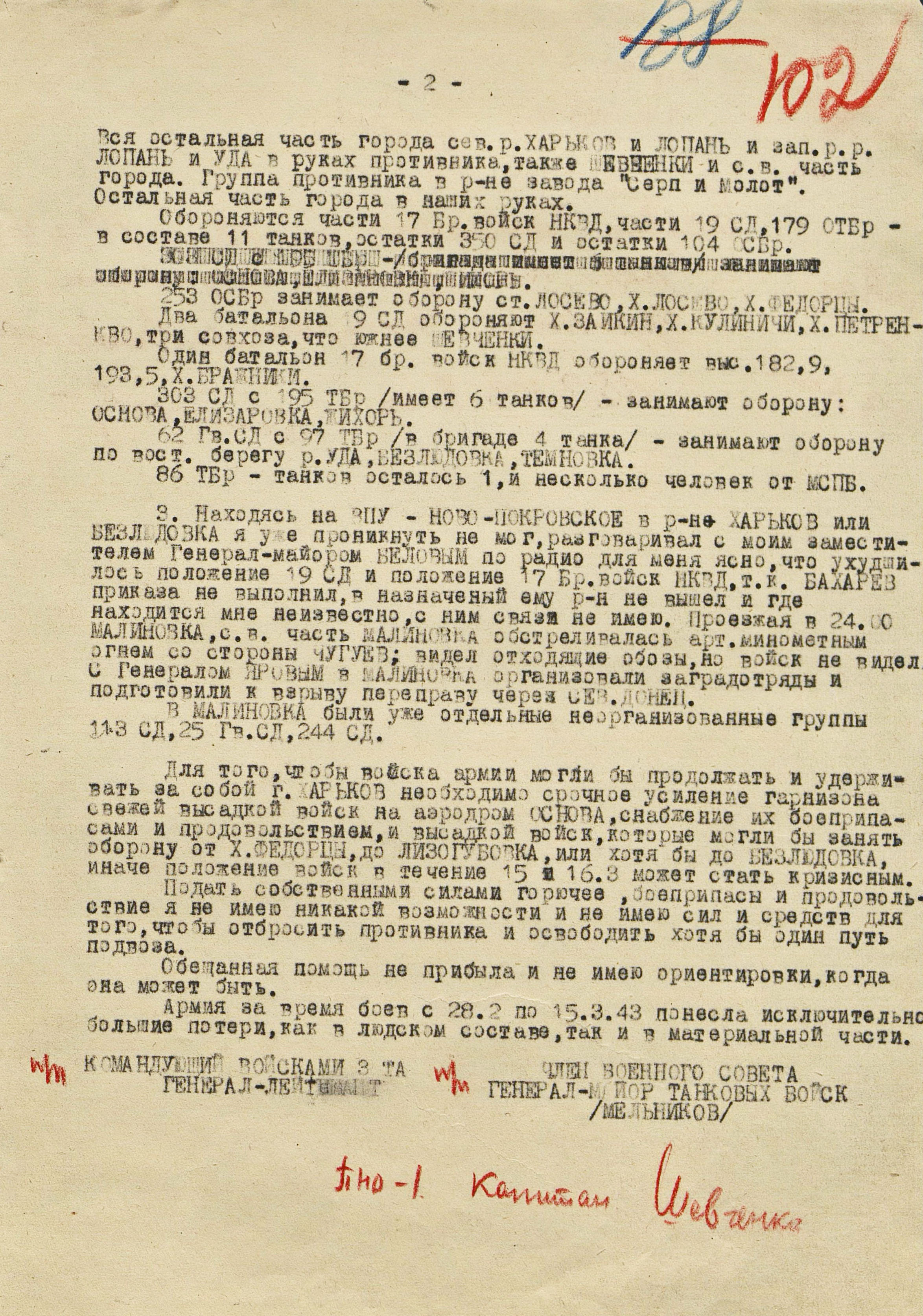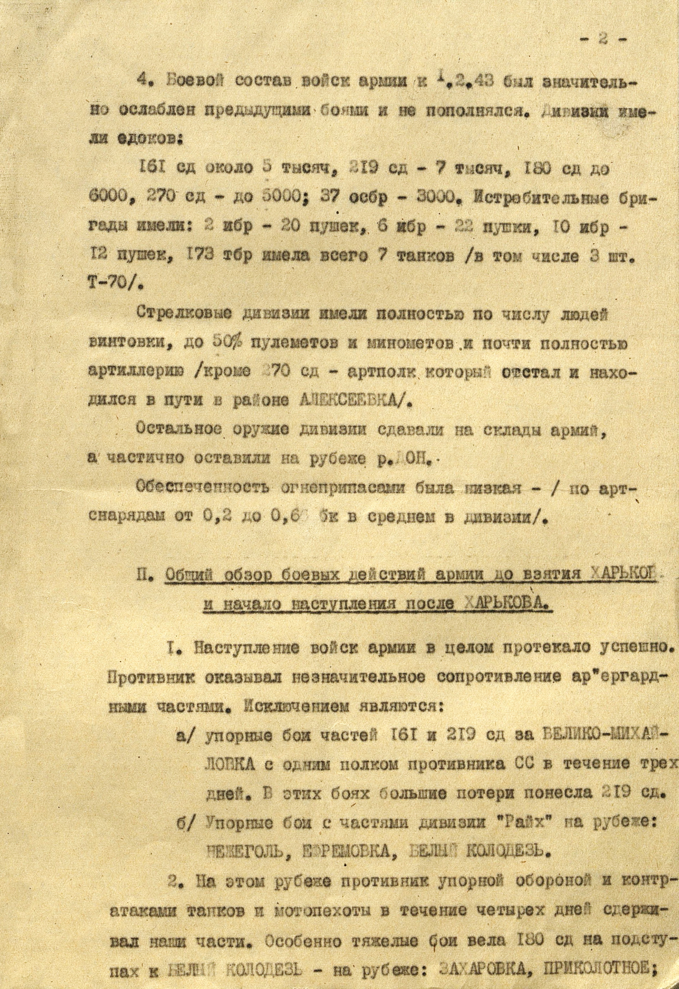 Войска Воронежского фронта (генерал-полковник Ф.И. Голиков) к исходу 3 марта во время Харьковской наступательной операции 1943 г. достигли рубежа Суджа, Лебедин, Опошня, Минковка и, исчерпав свои наступательные возможности, перешли к обороне. Против левого крыла фронта (40-я, 69-я и 3-я танковая армии), оборонявшего харьковское направление и имевшего в своём составе 16 стрелковых дивизий, 2 стрелковые и 2 танковые бригады, 3 танковых и 1 кавалерийский корпуса, противник развернул 10 пехотных, 6 танковых и 1 моторизованную дивизии группы армий «Юг» (генерал-фельдмаршал Э. Манштейн). Советские войска были обескровлены в ходе длительных наступательных боёв: численность стрелковых дивизий не превышала 3,5-4 тыс. человек, 3-я танковая армия имела всего 50 танков, оперативные резервы отсутствовали. Противник на харьковском направлении к началу марта имел превосходство в людях в 2, артиллерии - в 2,6, танках - в 11,4, самолетах - более чем в 3 раза.