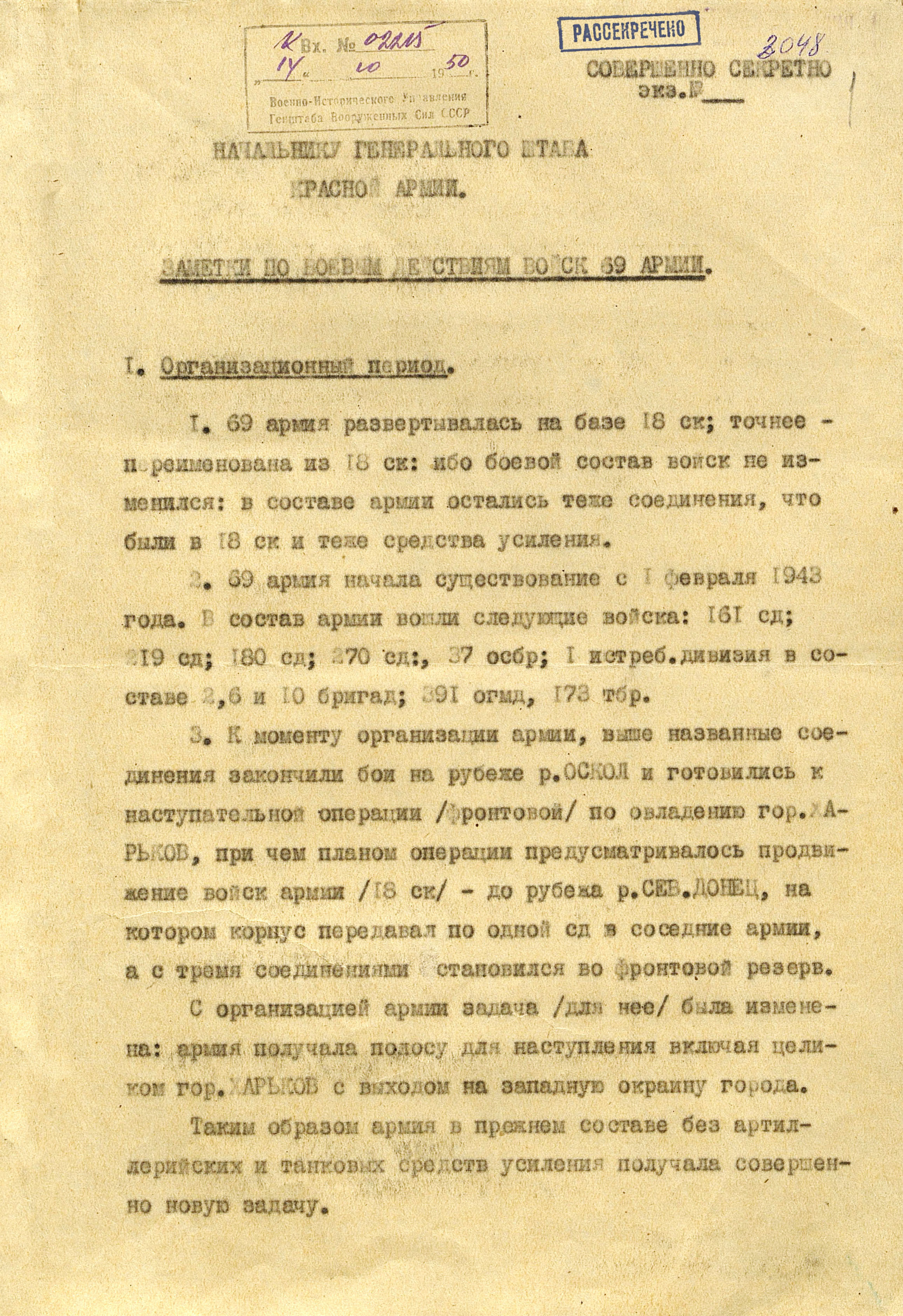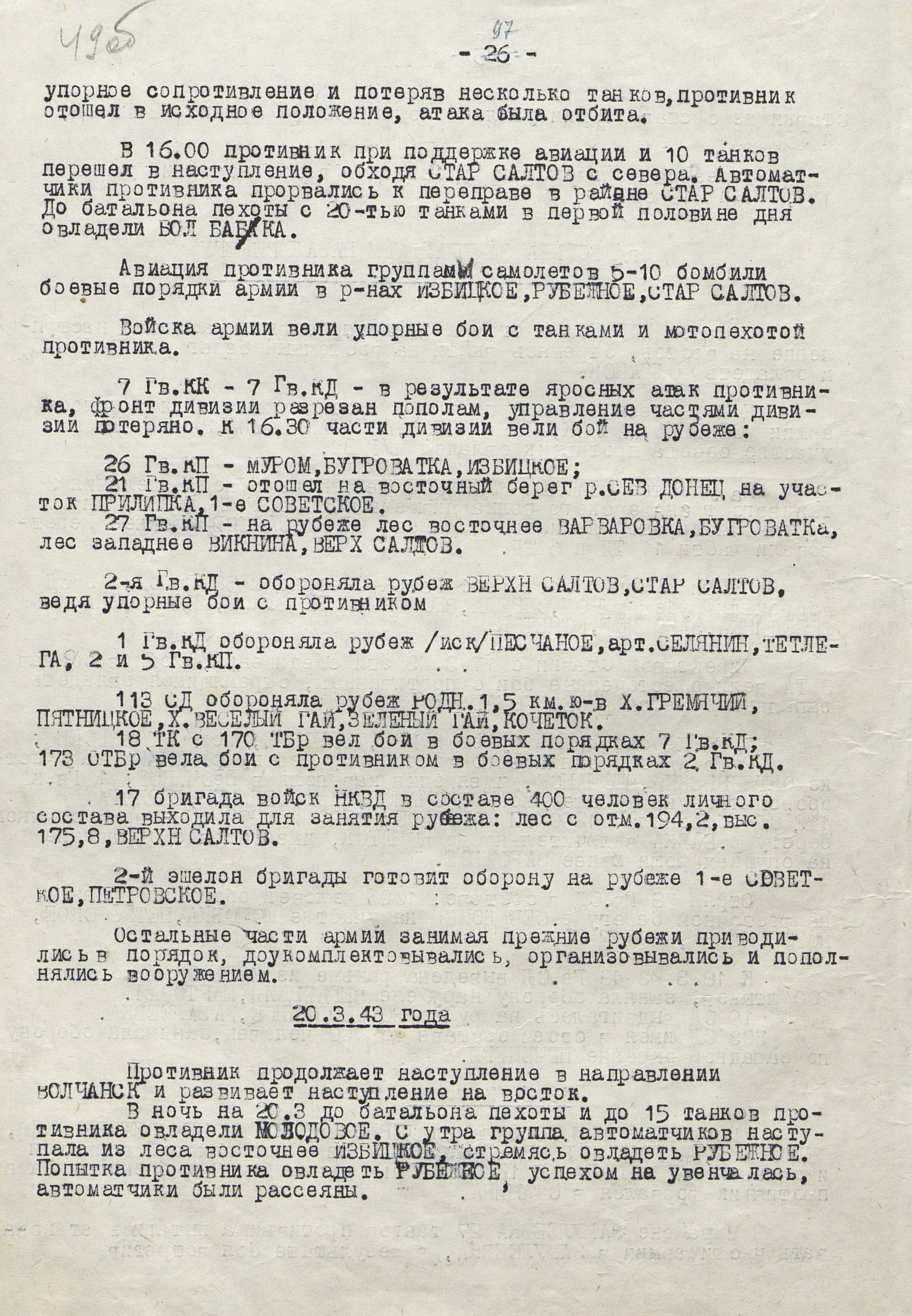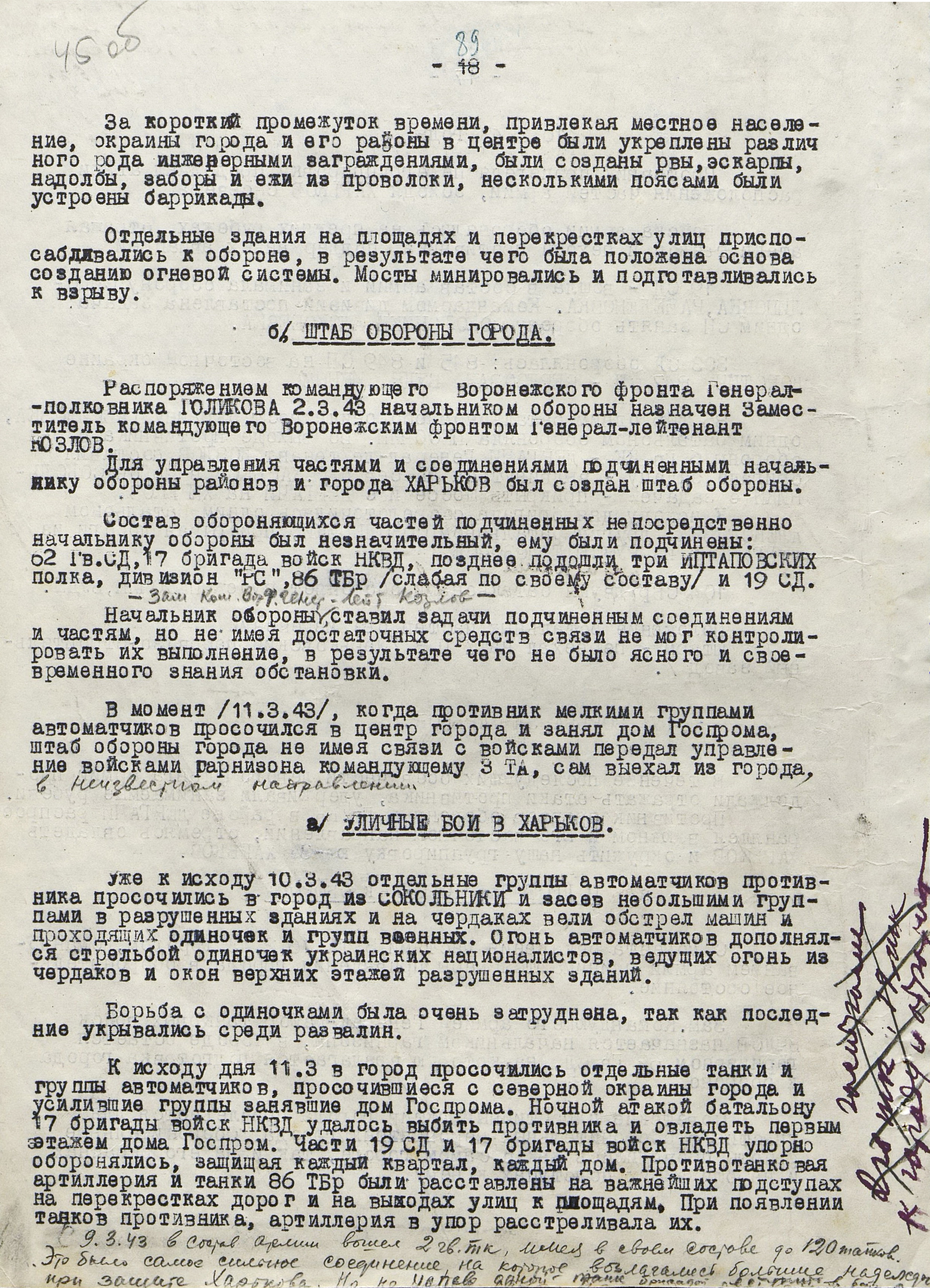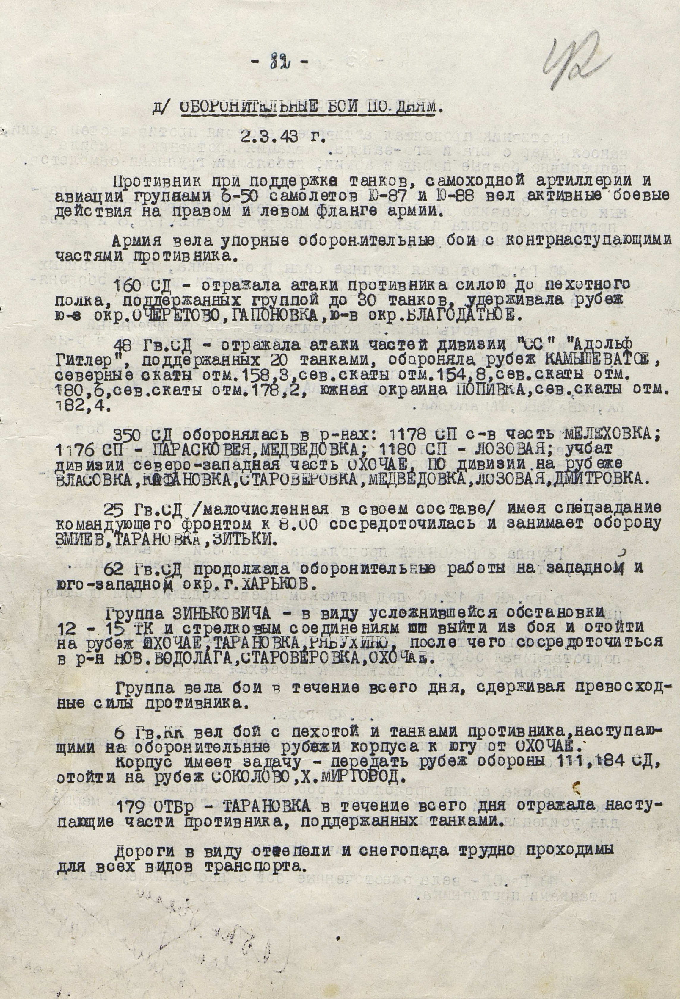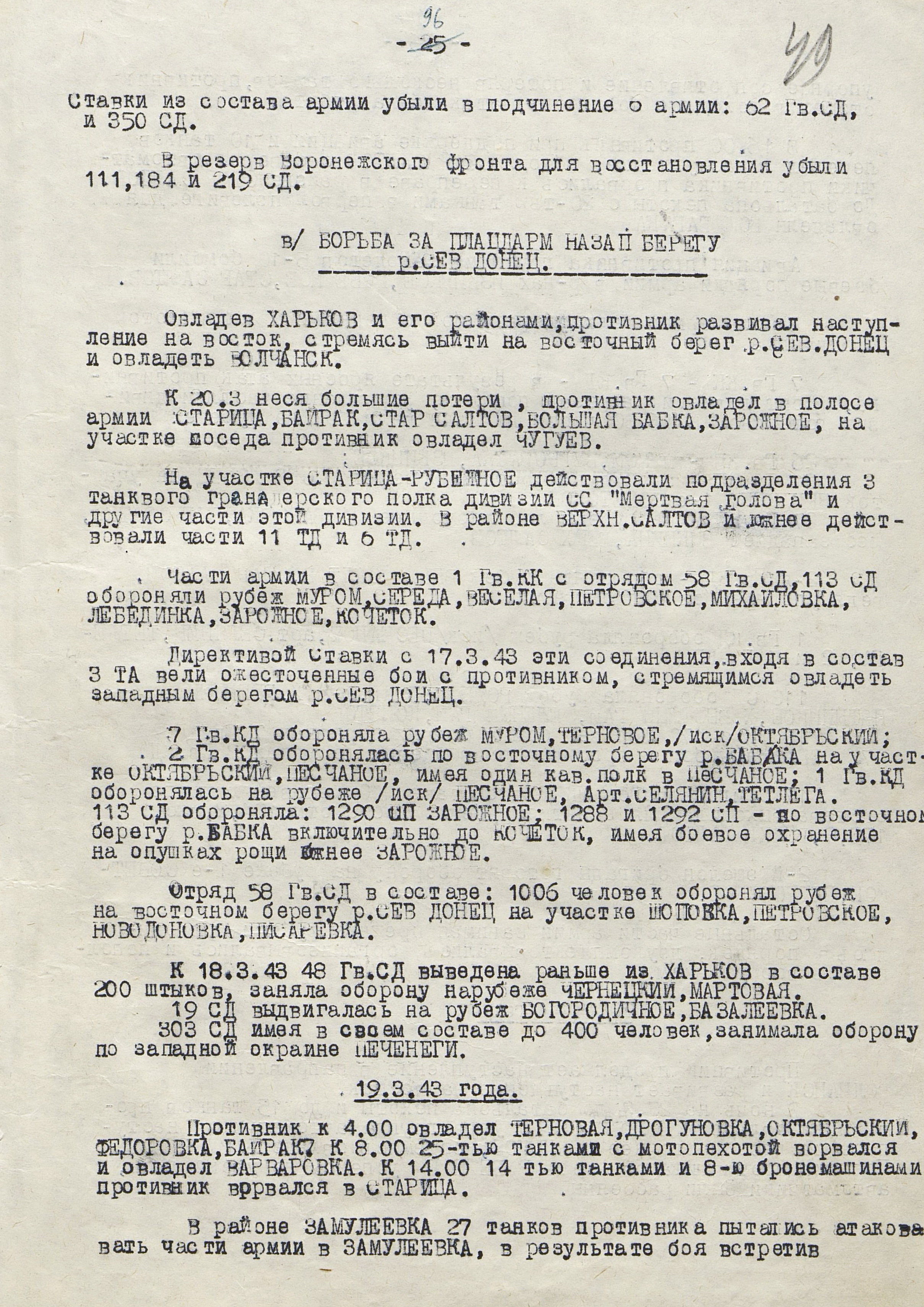 Войска Воронежского фронта (генерал-полковник Ф.И. Голиков) к исходу 3 марта во время Харьковской наступательной операции 1943 г. достигли рубежа Суджа, Лебедин, Опошня, Минковка и, исчерпав свои наступательные возможности, перешли к обороне. Против левого крыла фронта (40-я, 69-я и 3-я танковая армии), оборонявшего харьковское направление и имевшего в своём составе 16 стрелковых дивизий, 2 стрелковые и 2 танковые бригады, 3 танковых и 1 кавалерийский корпуса, противник развернул 10 пехотных, 6 танковых и 1 моторизованную дивизии группы армий «Юг» (генерал-фельдмаршал Э. Манштейн). Советские войска были обескровлены в ходе длительных наступательных боёв: численность стрелковых дивизий не превышала 3,5-4 тыс. человек, 3-я танковая армия имела всего 50 танков, оперативные резервы отсутствовали. Противник на харьковском направлении к началу марта имел превосходство в людях в 2, артиллерии - в 2,6, танках - в 11,4, самолетах - более чем в 3 раза.