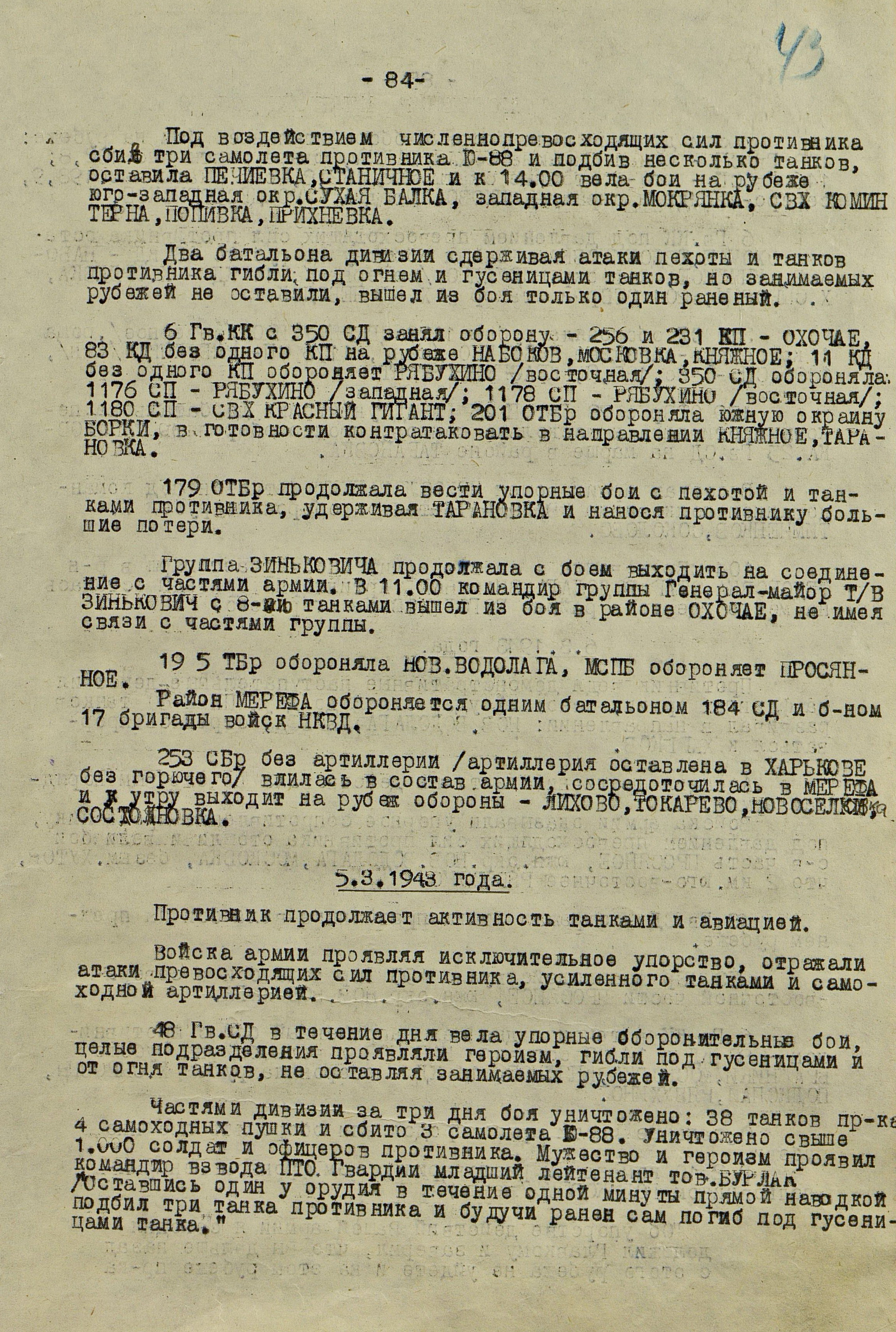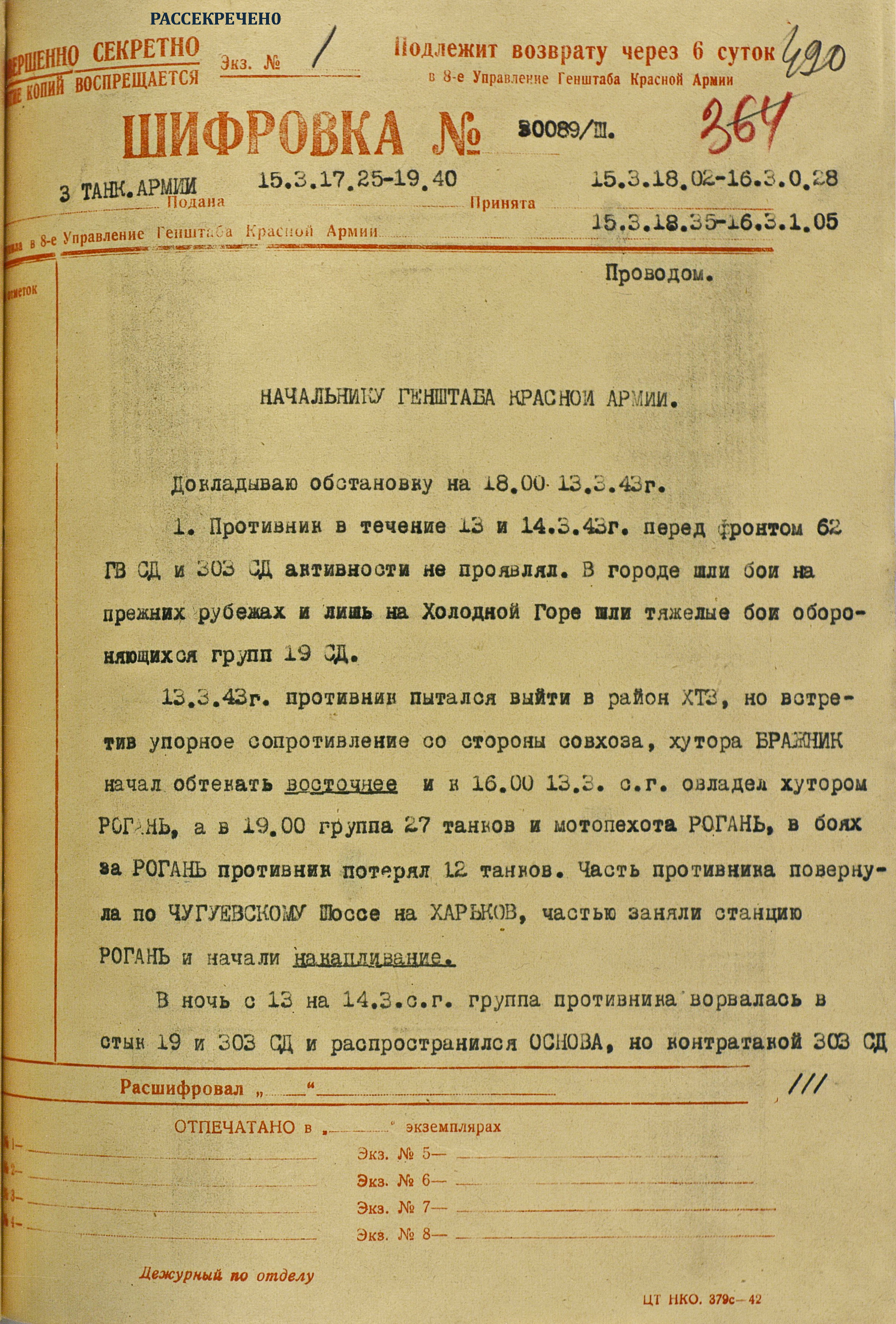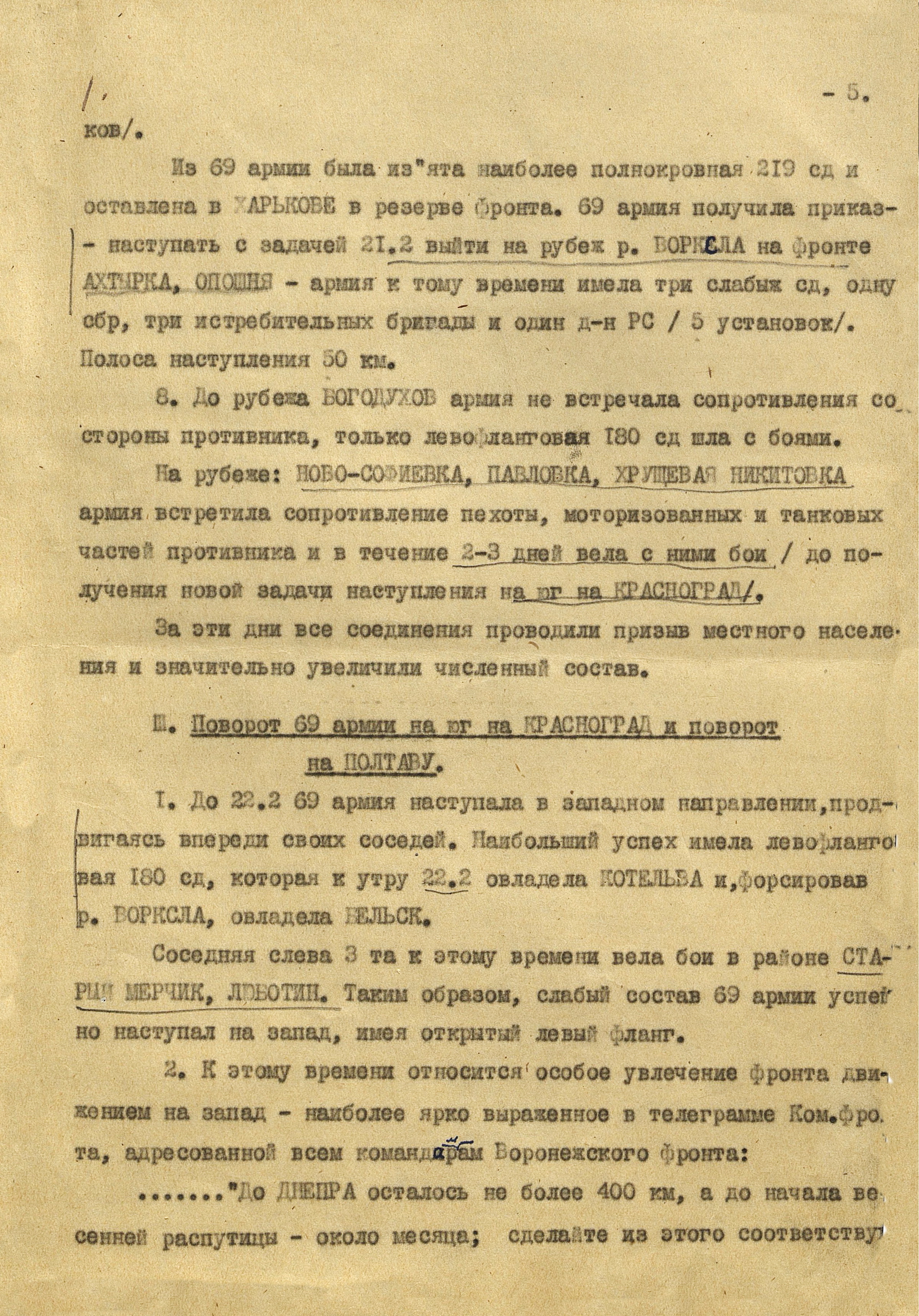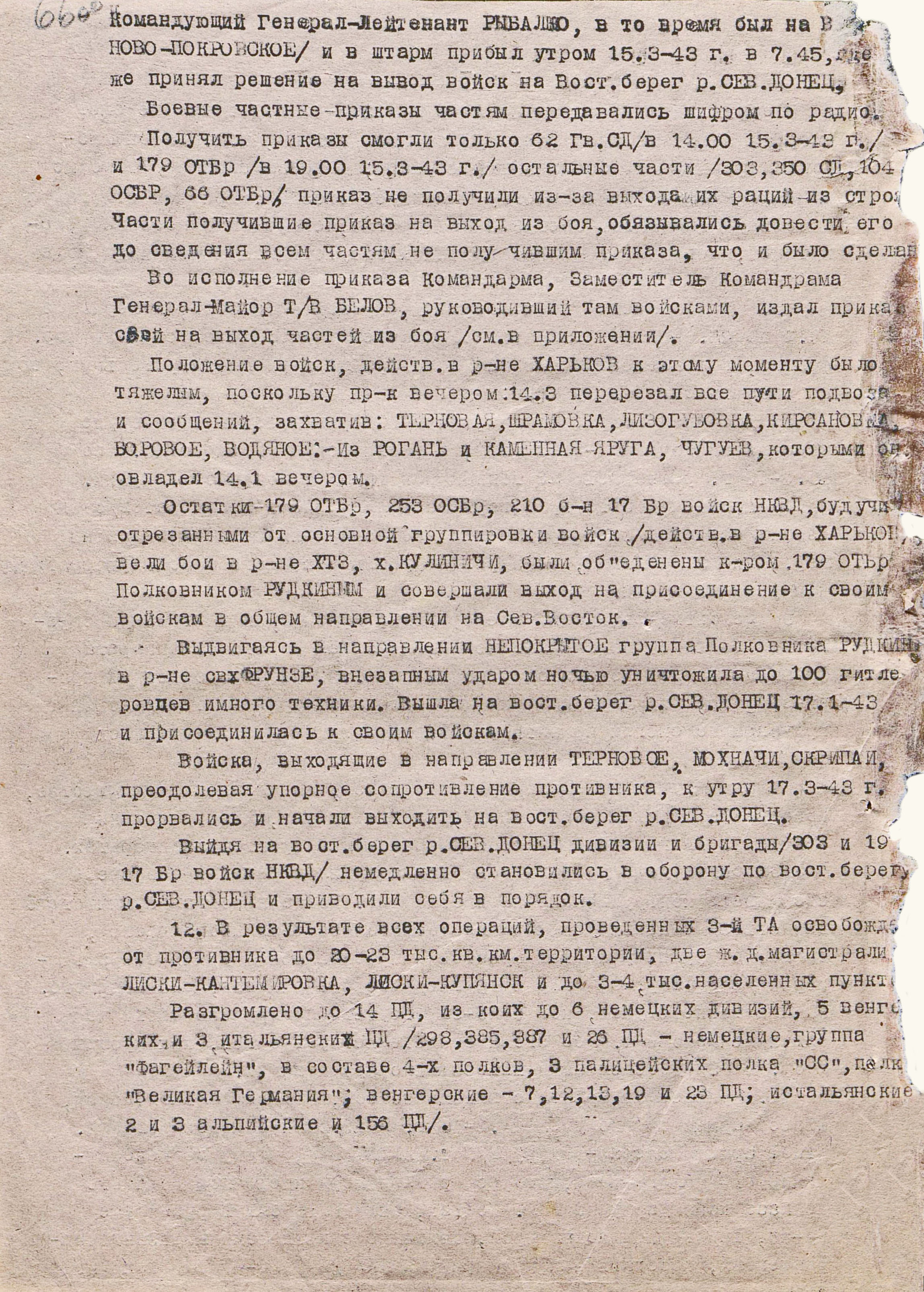 4 марта 4-я танковая армия противника нанесла удар по частям 3-й танковой армии (генерал-лейтенант танковых войск П.С. Рыбалко). В течение двух дней советские войска стойко отражали атаки врага и не позволяли ему прорваться к Харькову с юга. Противник сумел лишь вклиниться в оборону 3-й танковой армии на 6-8 км. Немецкое командование было вынуждено перенести направление главного удара к западу и 6 марта нанесло удар в стык между 69-й (генерал-майор В.Д. Крюченкин) и 3-й танковой армиями. После тяжелых боёв советские войска 69-й и 3-й танковой армий оставили 7 марта Валки, а 9 марта - Люботин.