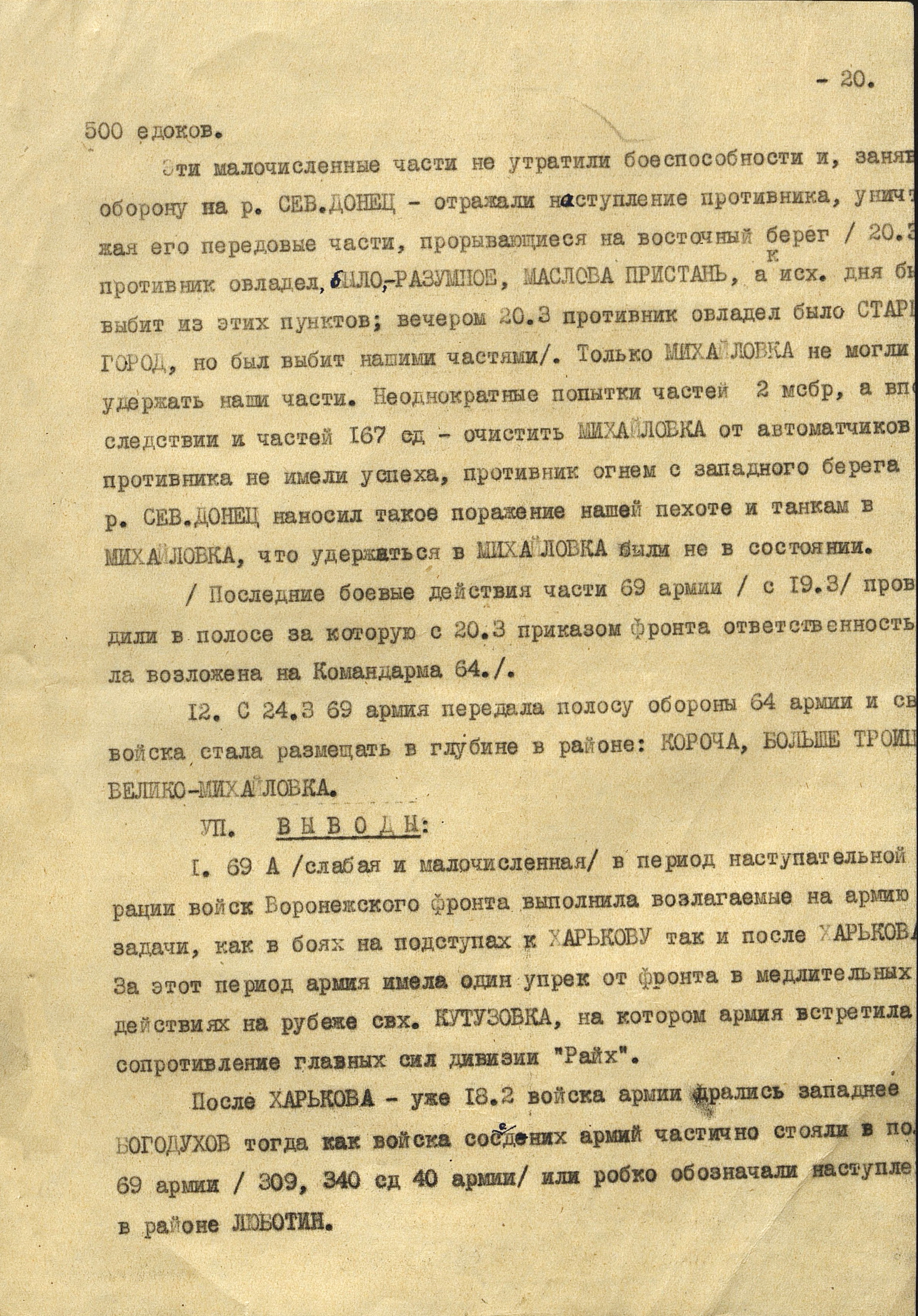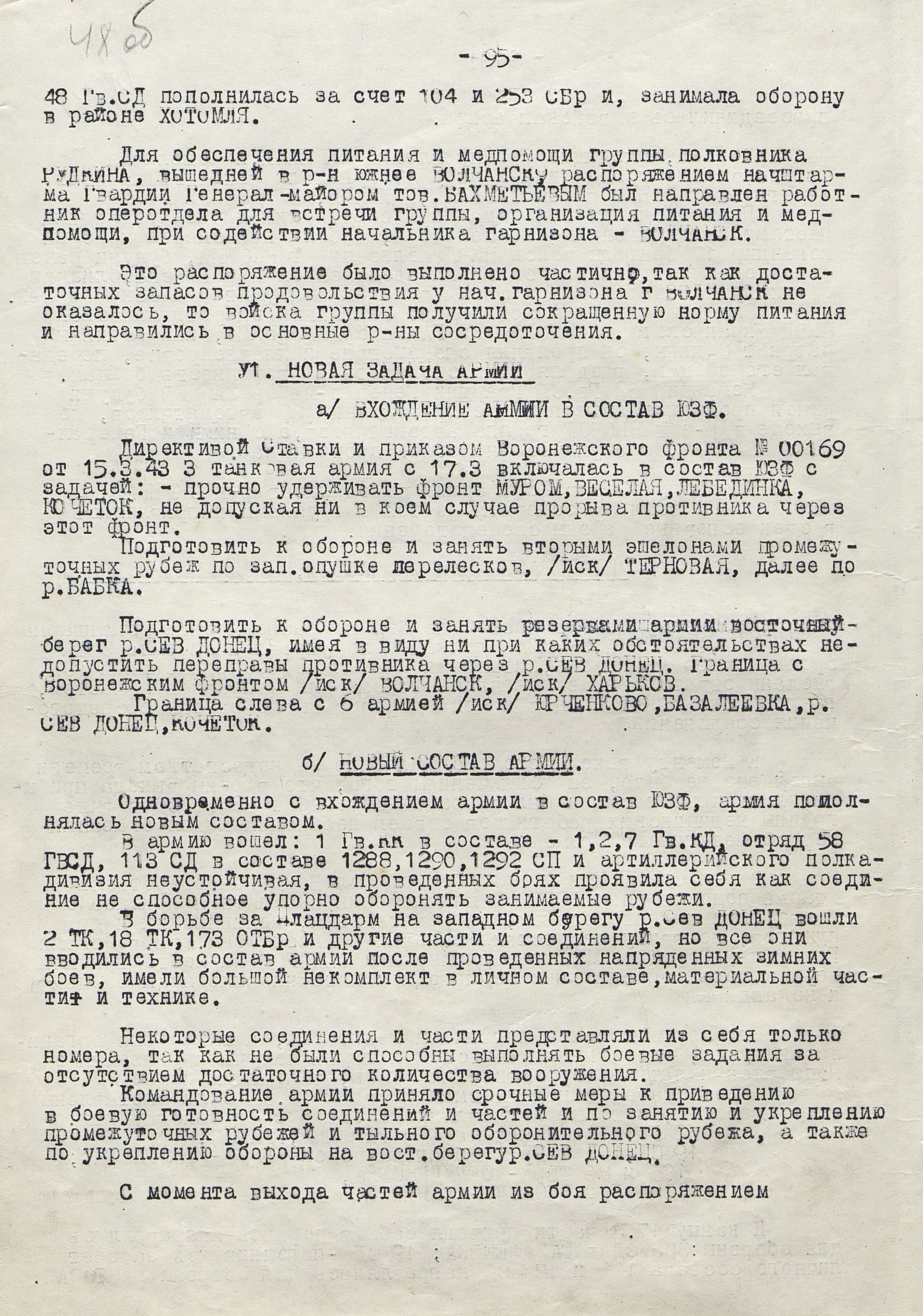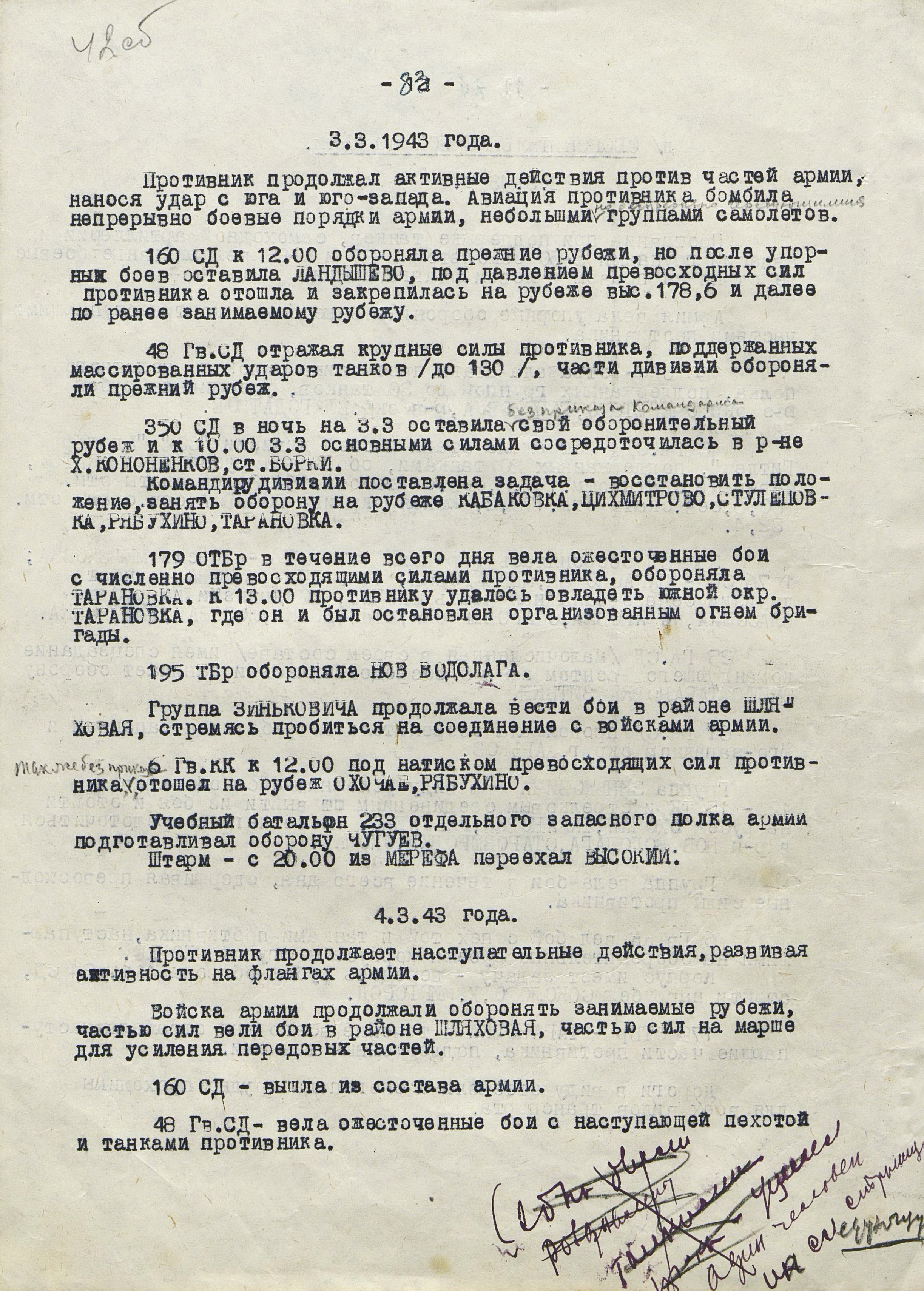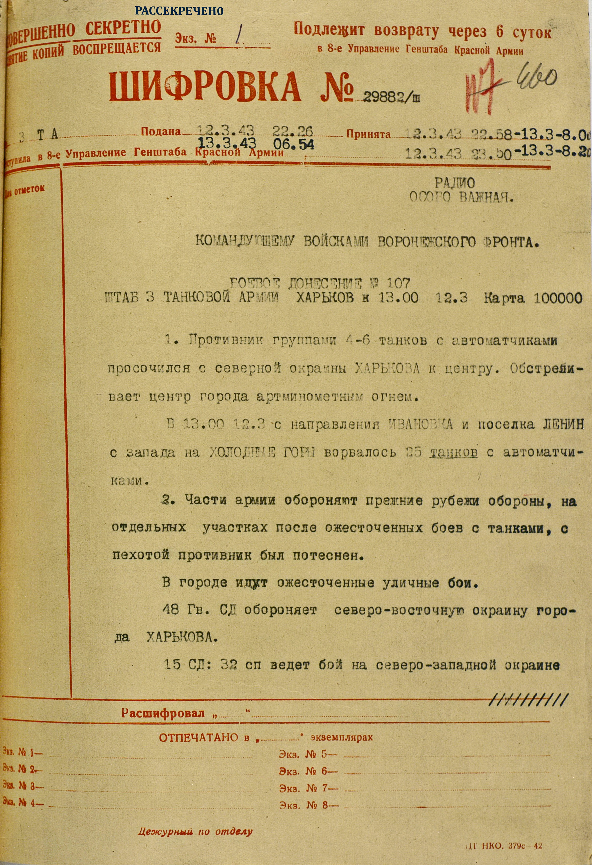 4 марта 4-я танковая армия противника нанесла удар по частям 3-й танковой армии (генерал-лейтенант танковых войск П.С. Рыбалко). В течение двух дней советские войска стойко отражали атаки врага и не позволяли ему прорваться к Харькову с юга. Противник сумел лишь вклиниться в оборону 3-й танковой армии на 6-8 км. Немецкое командование было вынуждено перенести направление главного удара к западу и 6 марта нанесло удар в стык между 69-й (генерал-майор В.Д. Крюченкин) и 3-й танковой армиями. После тяжелых боёв советские войска 69-й и 3-й танковой армий оставили 7 марта Валки, а 9 марта - Люботин.
