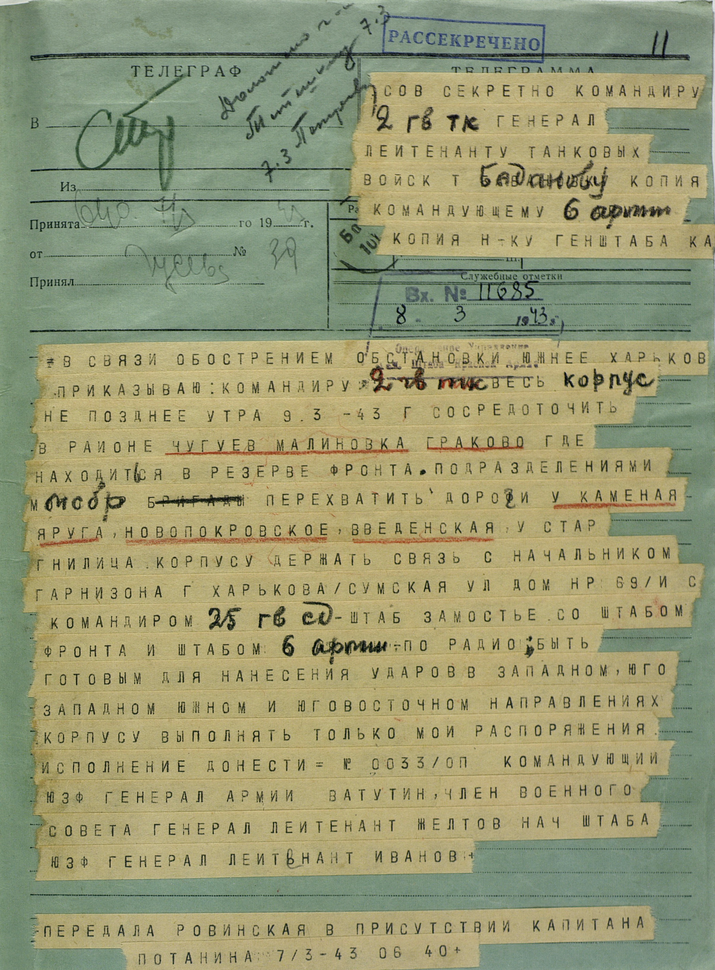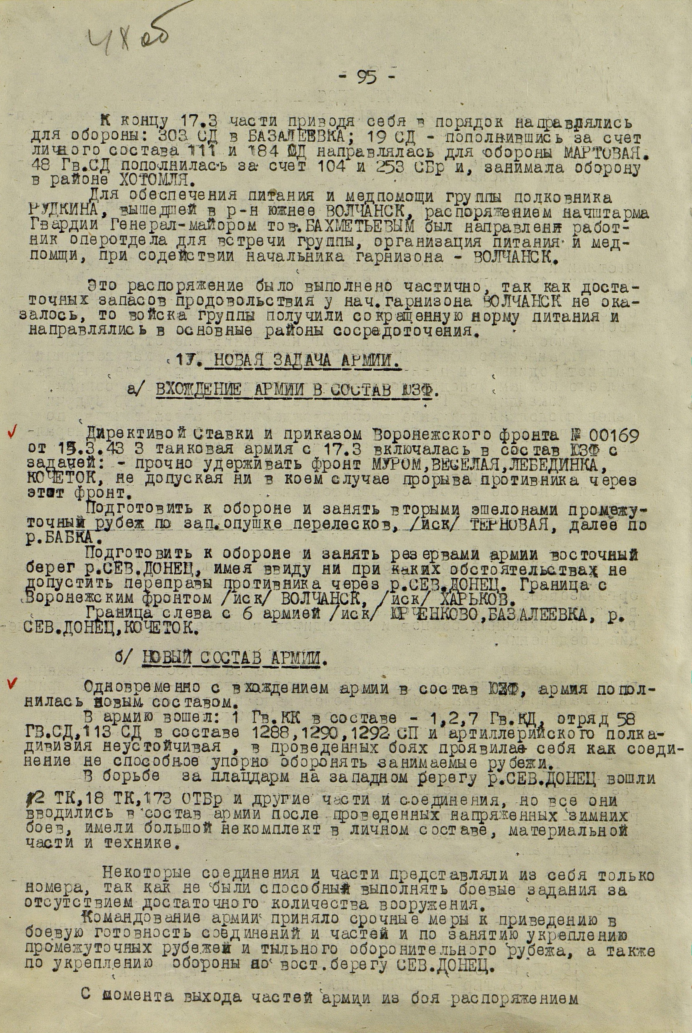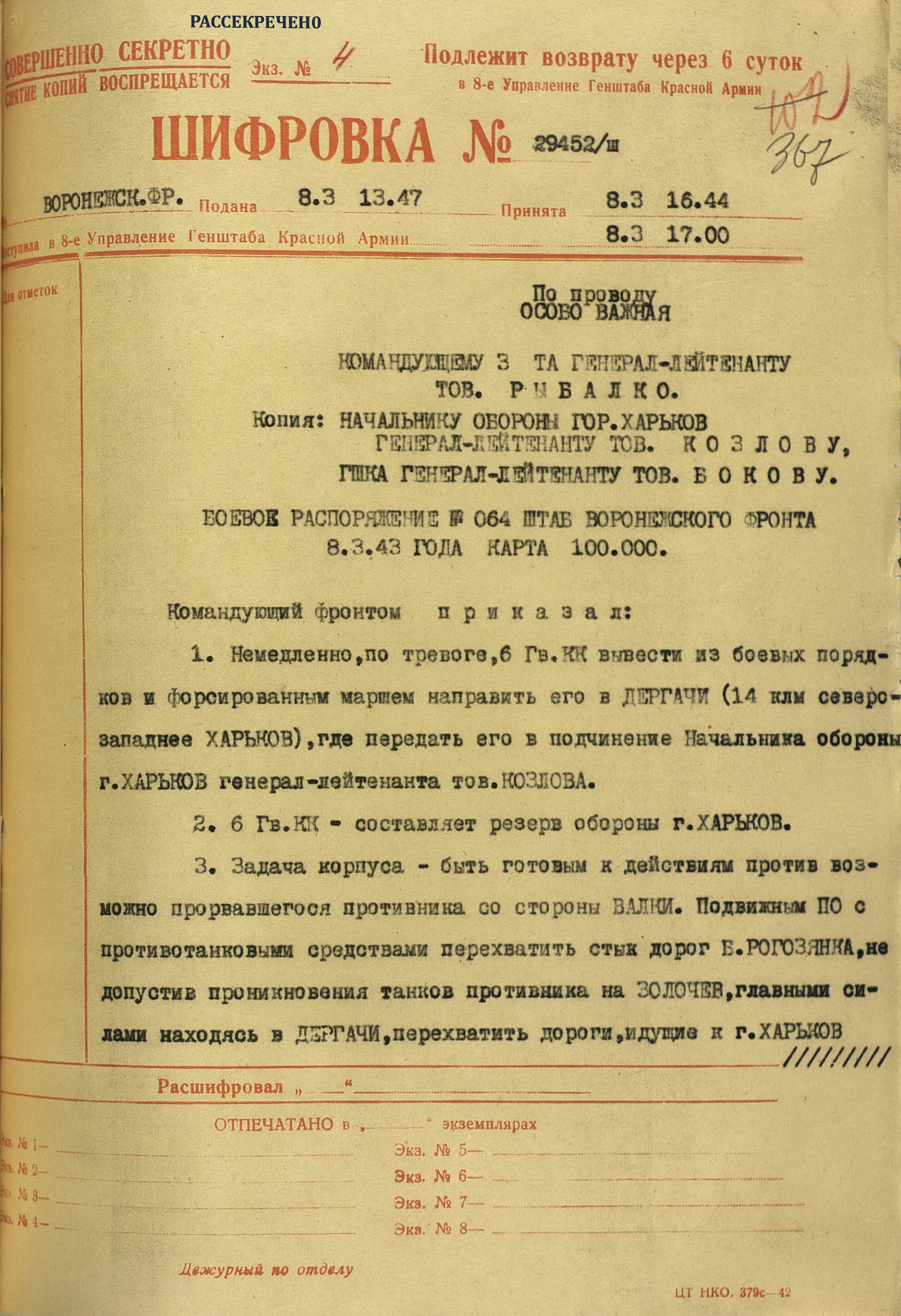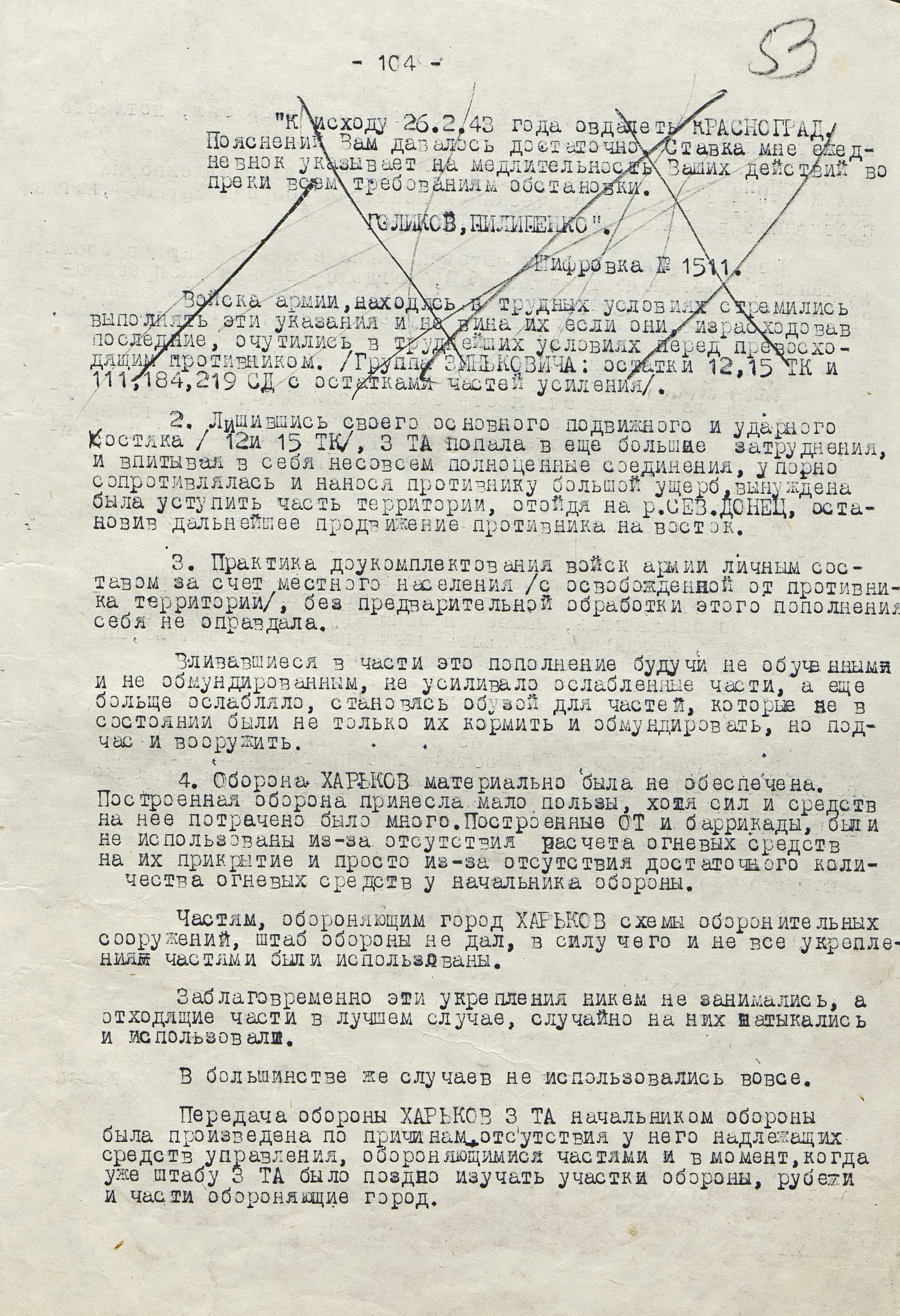 4 марта 4-я танковая армия противника нанесла удар по частям 3-й танковой армии (генерал-лейтенант танковых войск П.С. Рыбалко). В течение двух дней советские войска стойко отражали атаки врага и не позволяли ему прорваться к Харькову с юга. Противник сумел лишь вклиниться в оборону 3-й танковой армии на 6-8 км. Немецкое командование было вынуждено перенести направление главного удара к западу и 6 марта нанесло удар в стык между 69-й (генерал-майор В.Д. Крюченкин) и 3-й танковой армиями. После тяжелых боёв советские войска 69-й и 3-й танковой армий оставили 7 марта Валки, а 9 марта - Люботин.