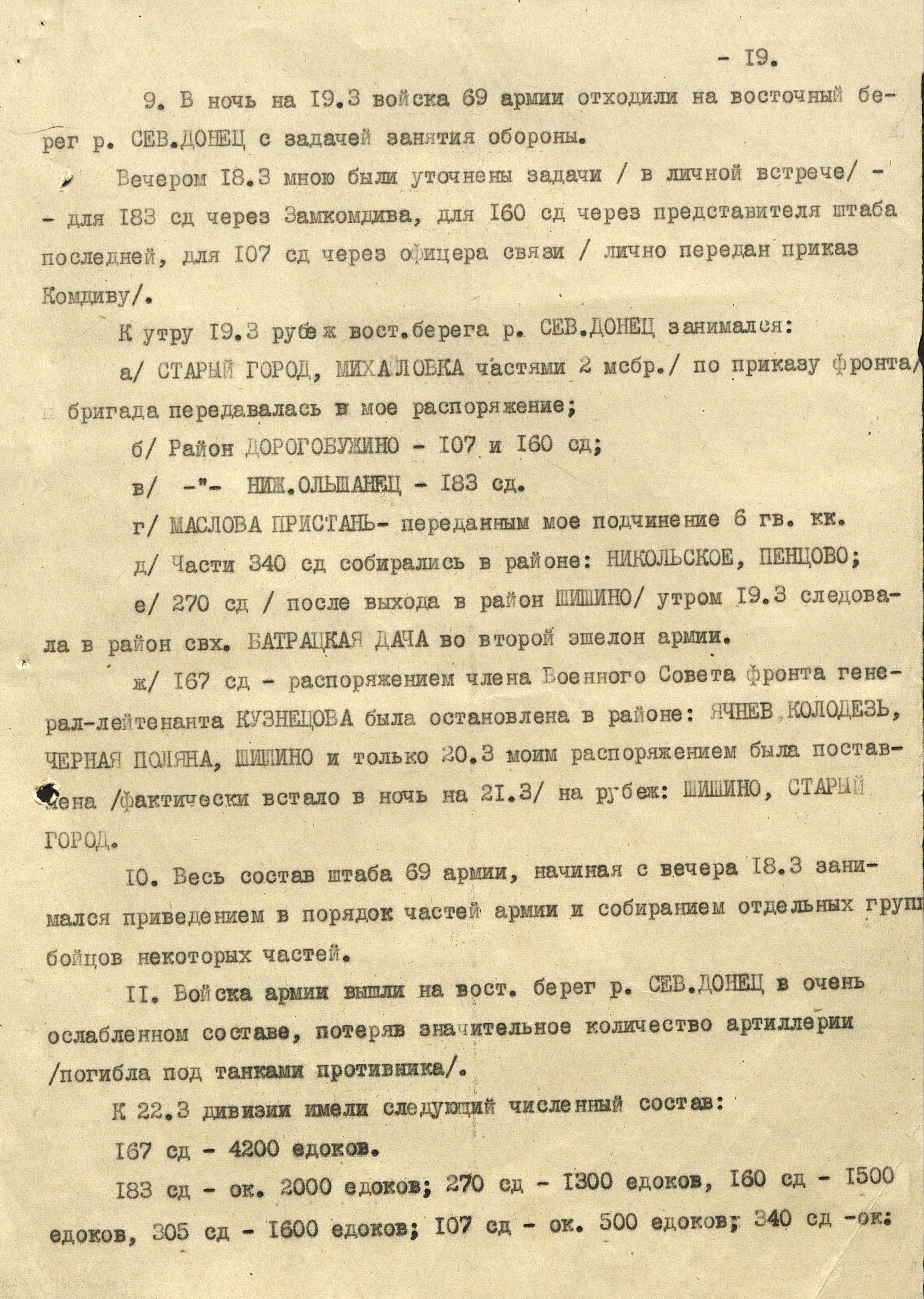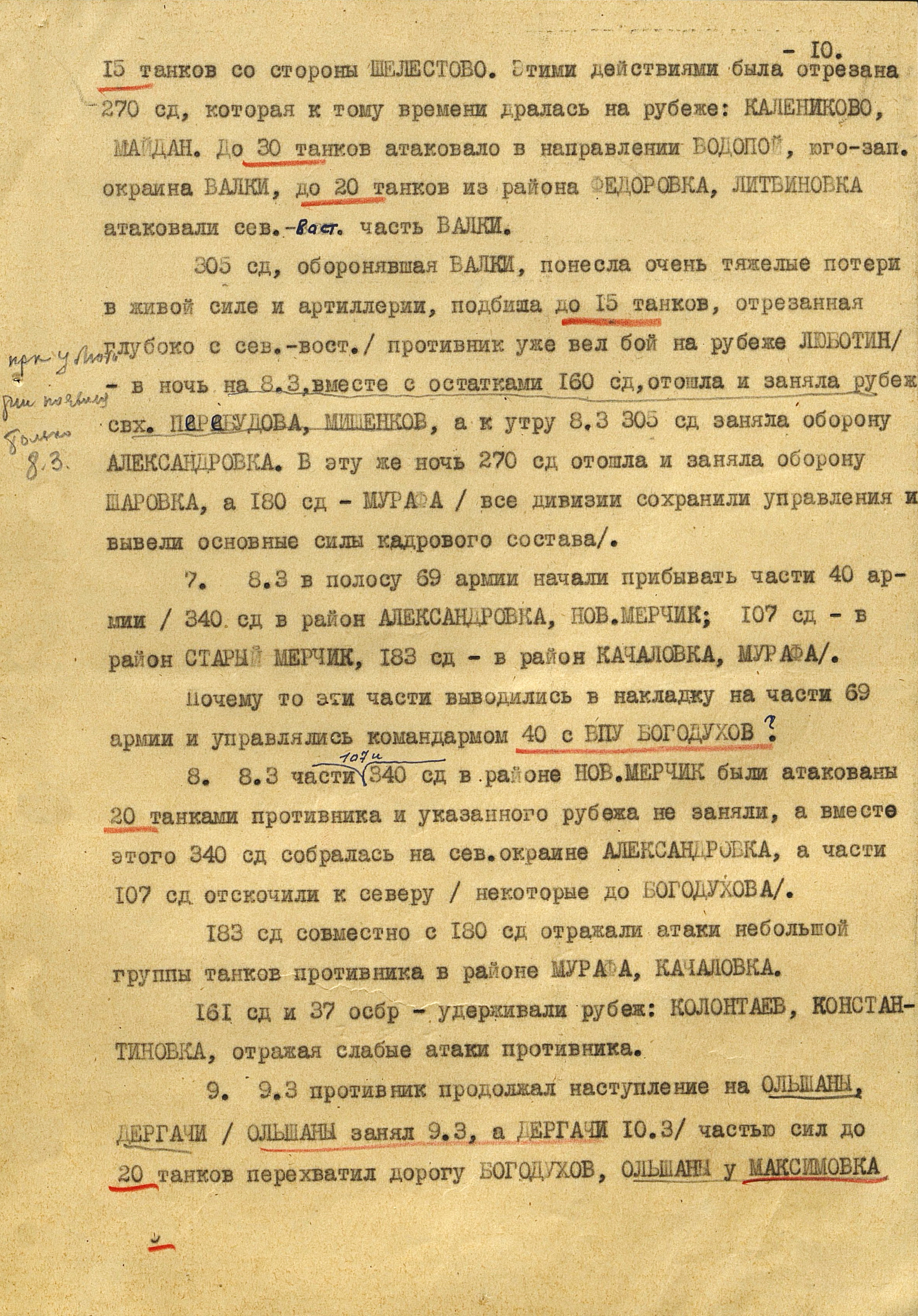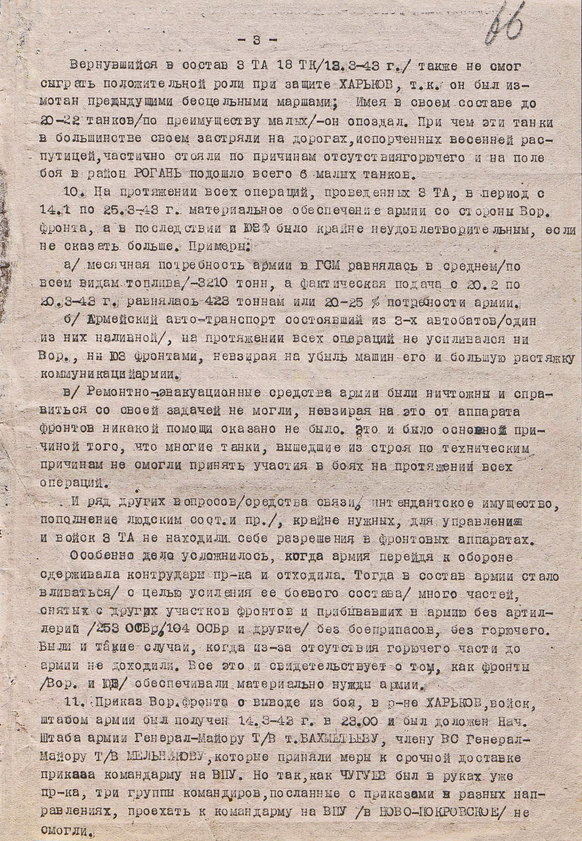 К исходу 9 марта между 69-й и 3-й танковой армиями образовалась 45-км брешь, закрыть которую было нечем. 10 марта противник продолжал наступление при поддержке крупных сил авиации. К исходу дня он подошёл с юга к Богодухову и оказался на окраине Харькова, где 3-я танковая армия заняла оборону. Разрыв между её войсками и 69-й армией увеличился до 60 км. 10 марта советская армия оставила Лебедин, 11 марта - Ахтырку, 13 марта – Мерефу. С 11 по 15 марта соединения 3-й танковой армии вели оборонительный бой на ближних подступах к Харькову и в самом городе с танковым корпусом СС, обходившим его с запада и севера, и 48-й танковый корпус наступавшим на восток южнее Харькова.