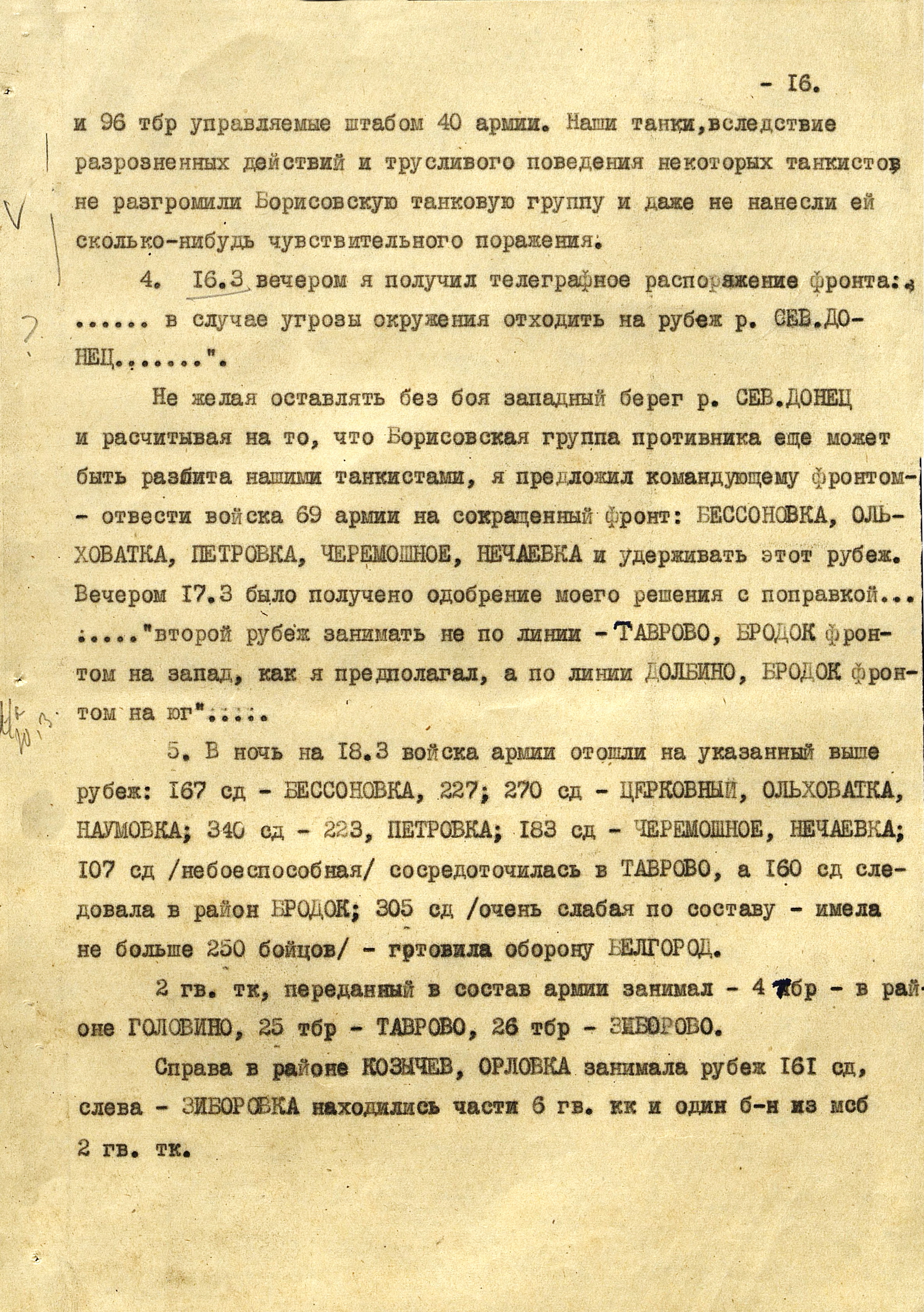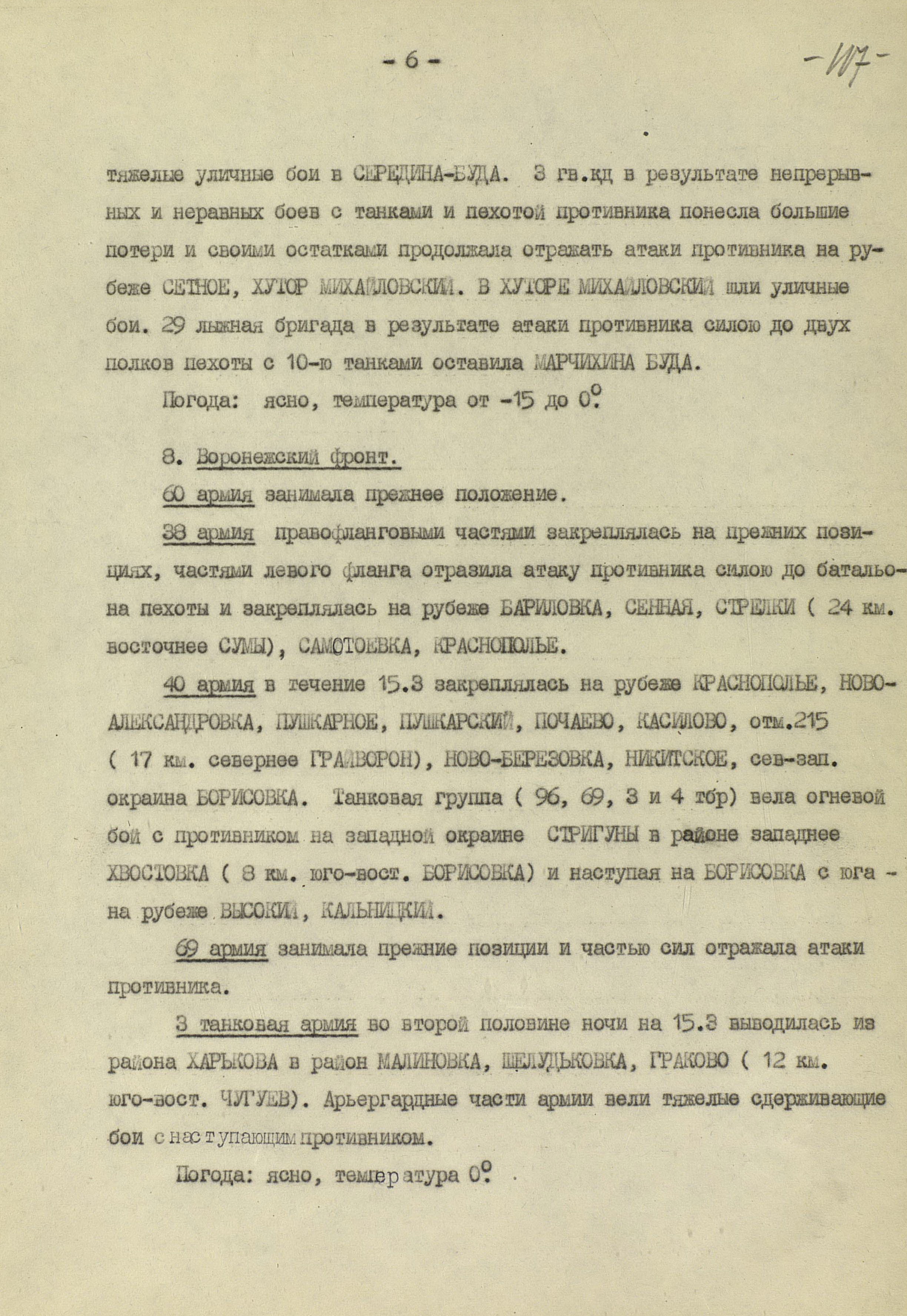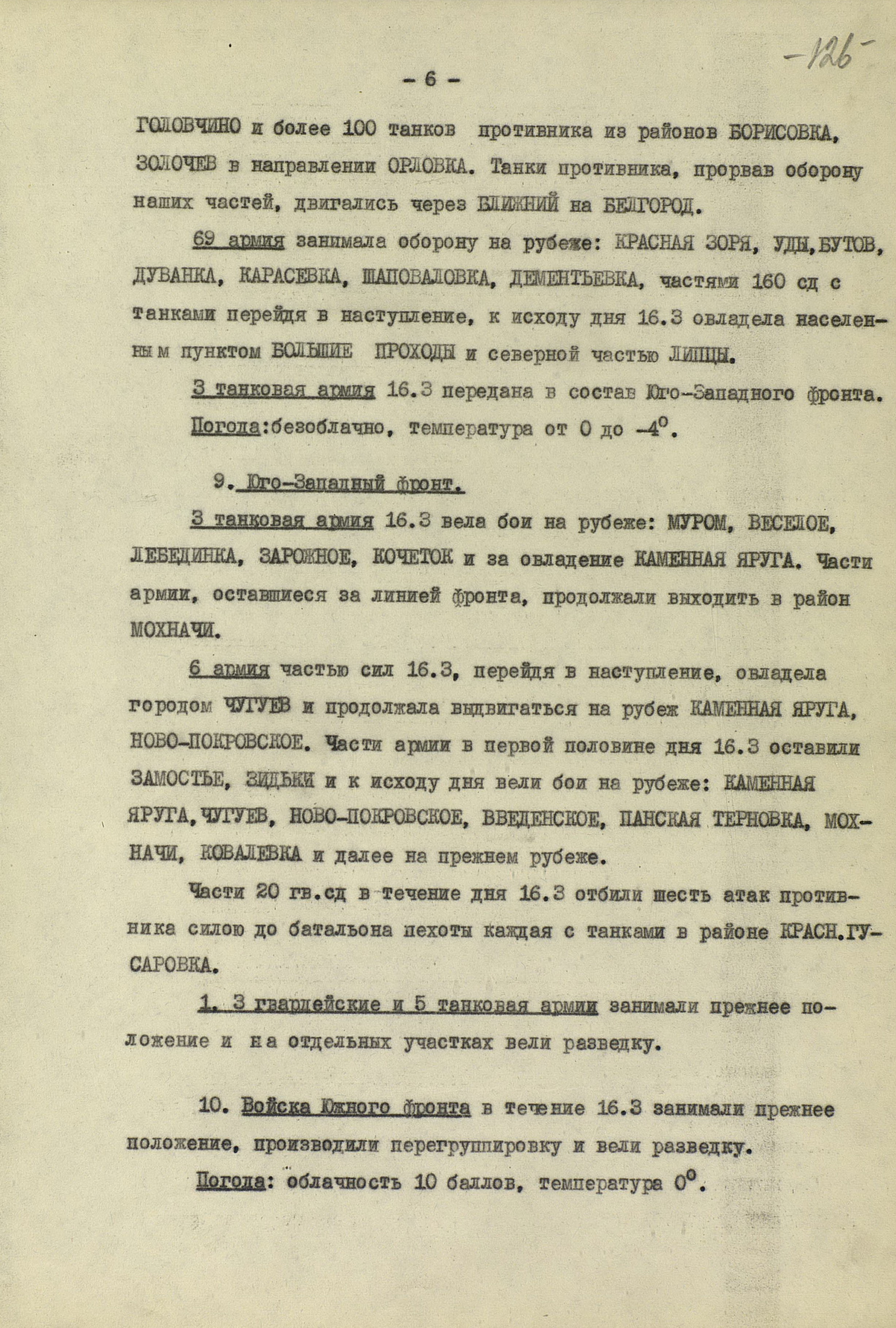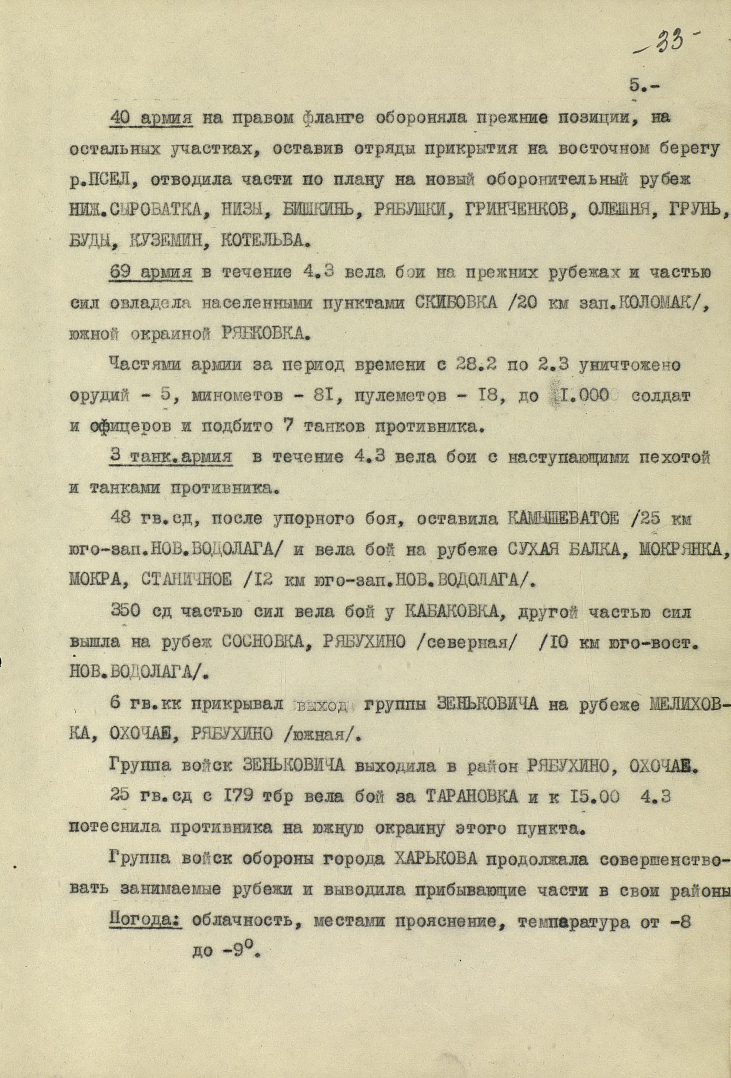 В то время как шли бои за Харьков, соединения 40-й (генерал-лейтенант К.С. Москаленко) и 69-й армий отходили на новый рубеж обороны юго-западнее Белгорода. Развивая наступление, противник 12 марта взял Грайворон, 15 марта – Чугуев, 18 марта - Белгород. Соединения 69-й армии отошли за Северский Донец и, закрепившись на его левом берегу, остановили здесь наступление противника. 40-я армия вследствие охвата противником её левого фланга стала отходить к северу правым флангом на Вязовое, а левым - на Ракитное. Это вынудило левый фланг 38-й армии (генерал-лейтенант Н.Е. Чибисов), оборонявшейся правее, отойти на рубеж Сенная, Краснополье.