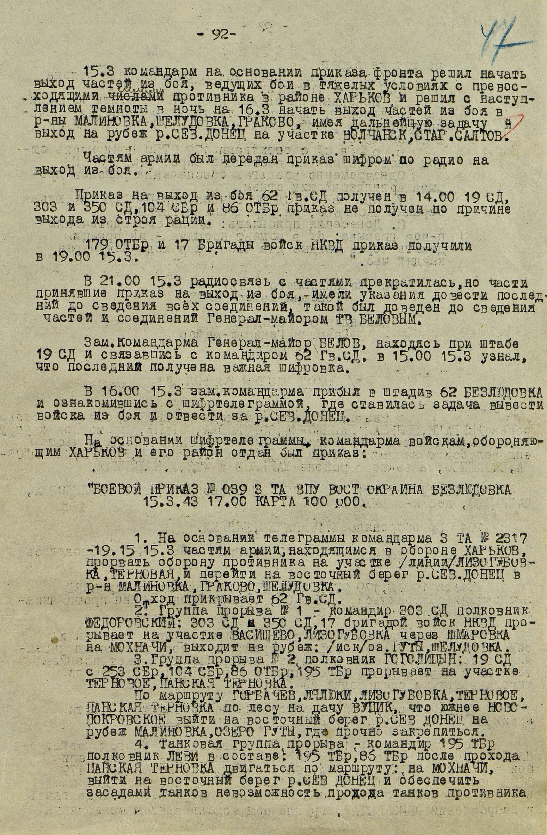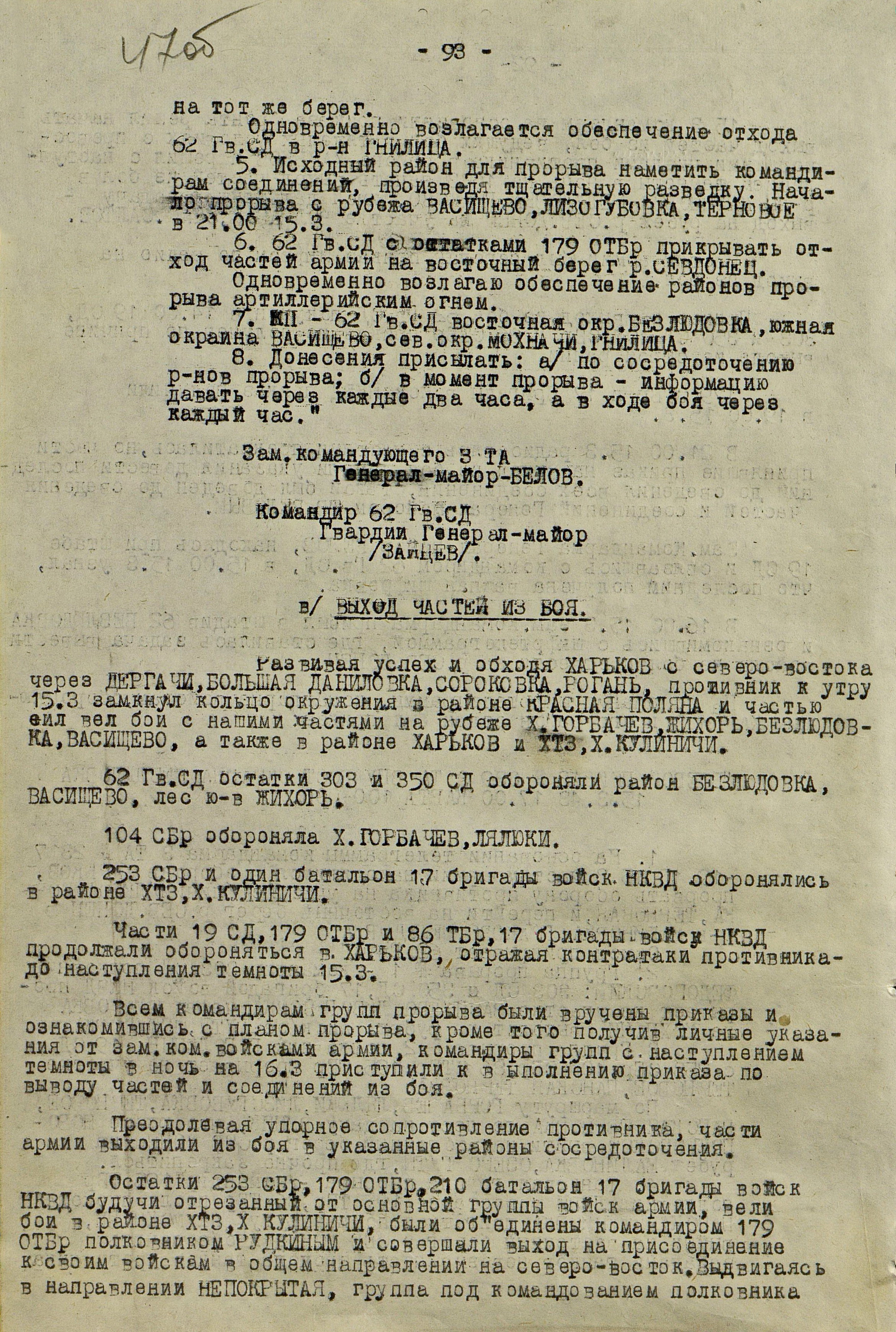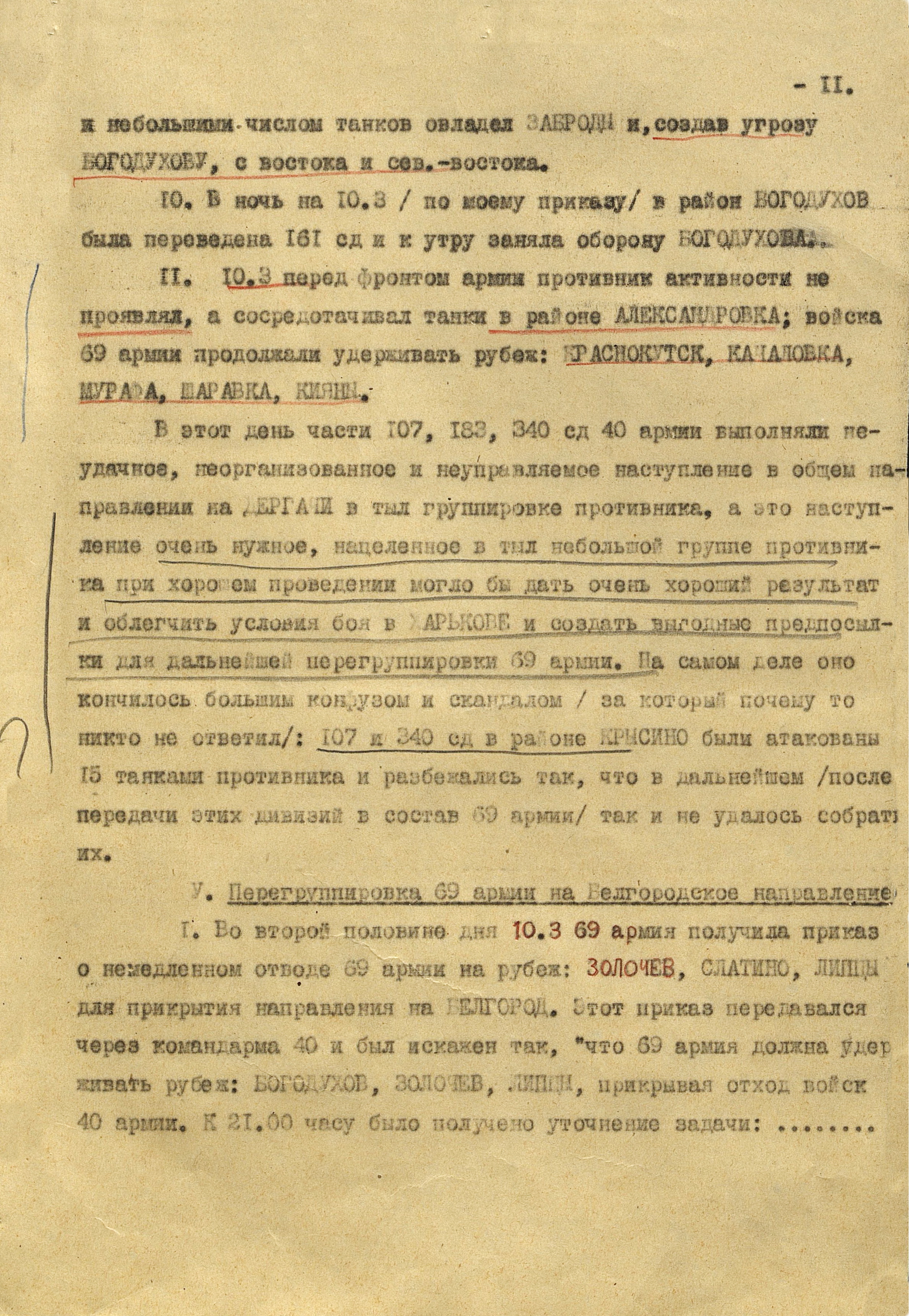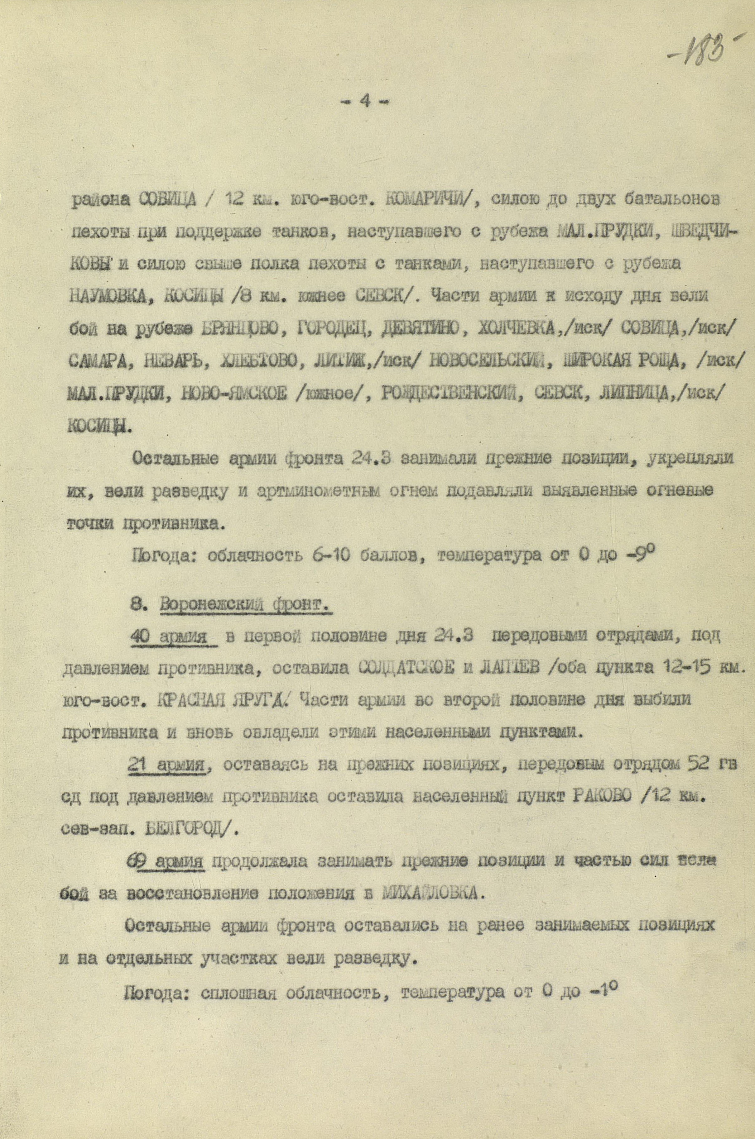 В то время как шли бои за Харьков, соединения 40-й (генерал-лейтенант К.С. Москаленко) и 69-й армий отходили на новый рубеж обороны юго-западнее Белгорода. Развивая наступление, противник 12 марта взял Грайворон, 15 марта – Чугуев, 18 марта - Белгород. Соединения 69-й армии отошли за Северский Донец и, закрепившись на его левом берегу, остановили здесь наступление противника. 40-я армия вследствие охвата противником её левого фланга стала отходить к северу правым флангом на Вязовое, а левым - на Ракитное. Это вынудило левый фланг 38-й армии (генерал-лейтенант Н.Е. Чибисов), оборонявшейся правее, отойти на рубеж Сенная, Краснополье.