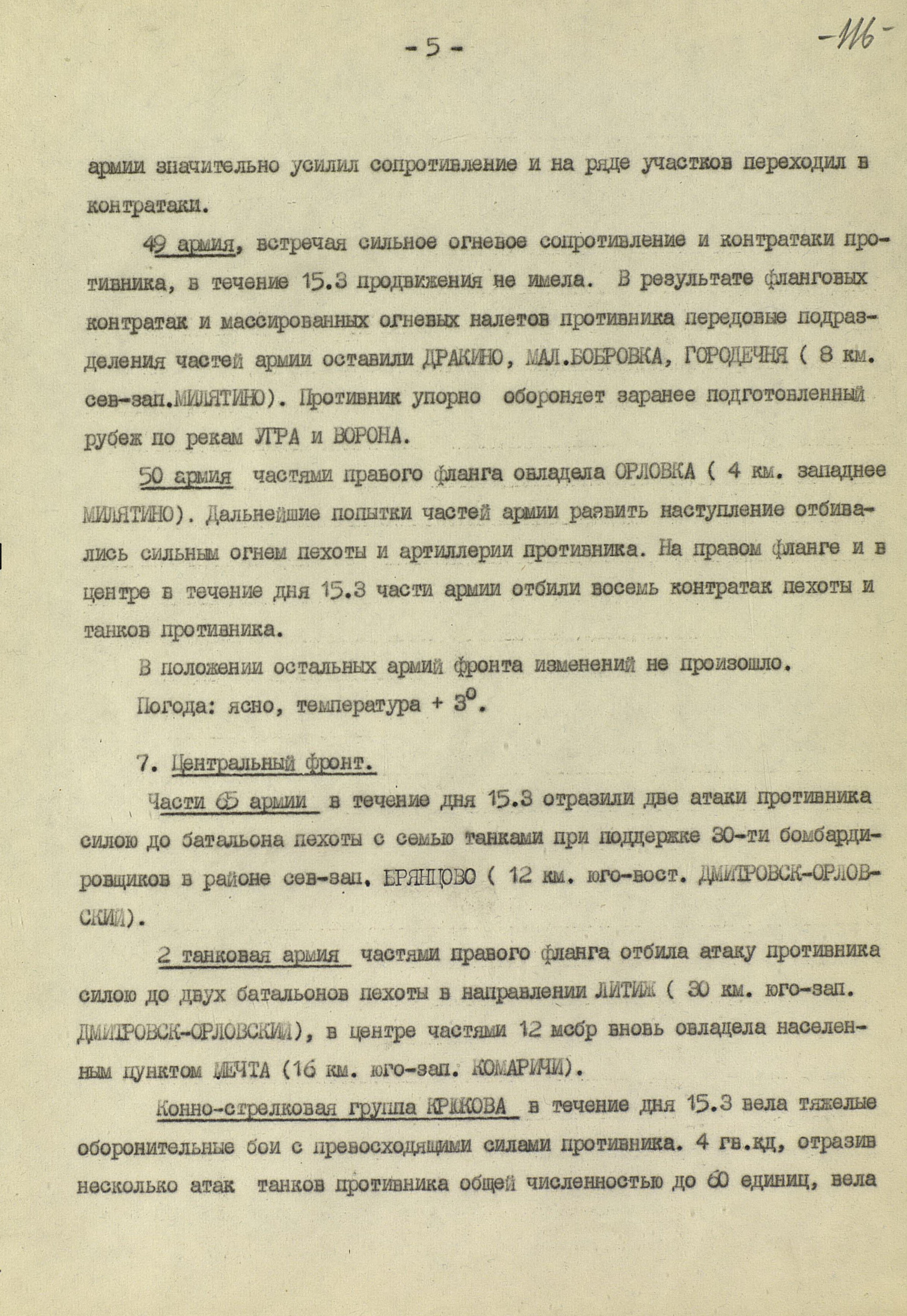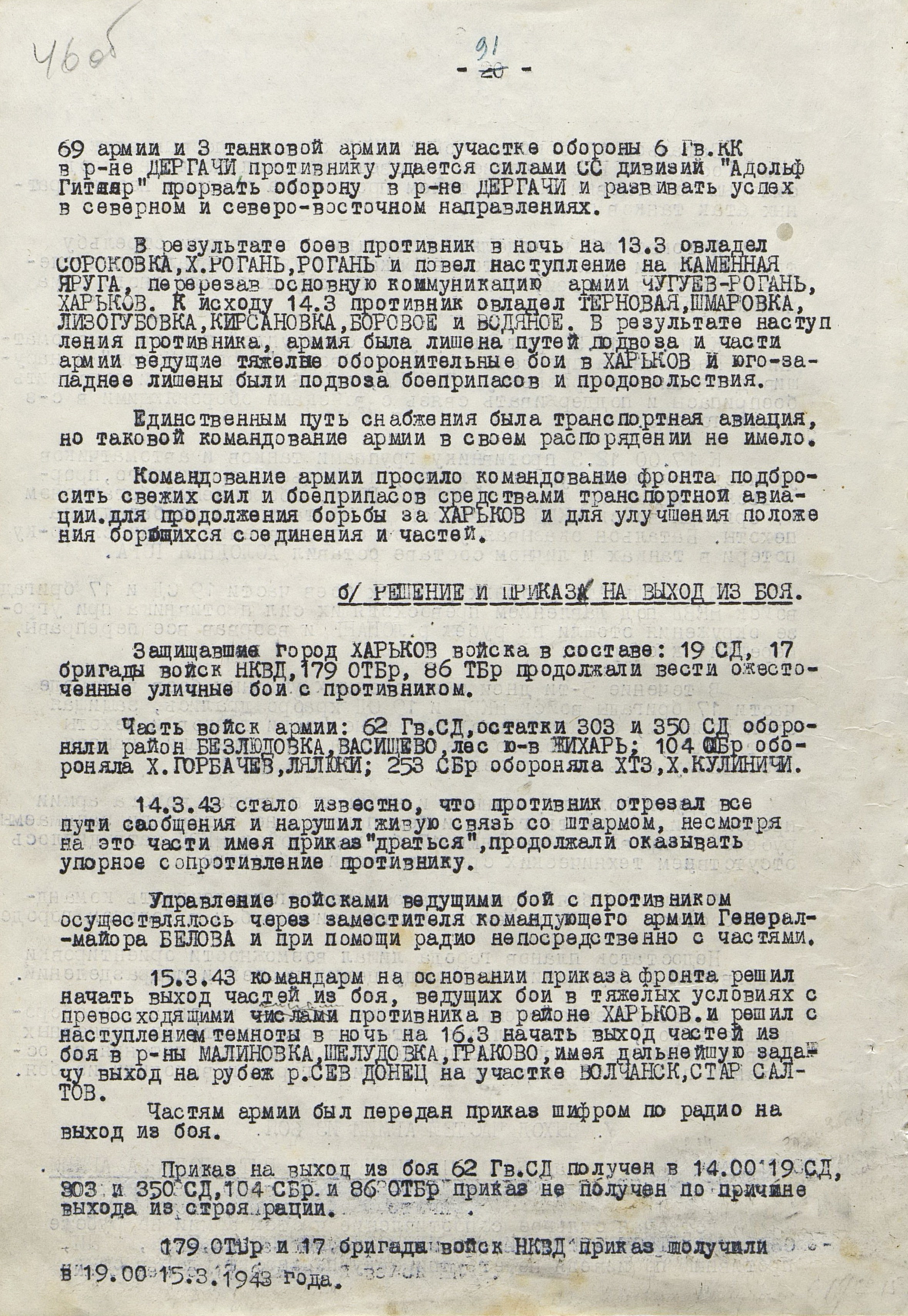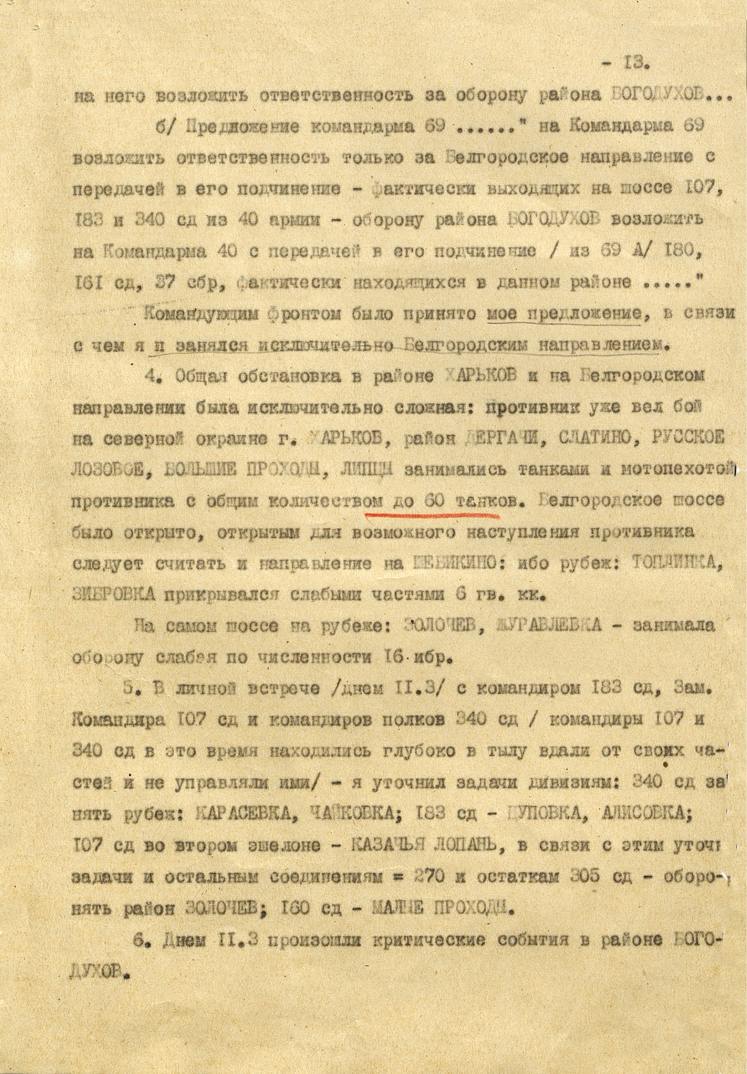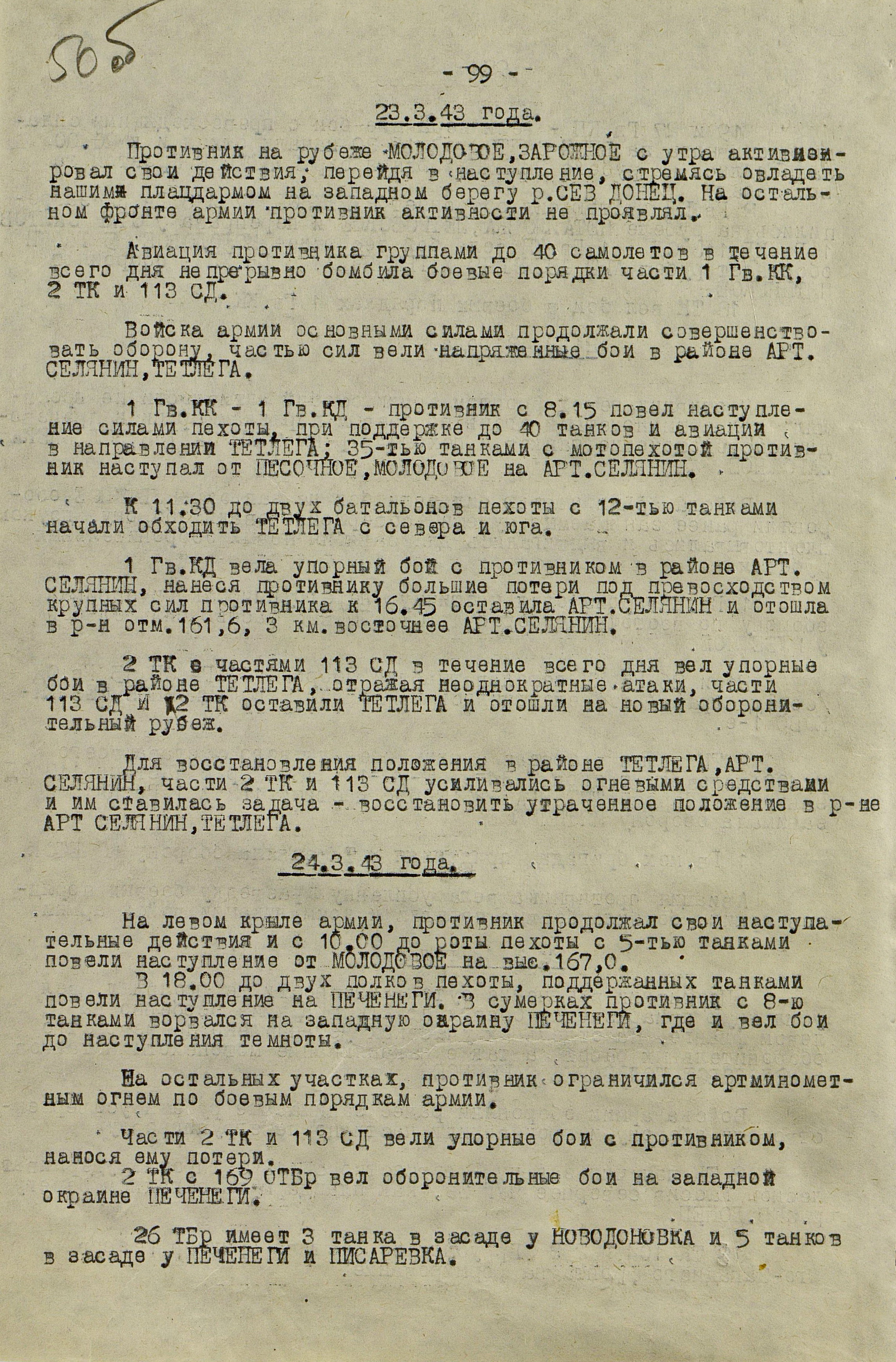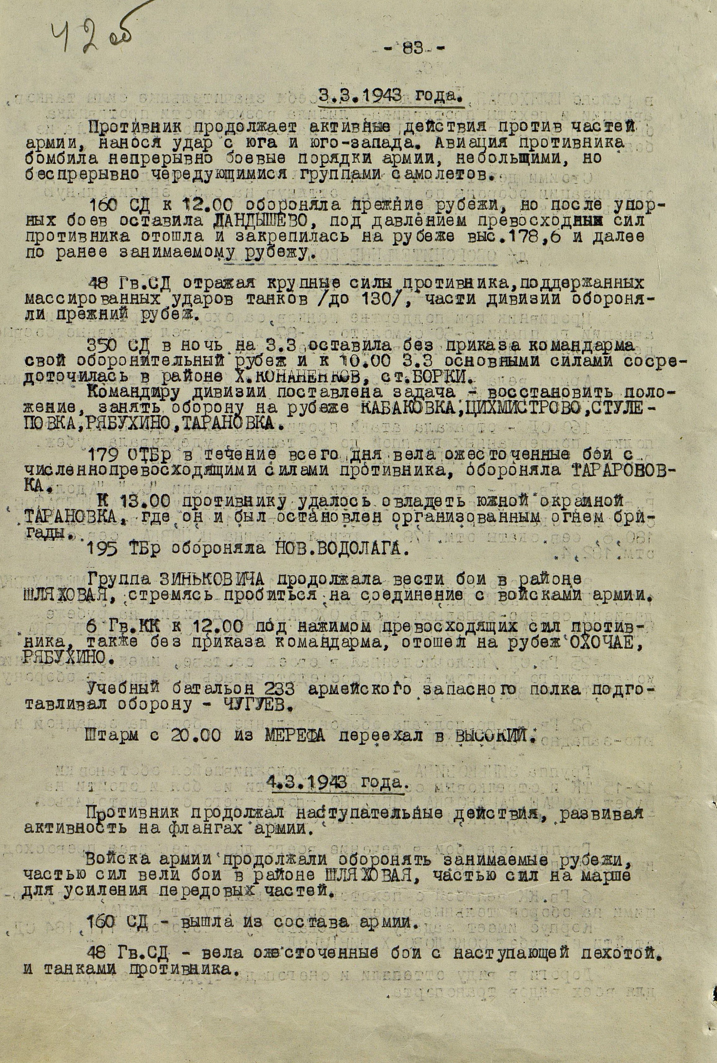 В то время как шли бои за Харьков, соединения 40-й (генерал-лейтенант К.С. Москаленко) и 69-й армий отходили на новый рубеж обороны юго-западнее Белгорода. Развивая наступление, противник 12 марта взял Грайворон, 15 марта – Чугуев, 18 марта - Белгород. Соединения 69-й армии отошли за Северский Донец и, закрепившись на его левом берегу, остановили здесь наступление противника. 40-я армия вследствие охвата противником её левого фланга стала отходить к северу правым флангом на Вязовое, а левым - на Ракитное. Это вынудило левый фланг 38-й армии (генерал-лейтенант Н.Е. Чибисов), оборонявшейся правее, отойти на рубеж Сенная, Краснополье.