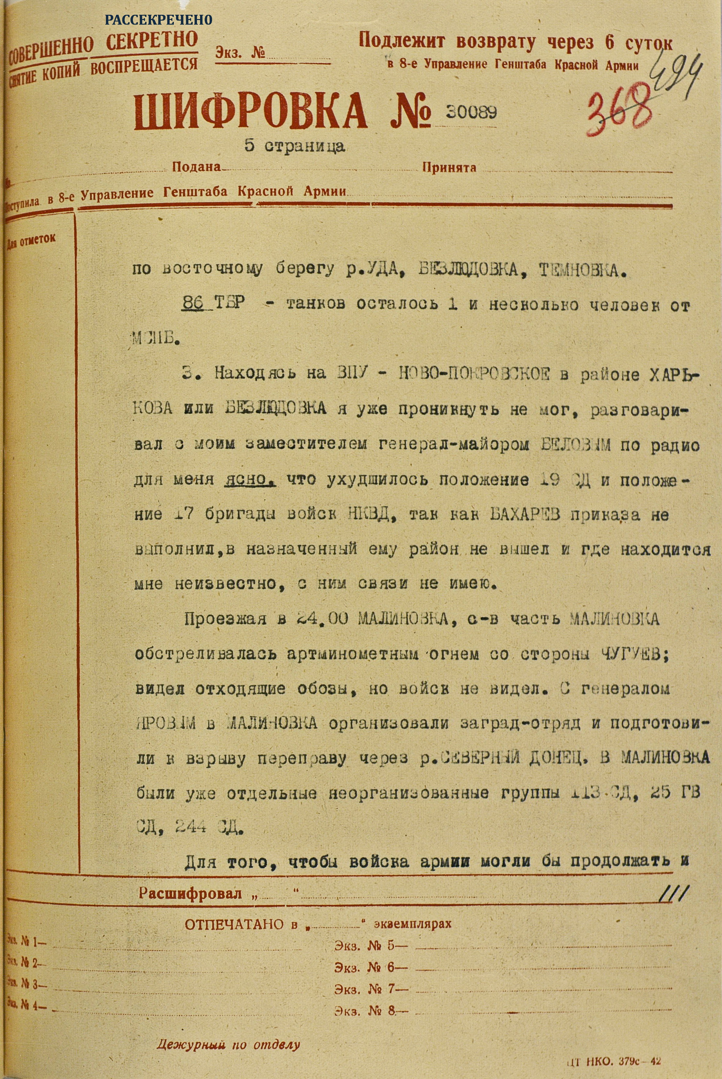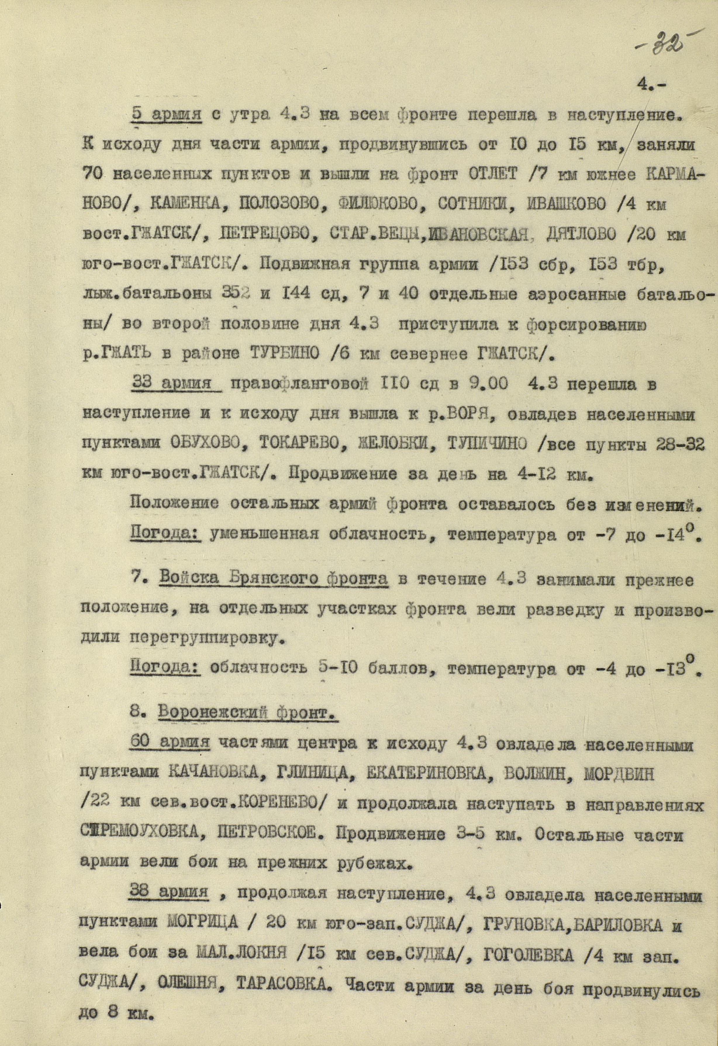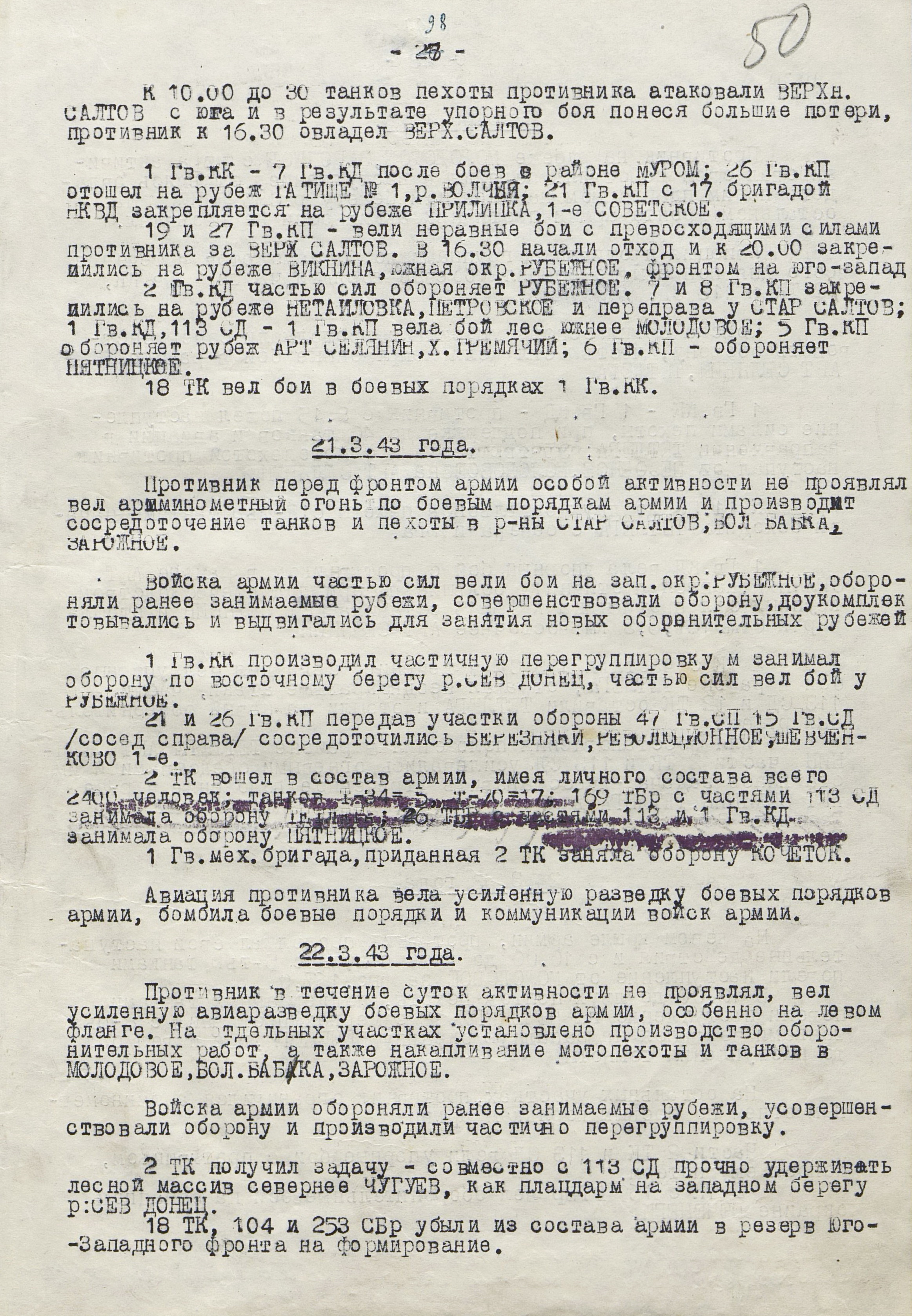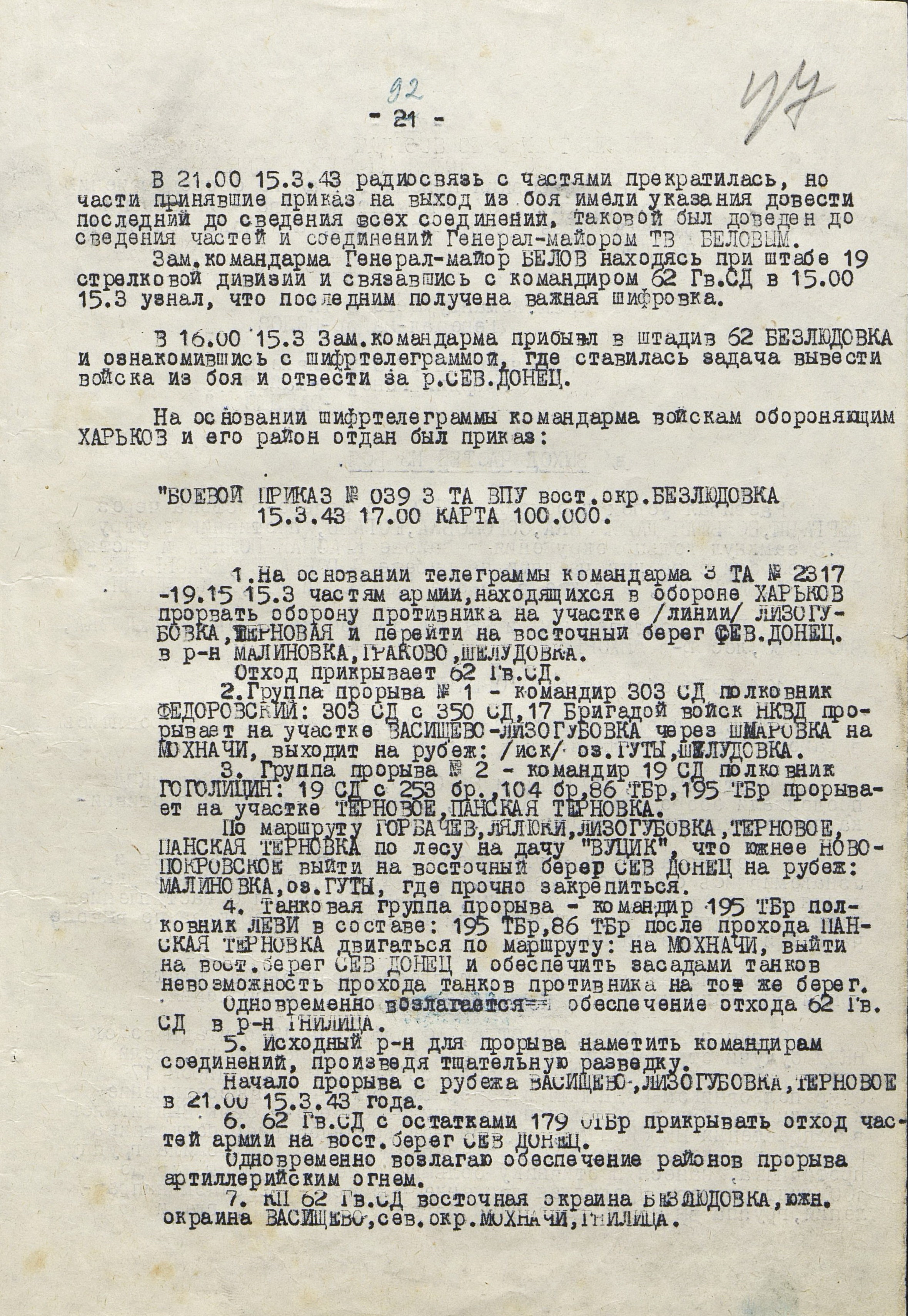 В то время как шли бои за Харьков, соединения 40-й (генерал-лейтенант К.С. Москаленко) и 69-й армий отходили на новый рубеж обороны юго-западнее Белгорода. Развивая наступление, противник 12 марта взял Грайворон, 15 марта – Чугуев, 18 марта - Белгород. Соединения 69-й армии отошли за Северский Донец и, закрепившись на его левом берегу, остановили здесь наступление противника. 40-я армия вследствие охвата противником её левого фланга стала отходить к северу правым флангом на Вязовое, а левым - на Ракитное. Это вынудило левый фланг 38-й армии (генерал-лейтенант Н.Е. Чибисов), оборонявшейся правее, отойти на рубеж Сенная, Краснополье.