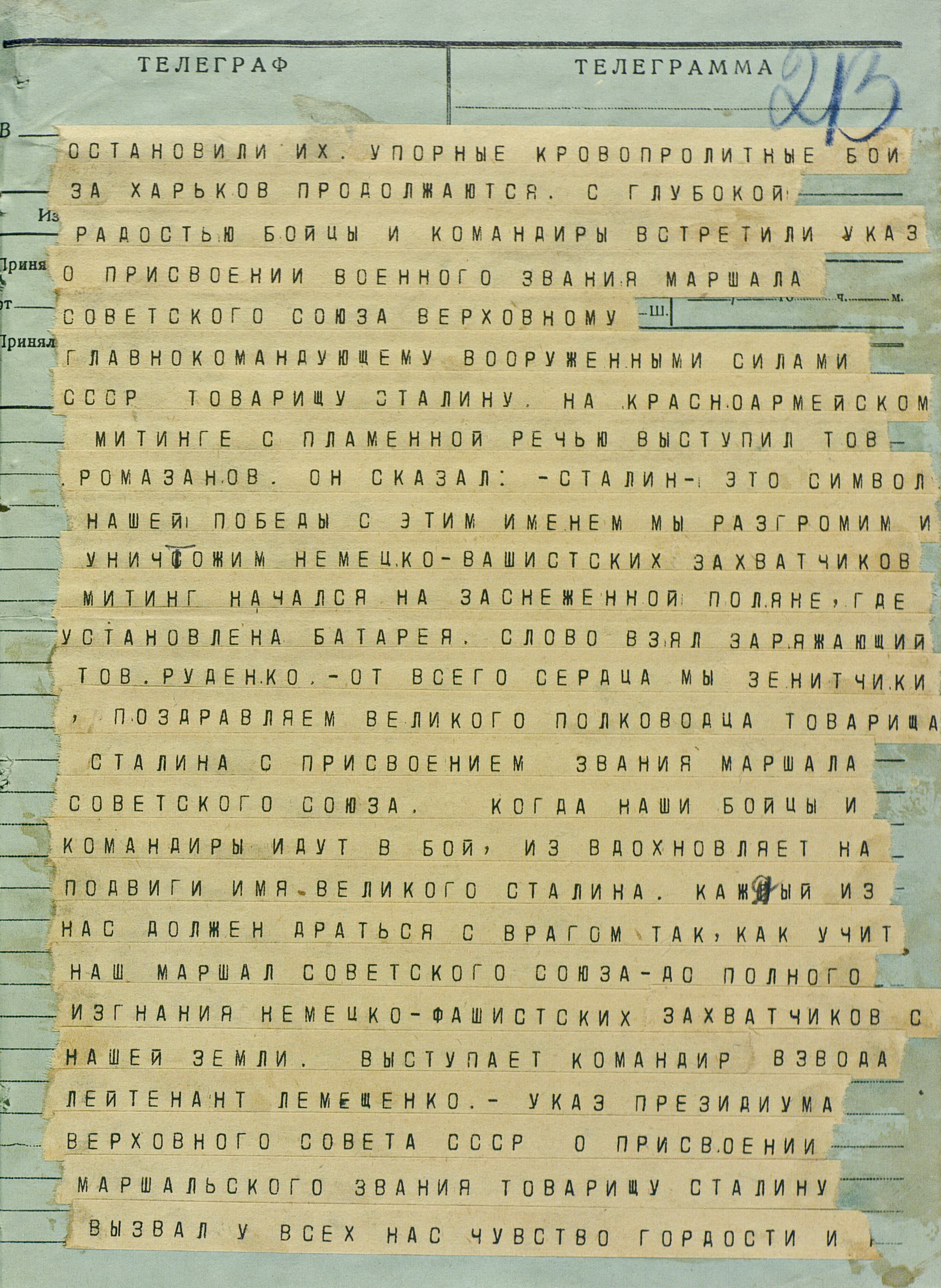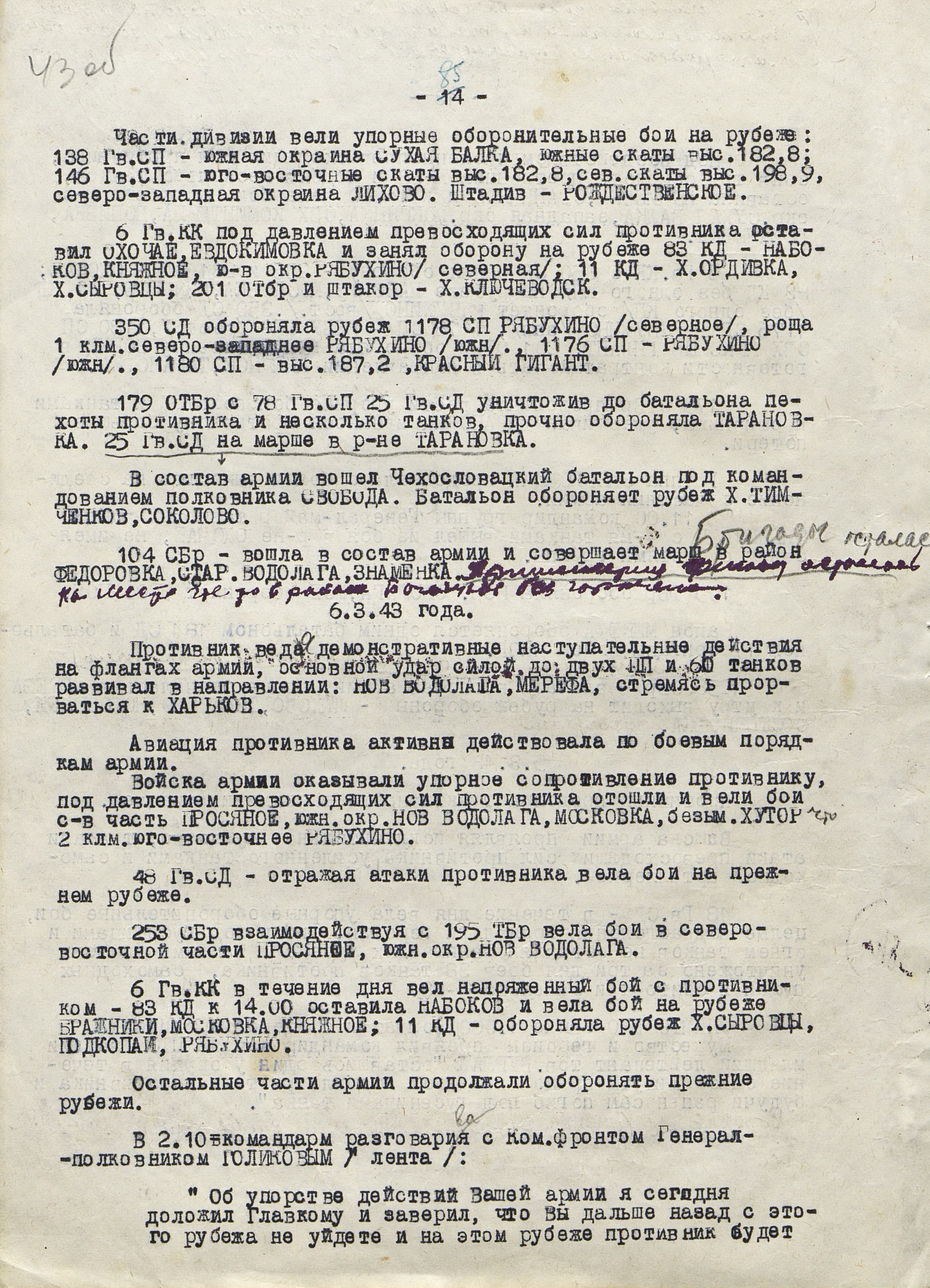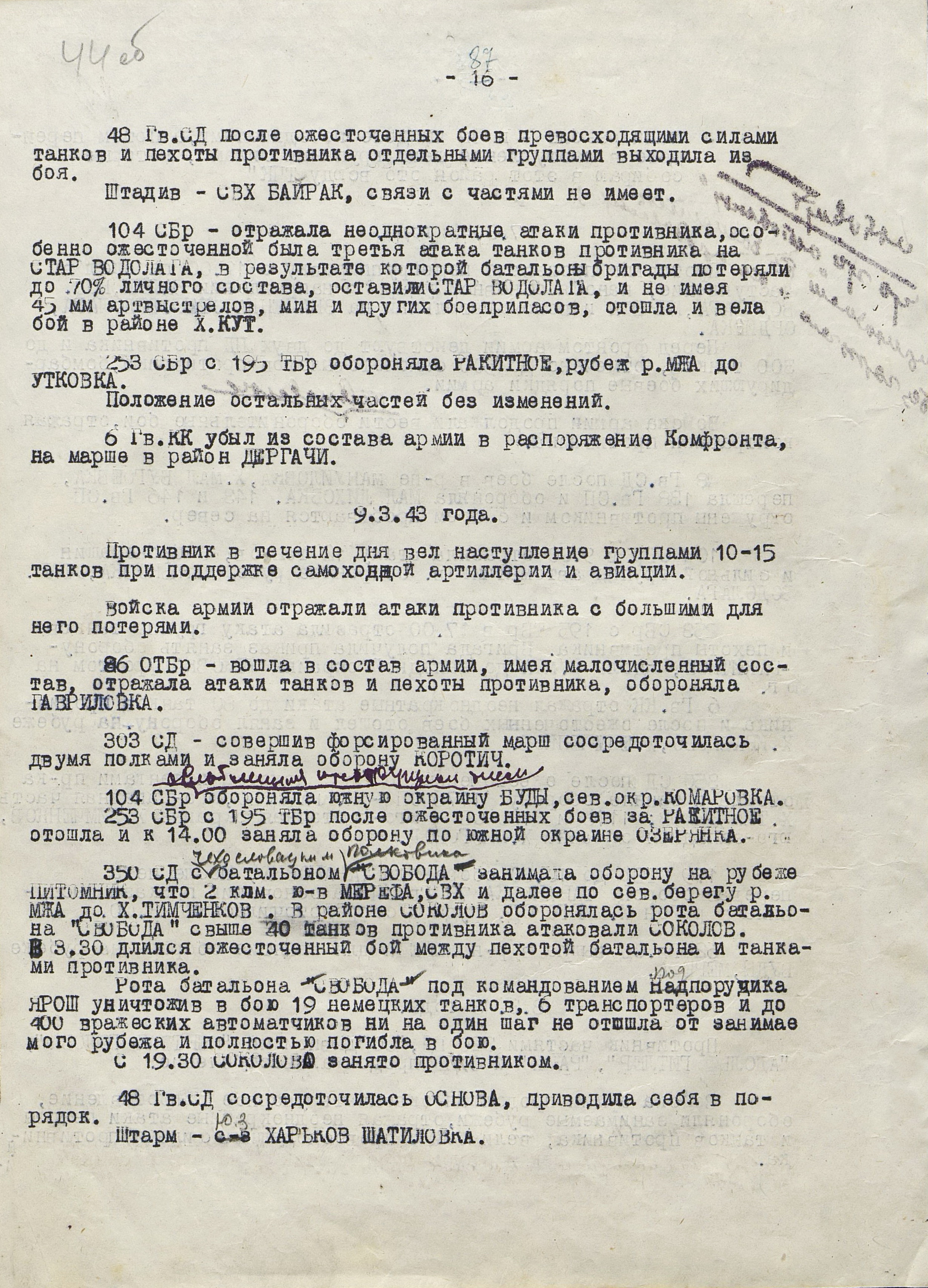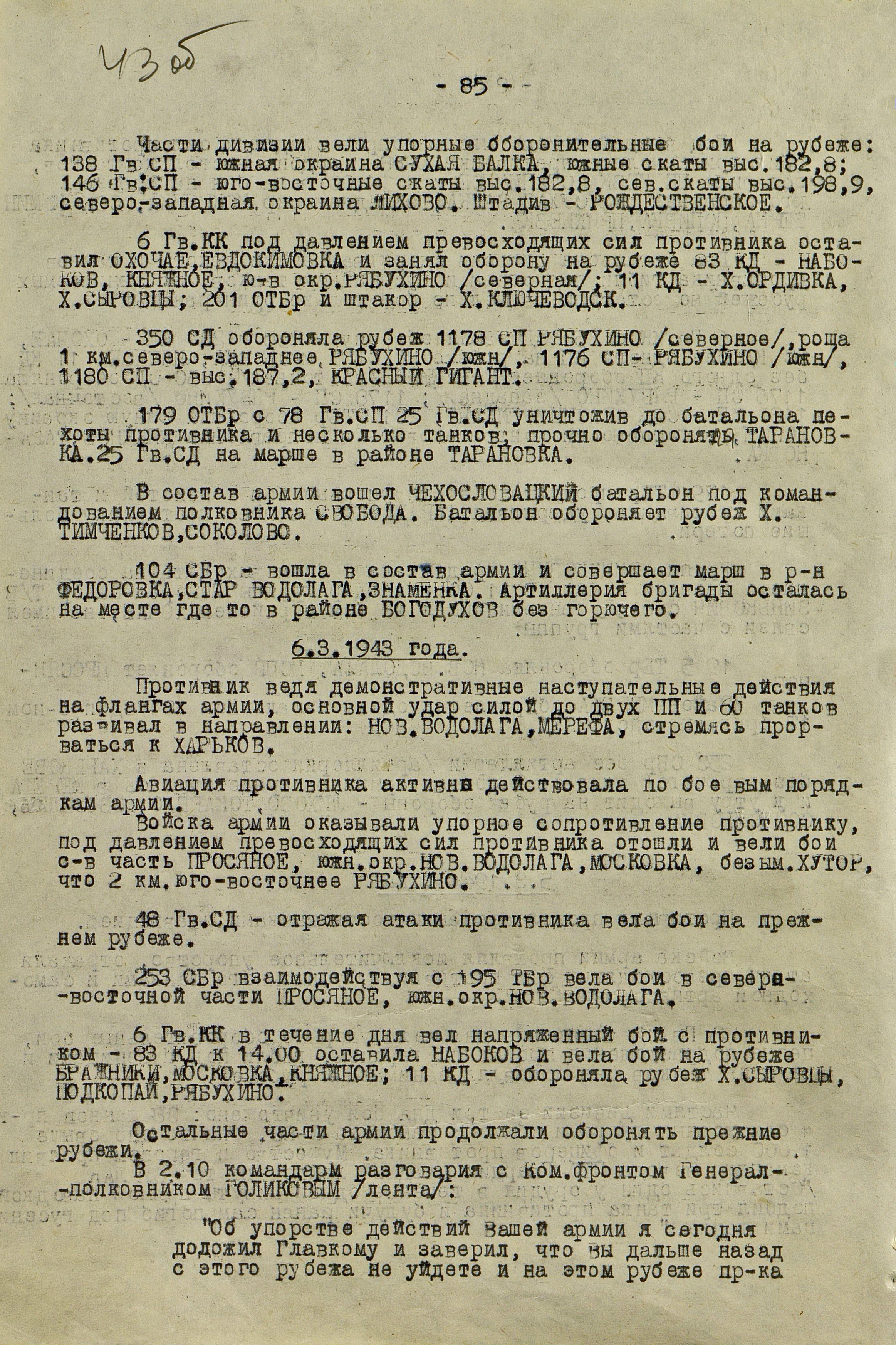 По приказу Ставки ВГК для содействия войскам Воронежского фронта 9 марта командующий Юго-Западным фронтом (генерал армии Н.Ф. Ватутин) нанёс контрудар силами 6-й армии (генерал-лейтенант Ф.М. Харитонов) из района Змиева в направлении на Н. Водолагу во фланг войскам противника, наступавшим на Харьков. Однако в силу своей слабости этот удар не дал ожидаемых результатов.