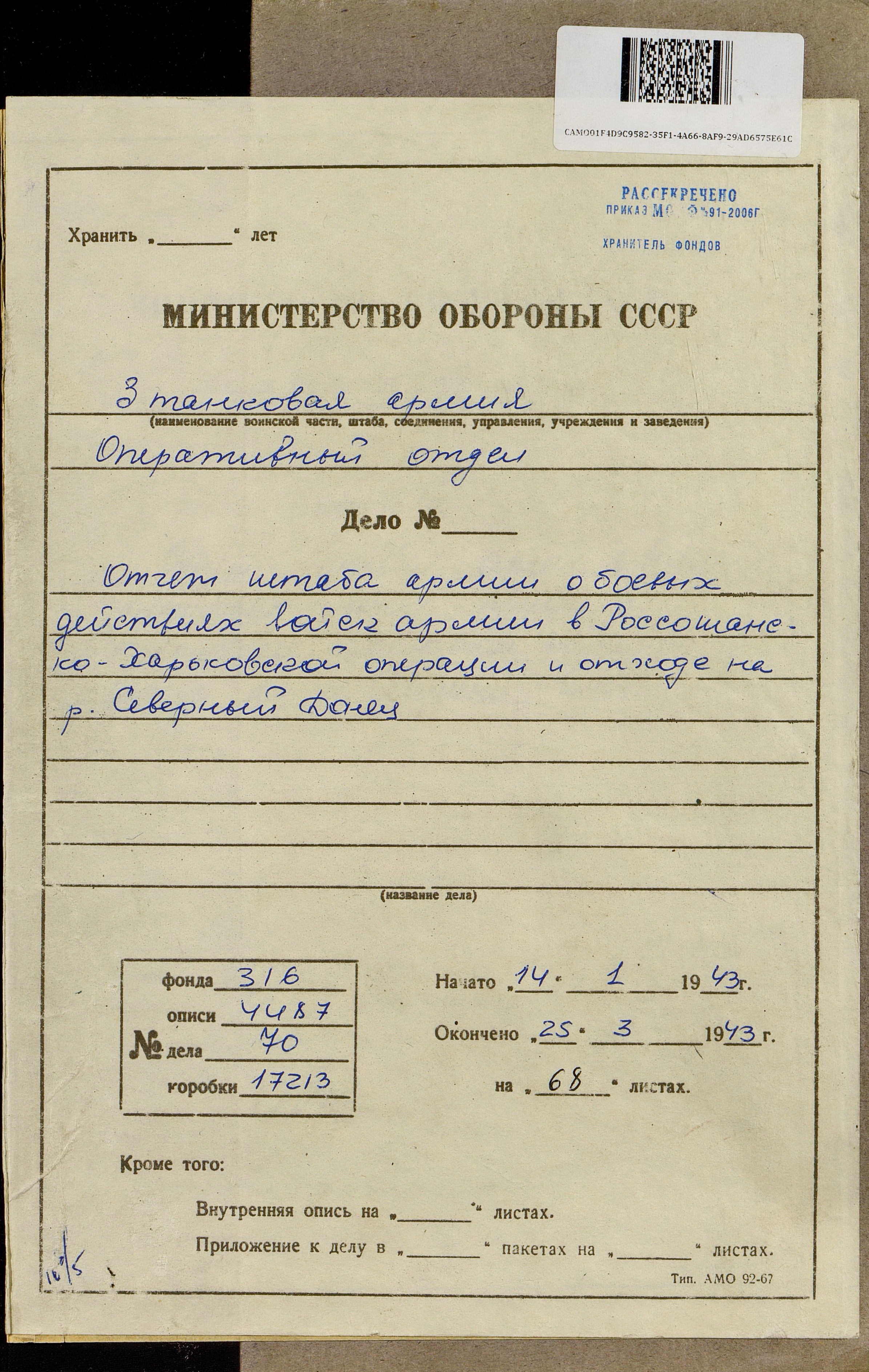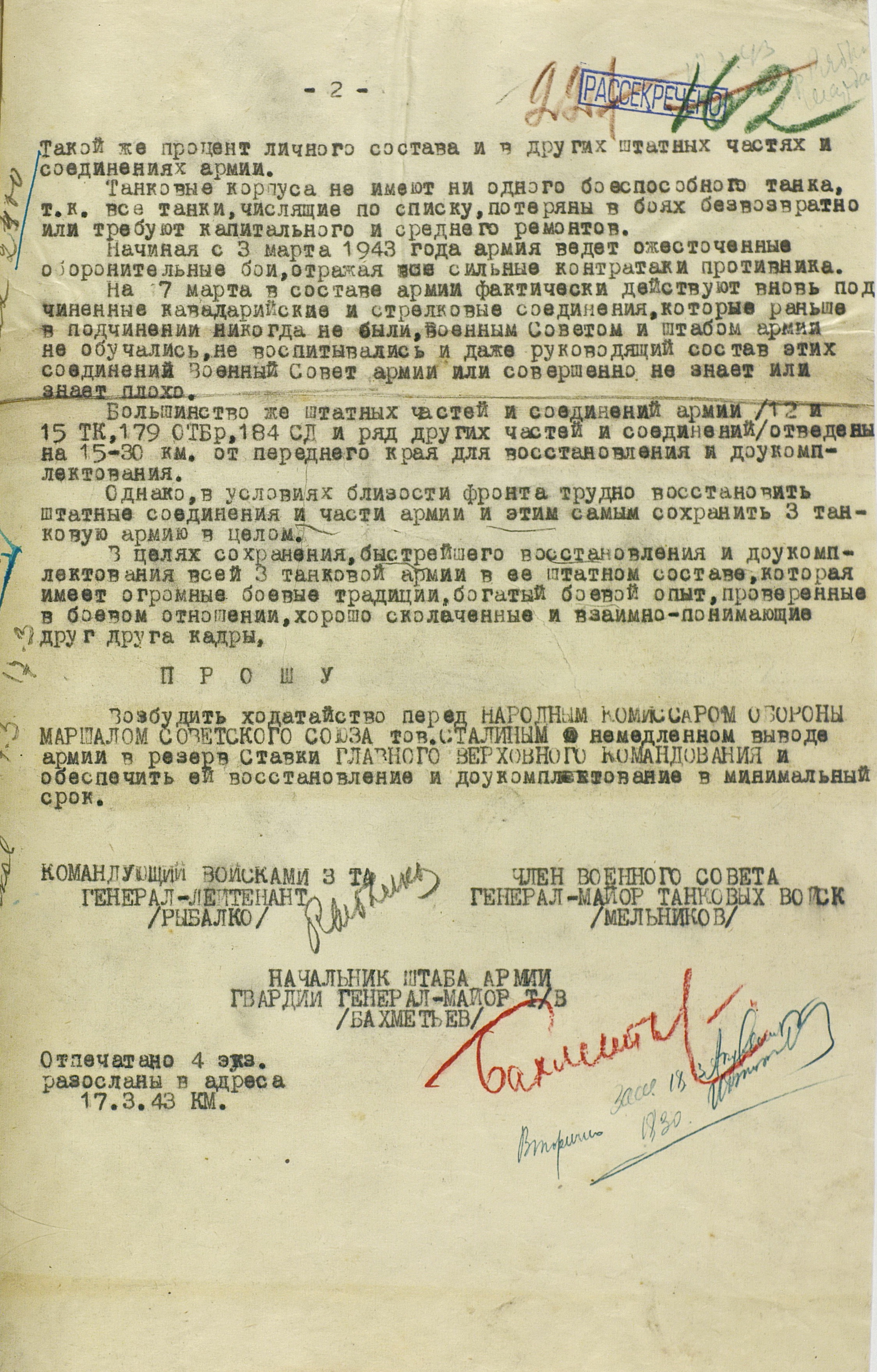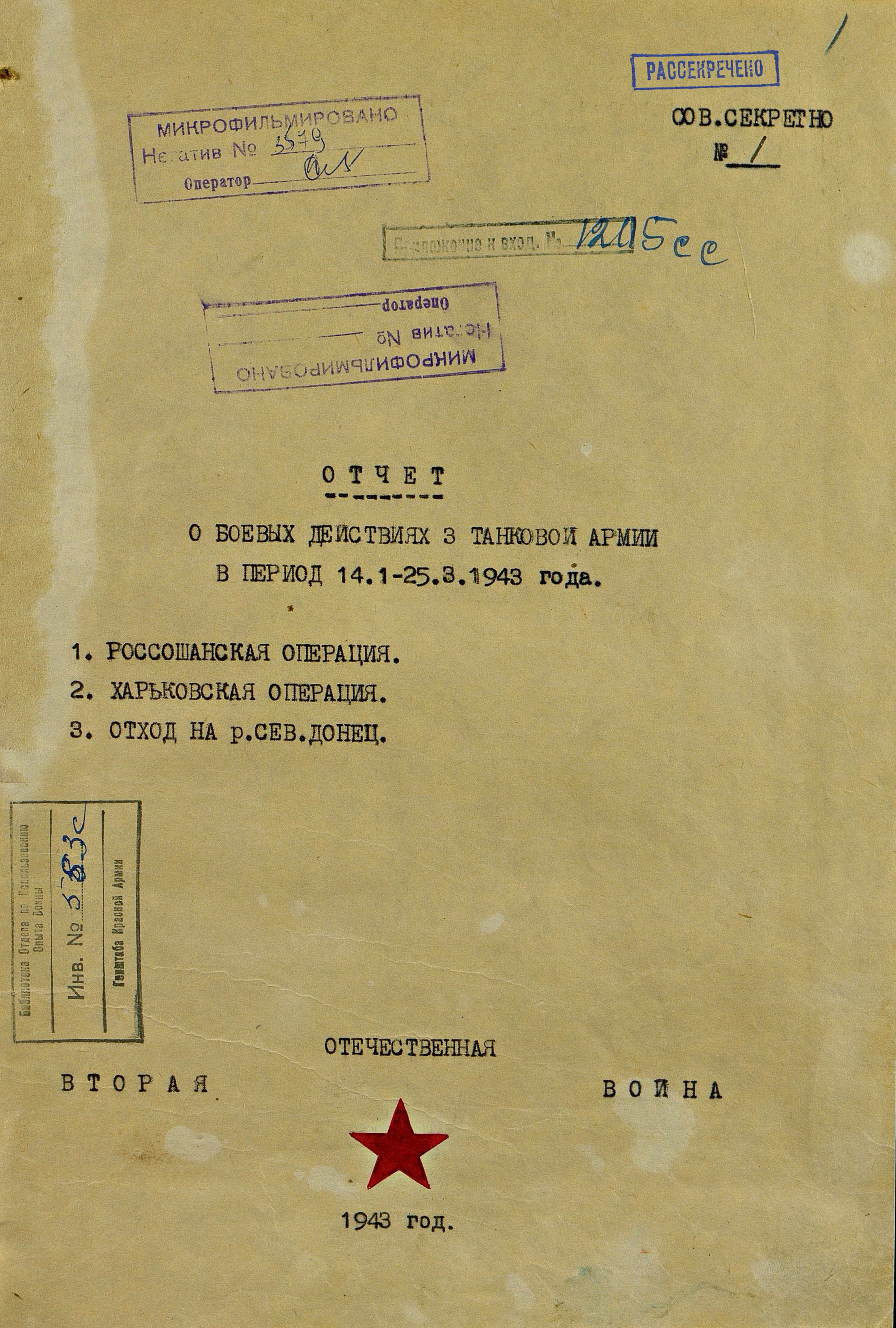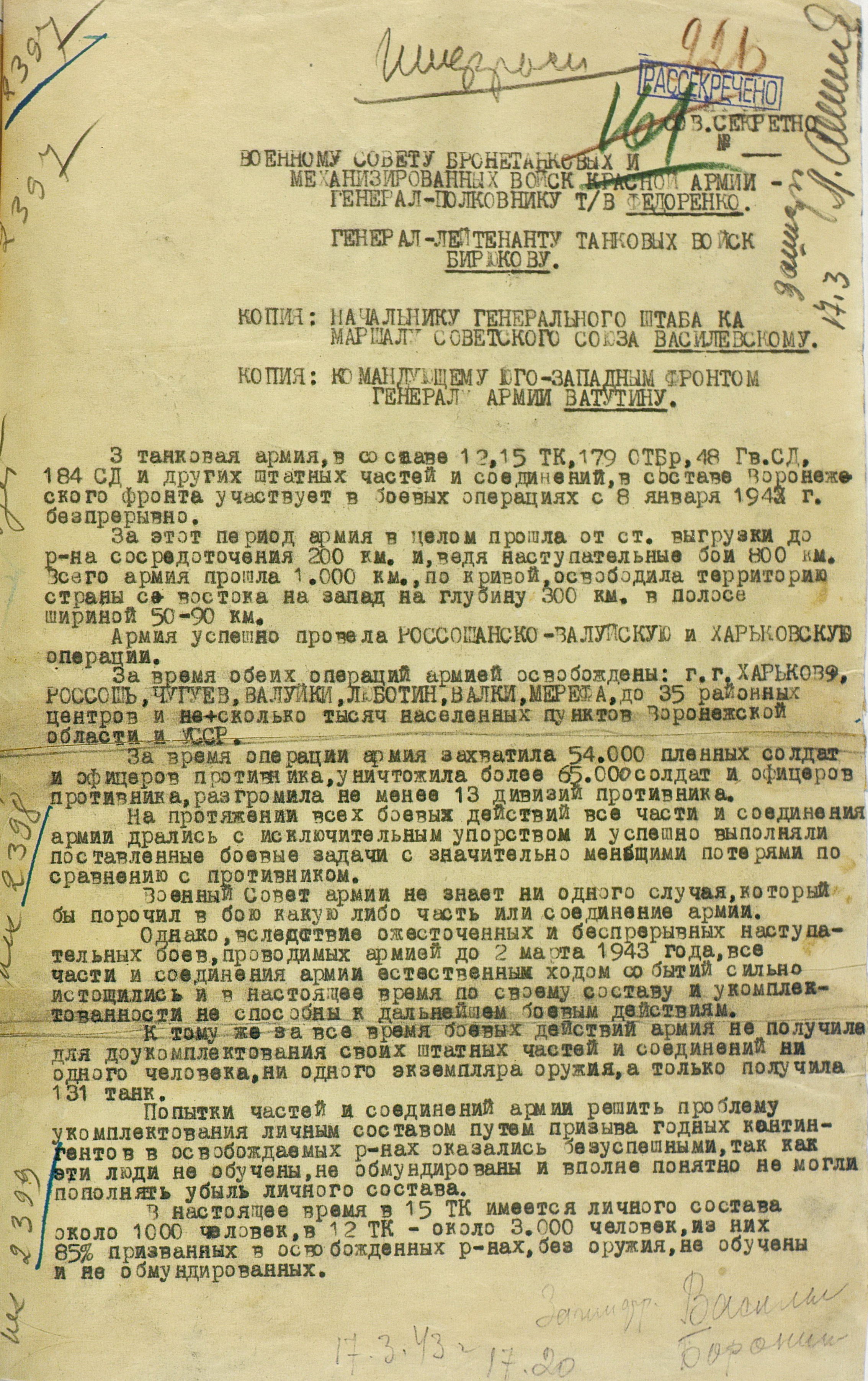 14 марта противнику удалось завершить манёвр по обходу города, в результате чего войска 3-й танковой армии оказались в окружении. Вечером того же дня командующий Воронежским фронтом отдал приказ об оставлении Харькова. Разделившись на группу прорыва и группу прикрытия, 3-я танковая армия с тяжелыми боями вышла 16 марта из окружения и сосредоточилась на левом берегу Северского Донца, после чего была включена в состав Юго-Западного фронта.