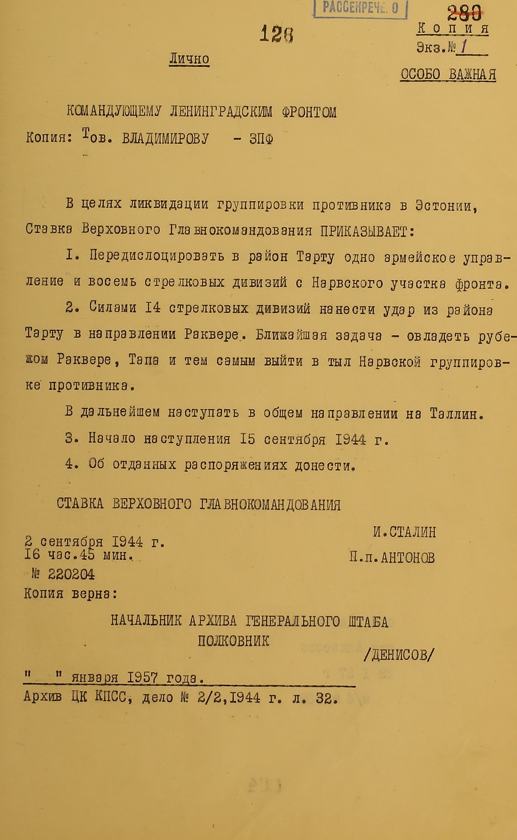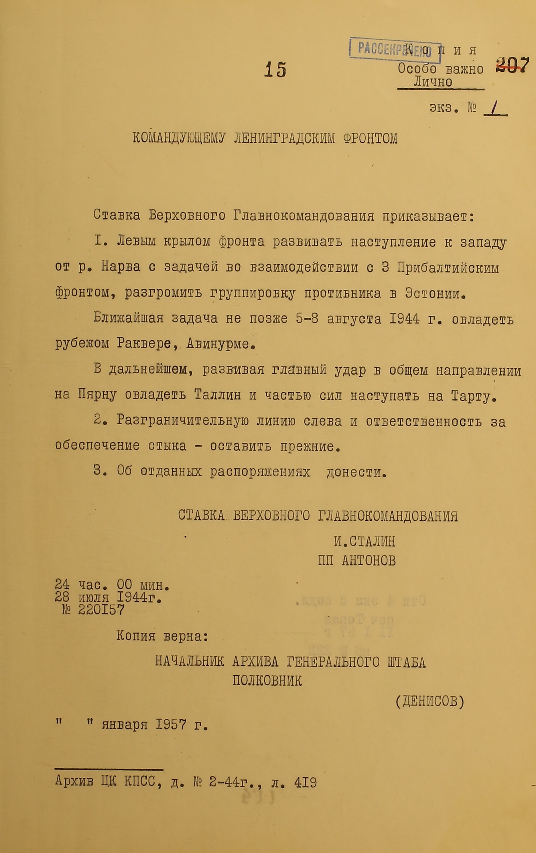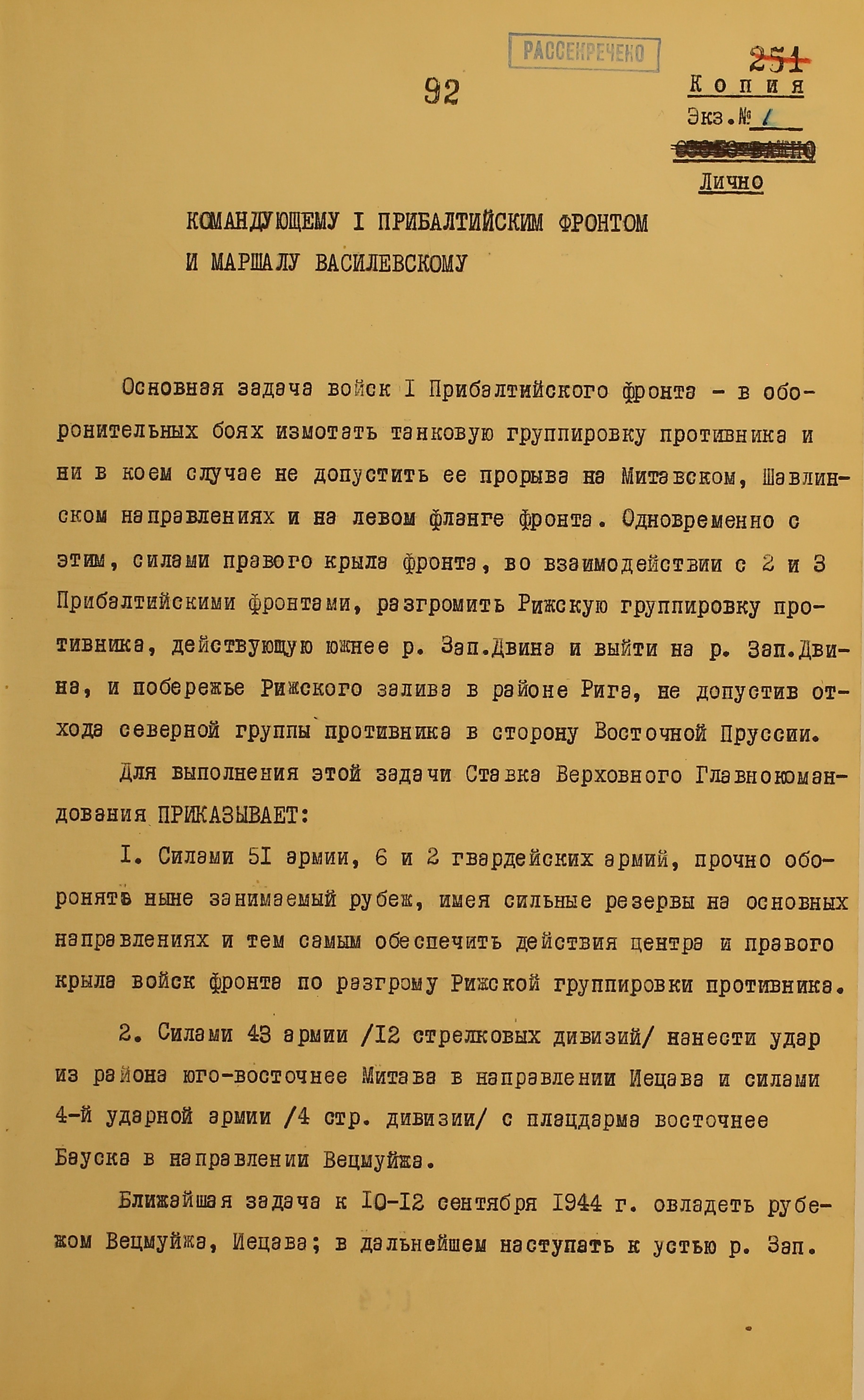 Уничтожение курляндской группировки немецких войск было возложено на войска 2-го и 1-го Прибалтийских фронтов. Координация действий двух Прибалтийских и 3-го Белорусского фронтов возлагалась на Александра Василевского.