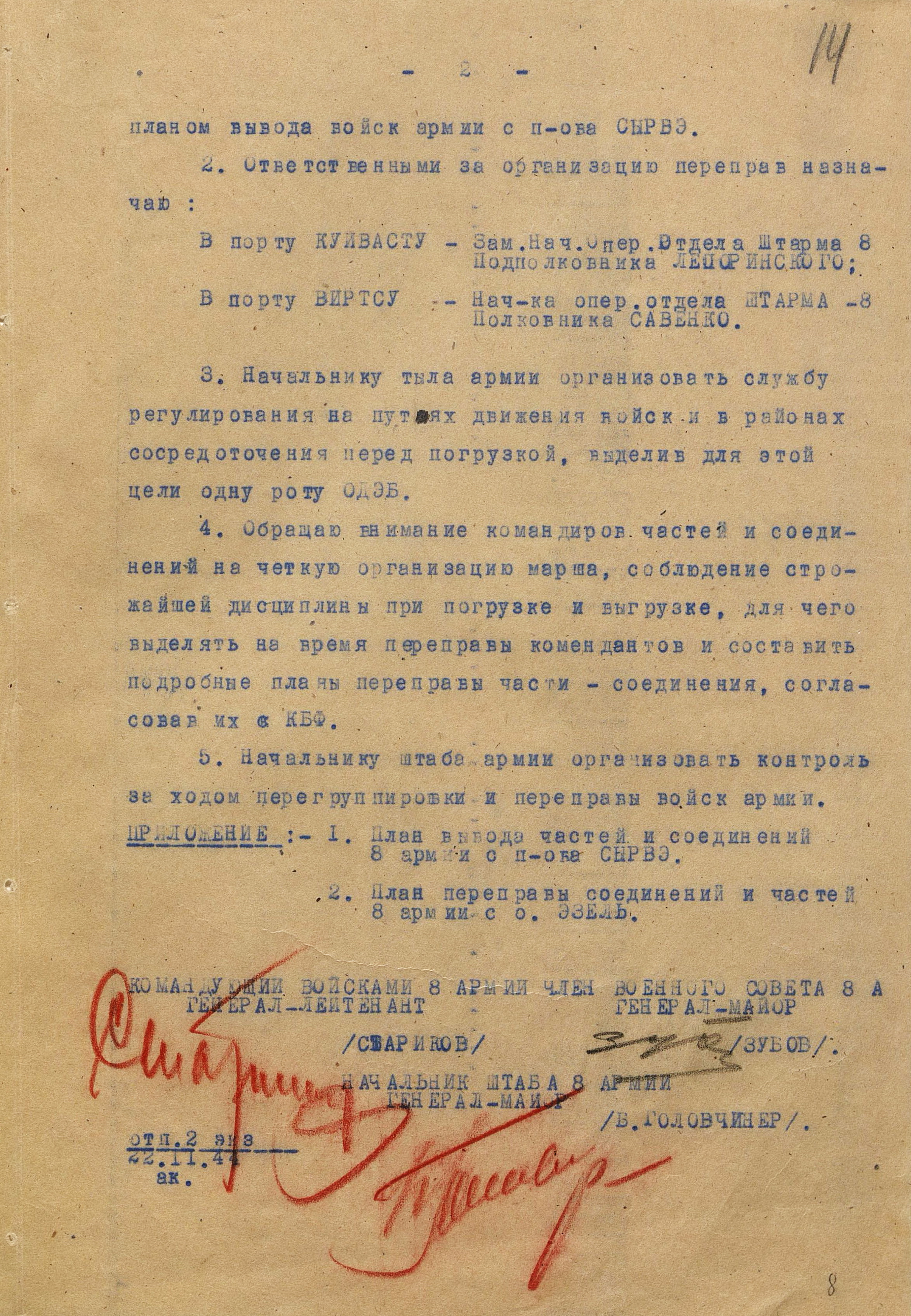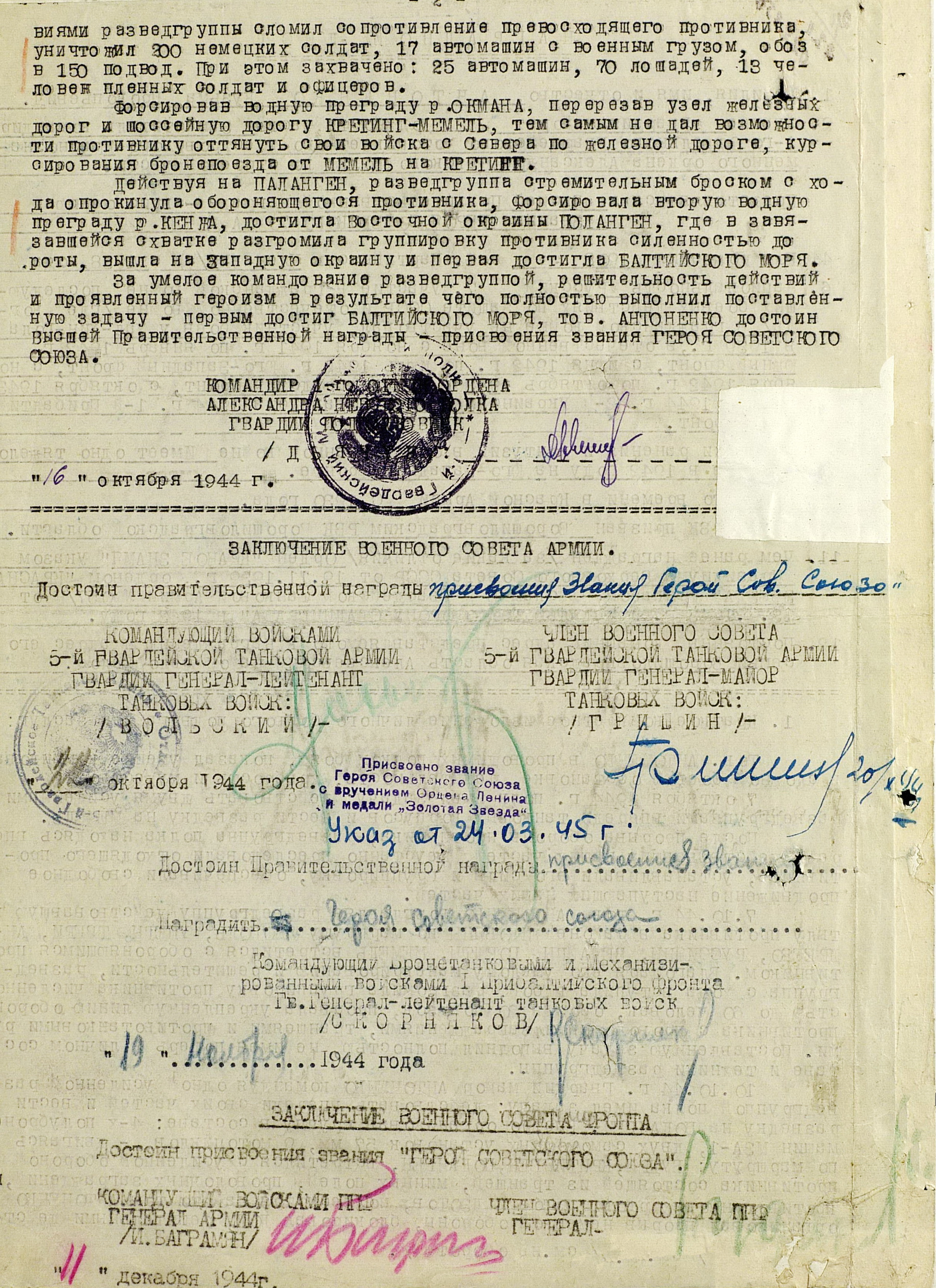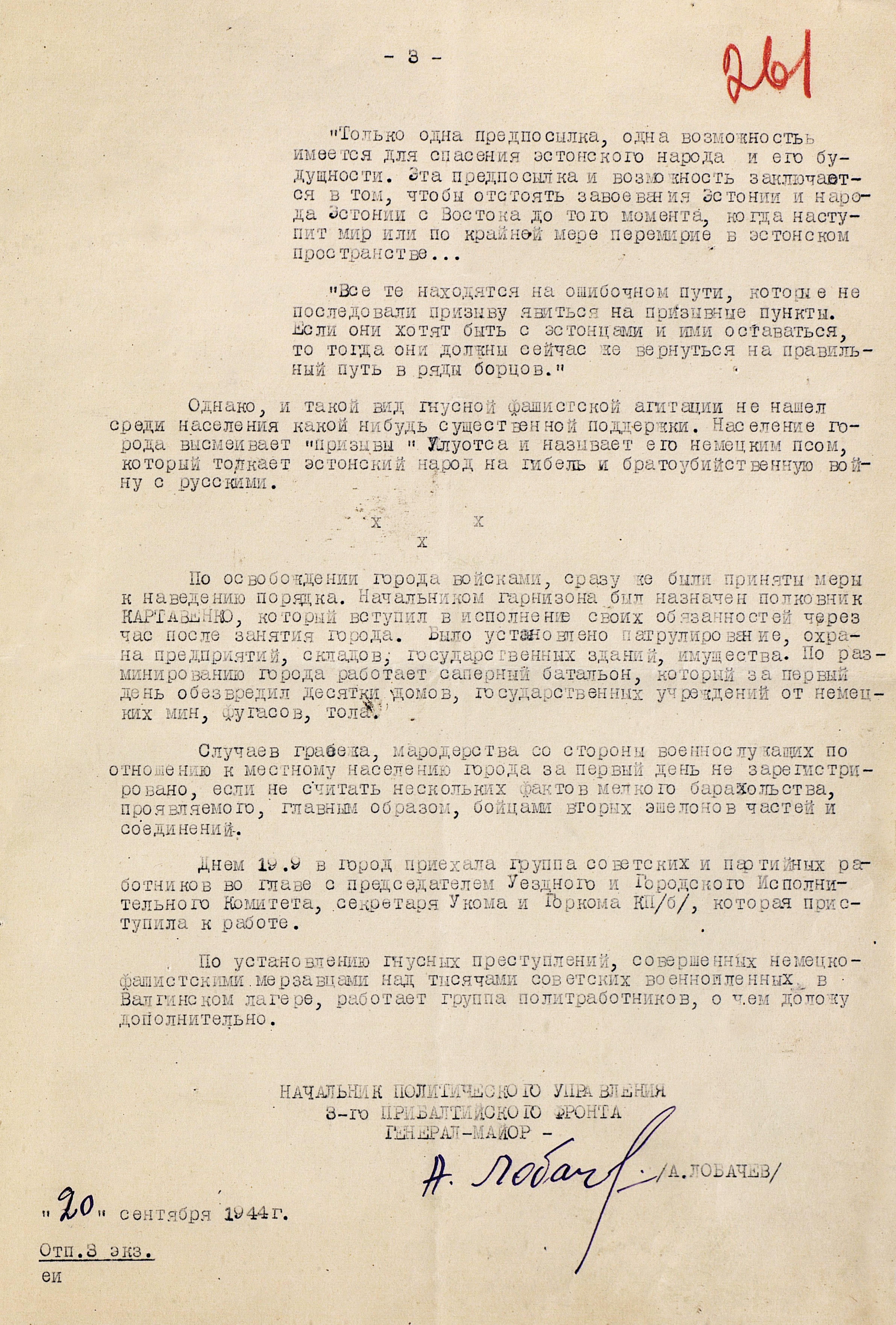 Прибалтийская операция включала четыре объединенных общим замыслом операции: Рижскую, Таллинскую, Моонзундскую десантную и Мемельскую. 14 сентября войска 1-го, 2-го и 3-го Прибалтийских фронтов начали наступление. В ходе Рижской операции советские войска вынудили противника отойти на оборонительный рубеж «Сигулда» (25-60 километров от Риги, севернее реки Даугава) и поставили под удар его коммуникации, ведущие в Восточную Пруссию. Немецкое командование начало отвод войск из Эстонии, усиливая в то же время оборону на подступах к Риге. Войска противника нанесли сильные контрудары в районах Балдоне и Добеле. В связи с ожесточённым сопротивлением немецких войск на этом рубеже, Ставка 24 сентября приняла решение о переносе усилий 1-го Прибалтийского фронта с рижского на мемельское направление, где вражеская группировка была значительно слабее. Войска Ленинградского фронта во взаимодействии с силами Балтийского флота 17 - 26 сентября провели Таллинскую операцию, завершившуюся поражением оперативной группы противника «Нарва», освобождением Таллина и всей материковой части Эстонии.