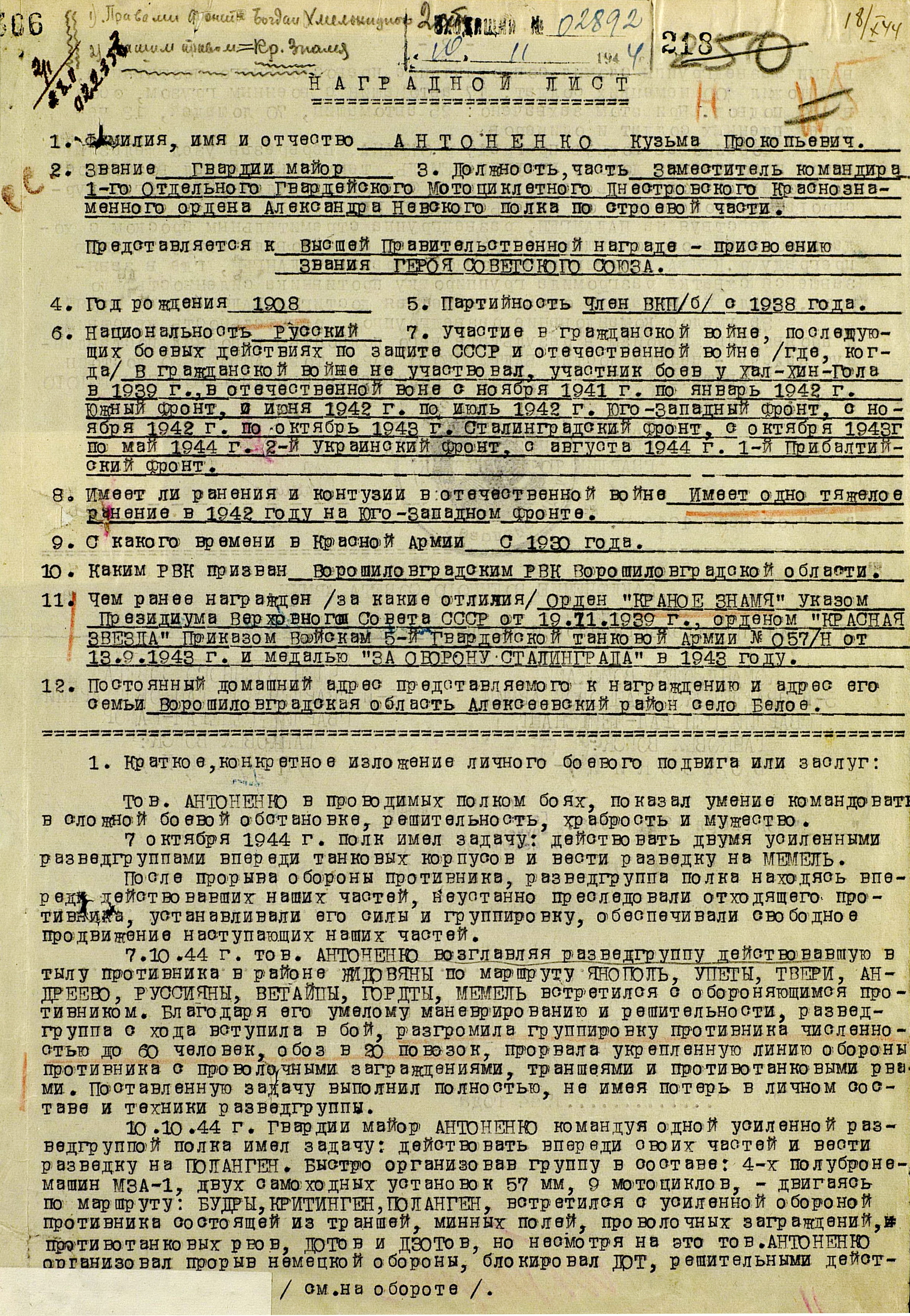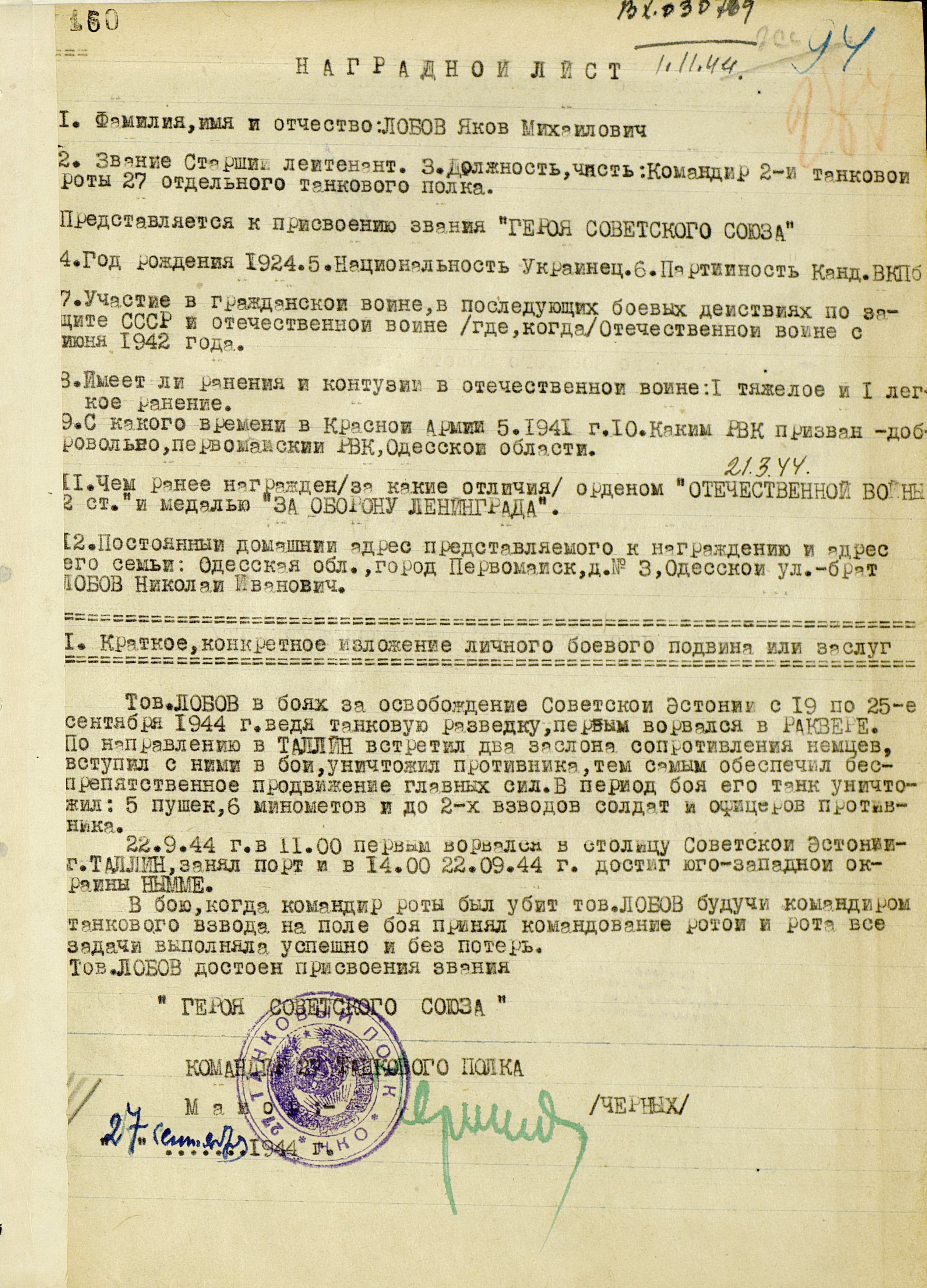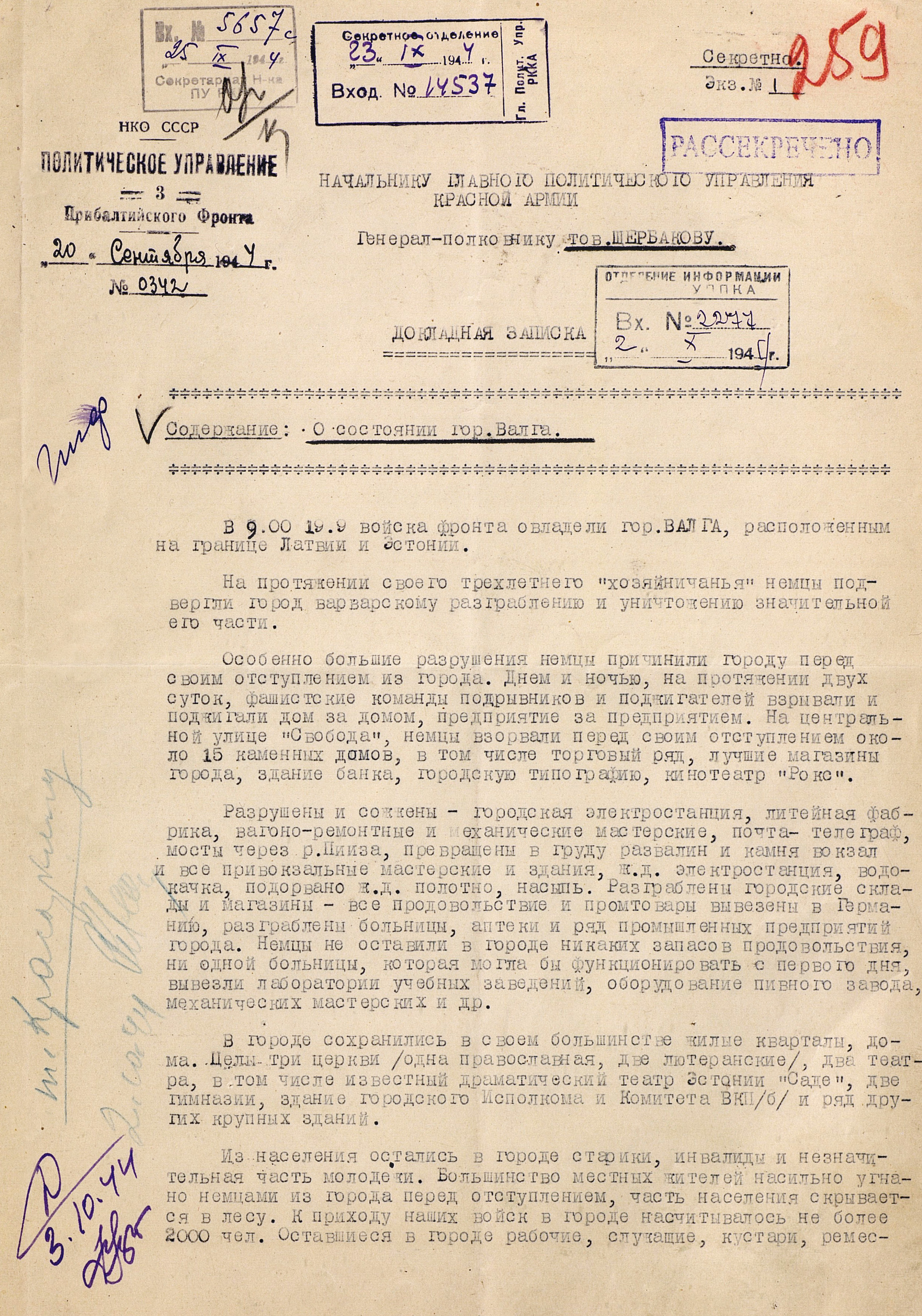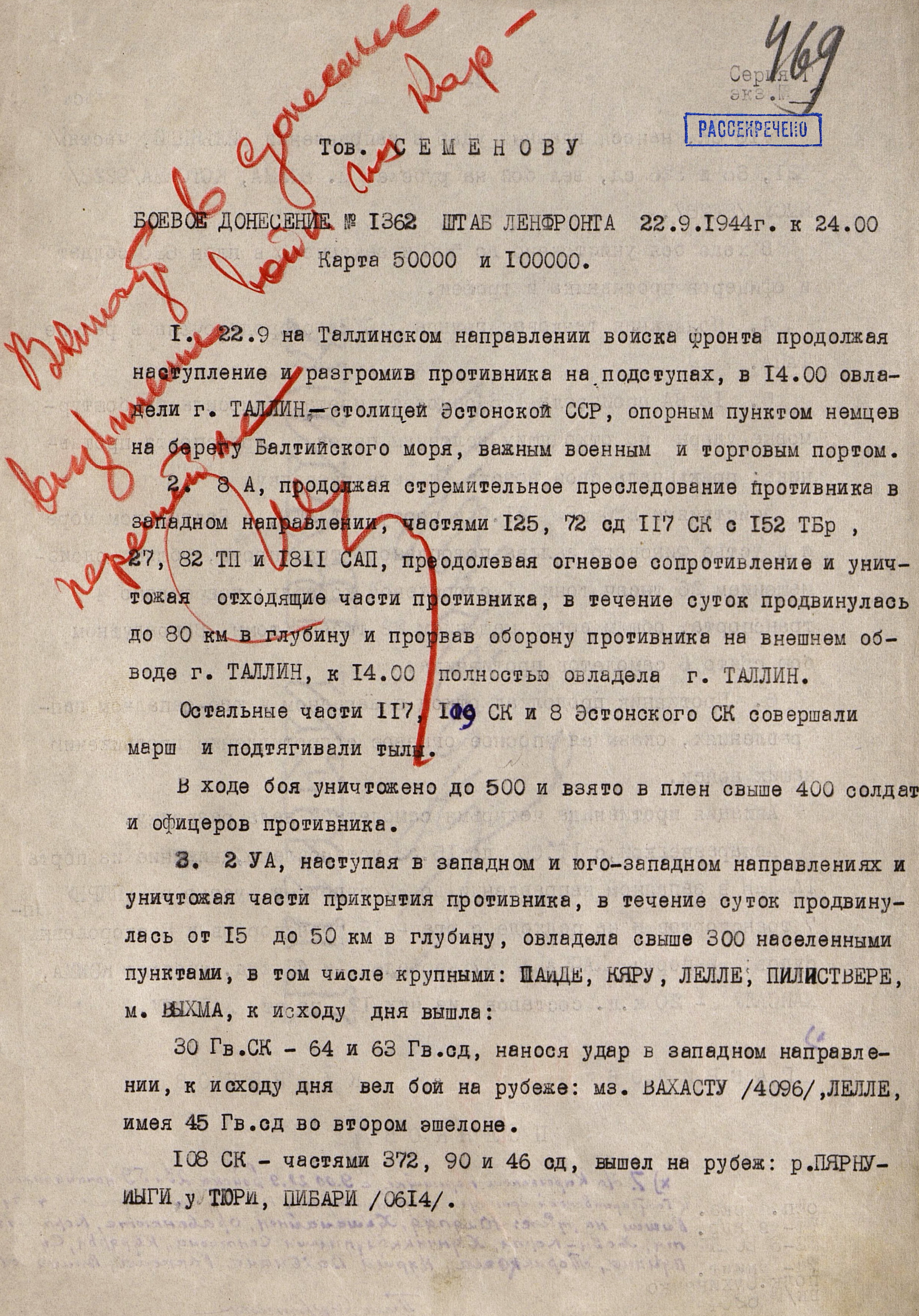 Прибалтийская операция включала четыре объединенных общим замыслом операции: Рижскую, Таллинскую, Моонзундскую десантную и Мемельскую. 14 сентября войска 1-го, 2-го и 3-го Прибалтийских фронтов начали наступление. В ходе Рижской операции советские войска вынудили противника отойти на оборонительный рубеж «Сигулда» (25-60 километров от Риги, севернее реки Даугава) и поставили под удар его коммуникации, ведущие в Восточную Пруссию. Немецкое командование начало отвод войск из Эстонии, усиливая в то же время оборону на подступах к Риге. Войска противника нанесли сильные контрудары в районах Балдоне и Добеле. В связи с ожесточённым сопротивлением немецких войск на этом рубеже, Ставка 24 сентября приняла решение о переносе усилий 1-го Прибалтийского фронта с рижского на мемельское направление, где вражеская группировка была значительно слабее. Войска Ленинградского фронта во взаимодействии с силами Балтийского флота 17 - 26 сентября провели Таллинскую операцию, завершившуюся поражением оперативной группы противника «Нарва», освобождением Таллина и всей материковой части Эстонии.