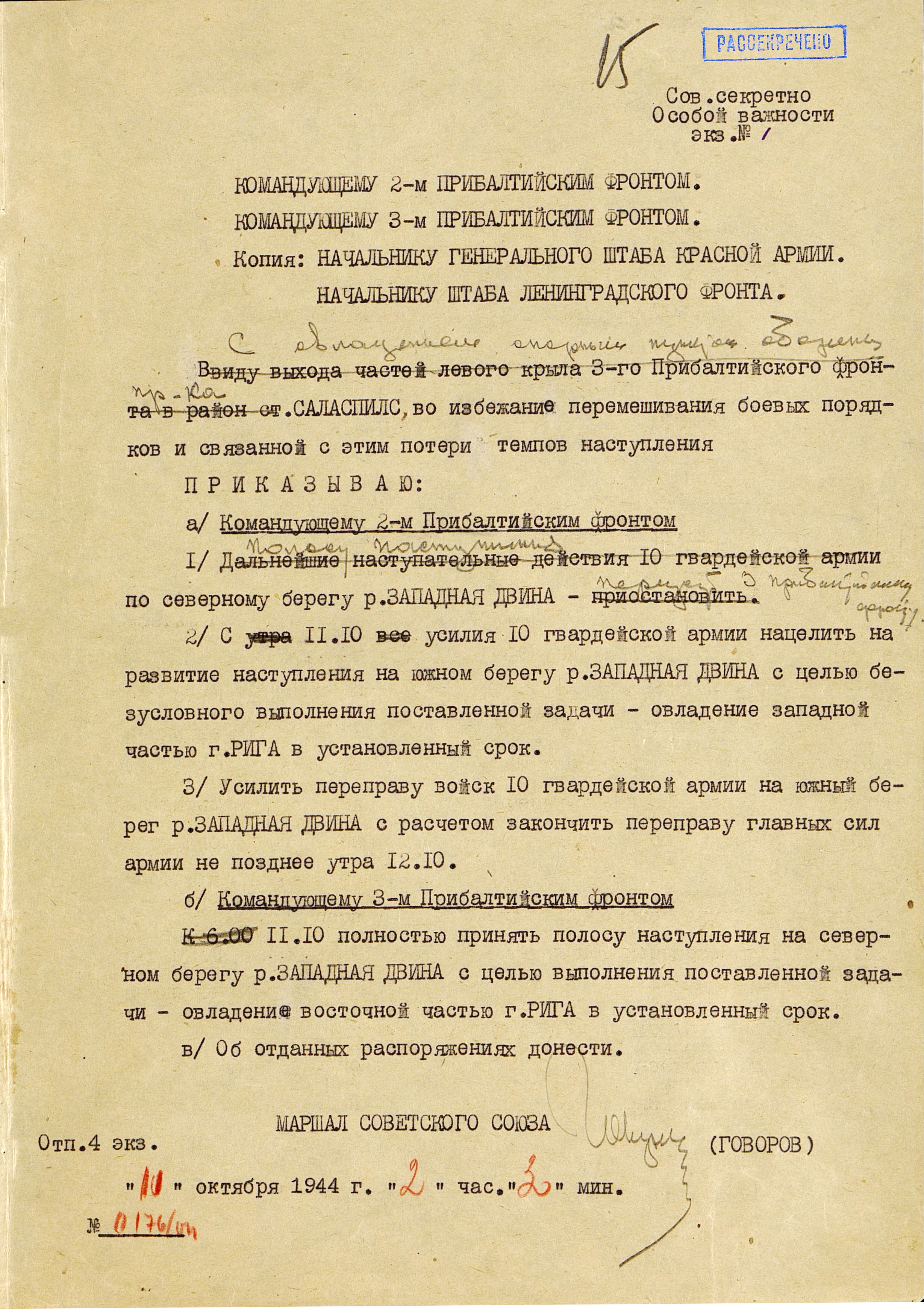 Координацию действий трёх Прибалтийских фронтов до 1 октября 1944 года осуществлял представитель Ставки Верховного Главнокомандования Маршал Советского Союза Александр Василевский. 1 октября на него было возложено руководство операциями 1-го Прибалтийского и 3-го Белорусского фронтов, а на Леонида Говорова — операциями 2-го и 3-го Прибалтийских фронтов, с оставлением за последним обязанностей командующего Ленинградским фронтом.