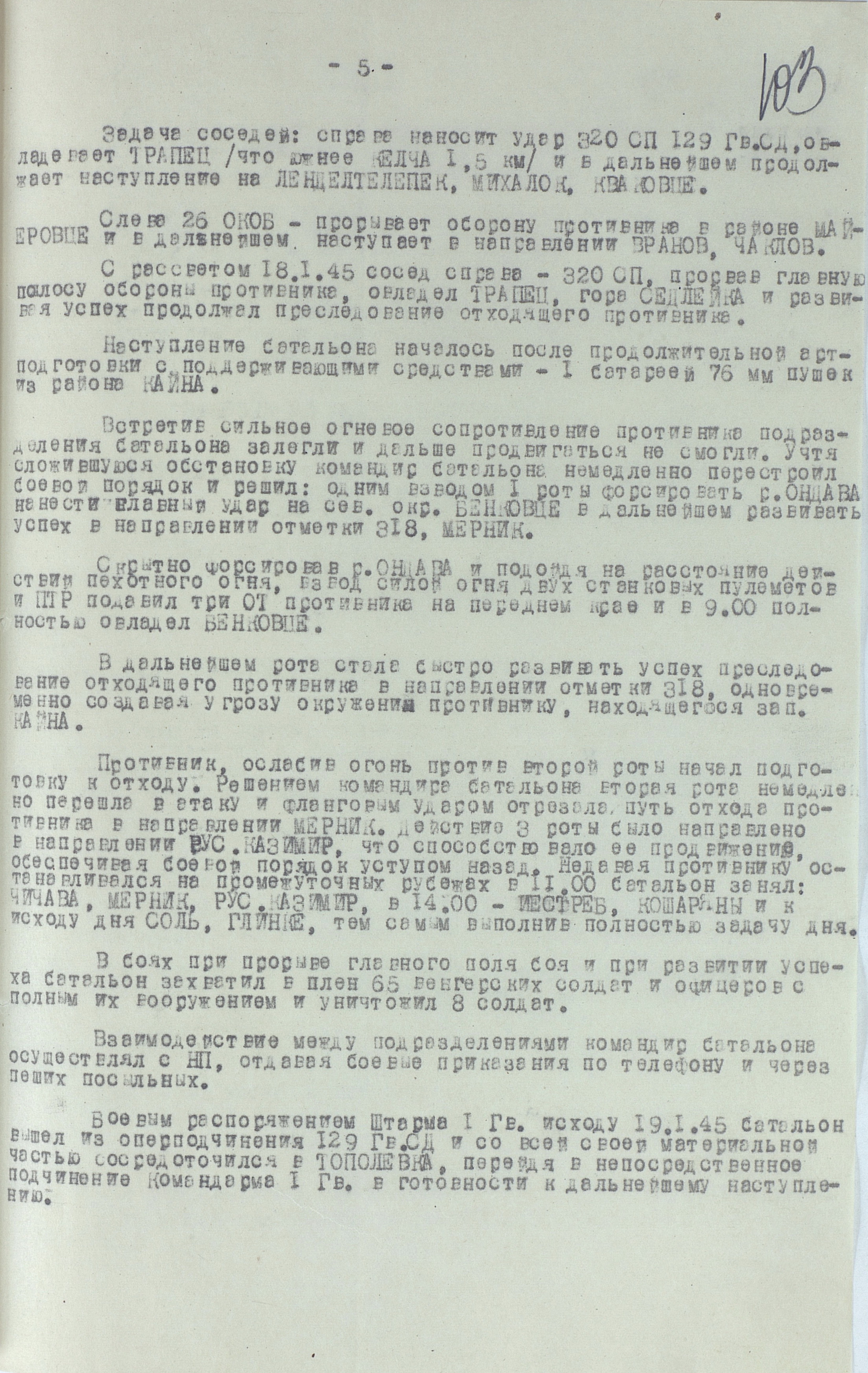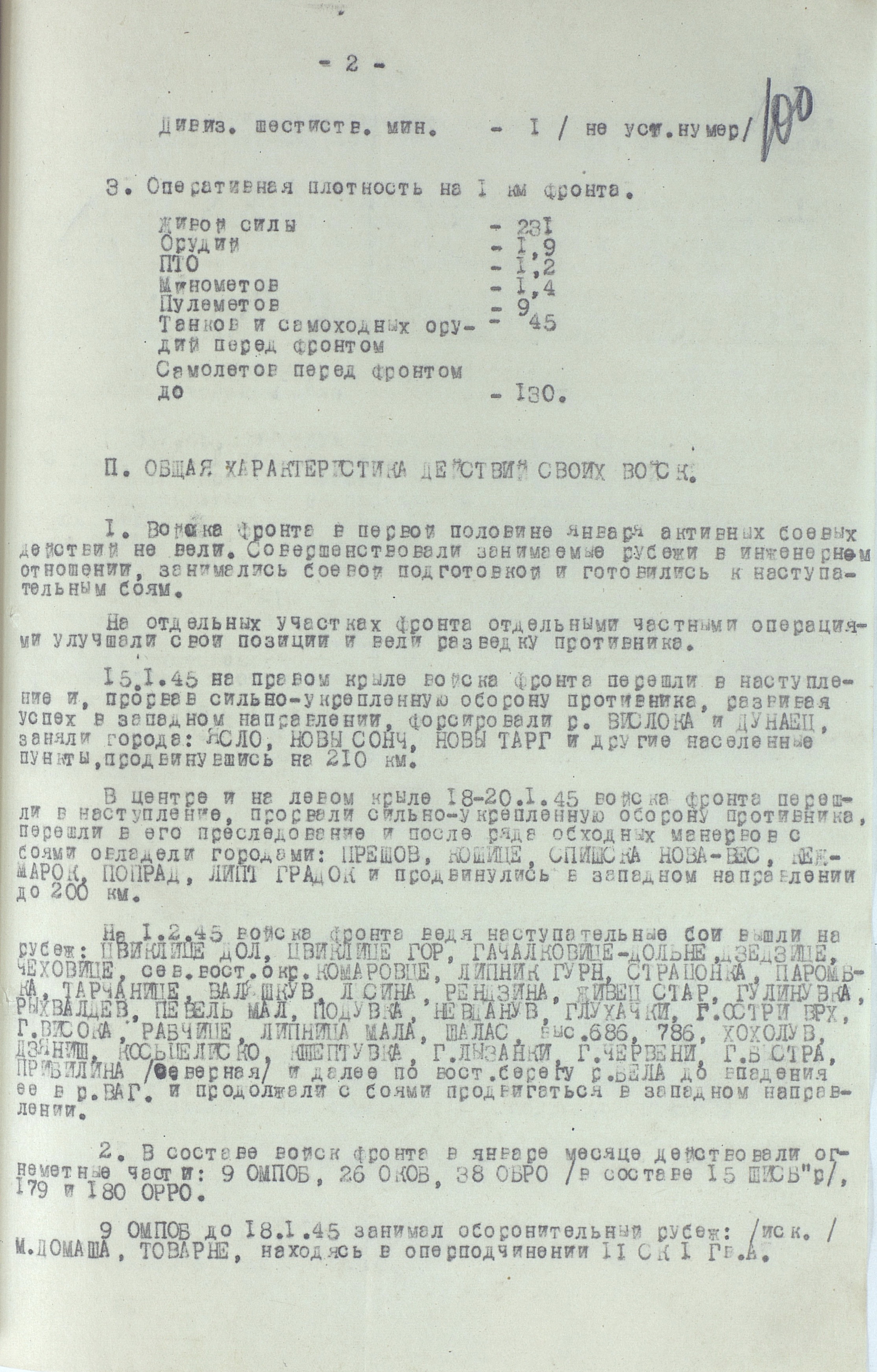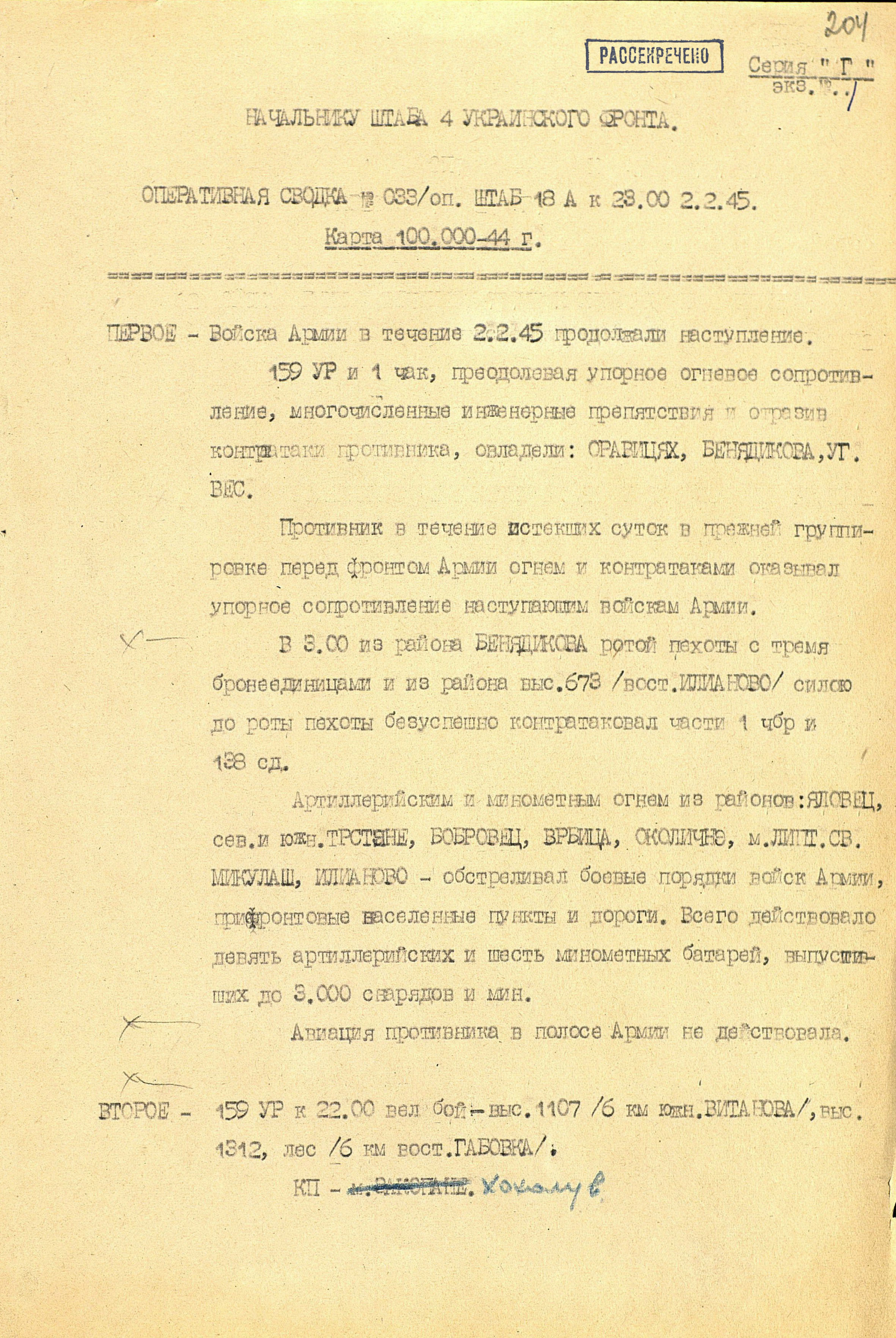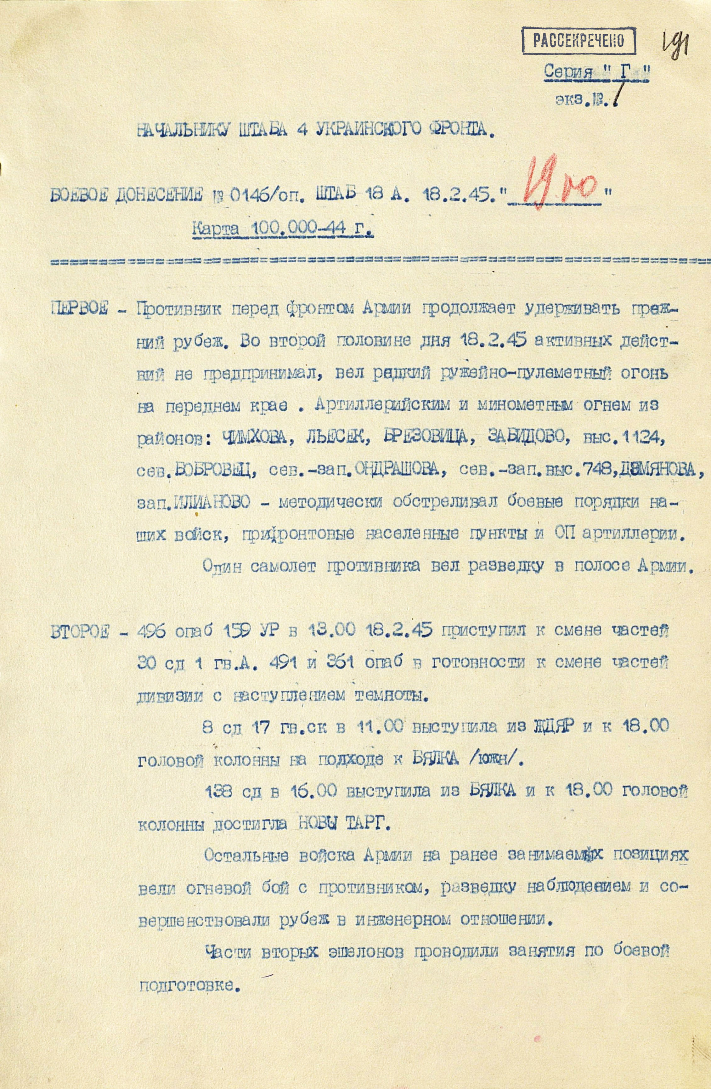 18 января перешла в наступление 1-я гв. армия вместе с приданным ей чехословацким 1-м армейским корпусом. Отбросив к исходу дня противника на 22 км, она на следующий день освободила важный узел коммуникаций г. Прешов. В тот же день 18-я армия освободила второй по величине промышленный, административный и культурный центр восточной Словакии г. Кошице (в апреле он стал местом пребывания вновь сформированного правительства Чехословакии), а также город Прешов. 28 января освобождён Попрад, 29 января – Новы-Тарг. Развивая успех, войска 4-го Украинского фронта к концу января вышли к главному хребту Западных Карпат, а войска правого крыла 2-го Украинского фронта - на рубеж Брезно, восточнее Немце. Командующий 4-м Украинским фронтом уточнил задачи войскам: 38-я армия должна была овладеть г. Бельско-Бяла и наступать в направлении Моравска-Остравы; 1-я гв. армия - на Живец, Цешин; 18-я армия с чехословацким 1-м армейским корпусом (с 21 января в составе 18-й армии) - на Ружомберок, Жилину. 12 февраля 1-я гв. армия совместно с 38-й армией овладела г. Бельско-Бяла - мощным узлом сопротивления противника на подступах к Моравска- Остравскому промышленному району. К середине февраля войска 4-го Украинского фронта вышли к заранее подготовленному противником оборонительному рубежу по линии западнее Струмень, - восточнее Липтовски-Свети-Микулаш, прорвать который с ходу не смогли, и с 18 февраля по решению Ставки ВГК перешли к обороне, завершив Западно-Карпатскую наступательную операцию. Этим же решением правому крылу 2-го Украинского фронта поставлена задача выйти к р. Грон.