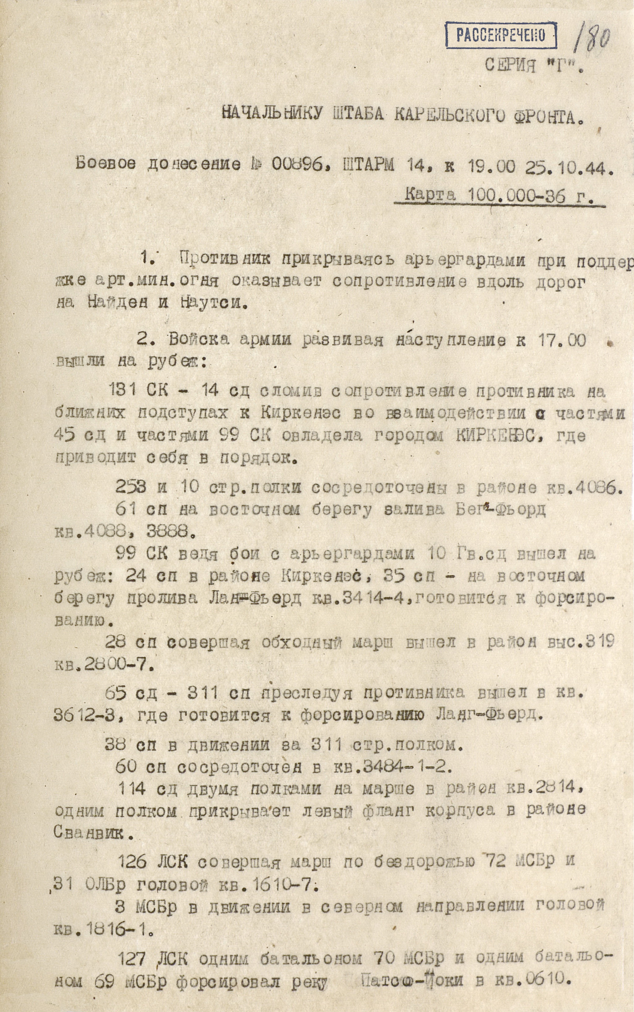 После разгрома врага на Карельском перешейке и в Южной Карелии, приведшего к выходу из войны Финляндии, командование немецкой 20-й горной армии (генерал-полковник Л. Рендулич) начало отвод своих войск с финской территории. Лишь в Заполярье противник продолжал удерживать небольшую часть советской территории, захваченную ещё в 1941 г., стремясь сохранить за собой источники важного стратегического сырья (медь, никель, молибден), а также незамерзающие северные морские порты, на которые базировались силы германского флота.