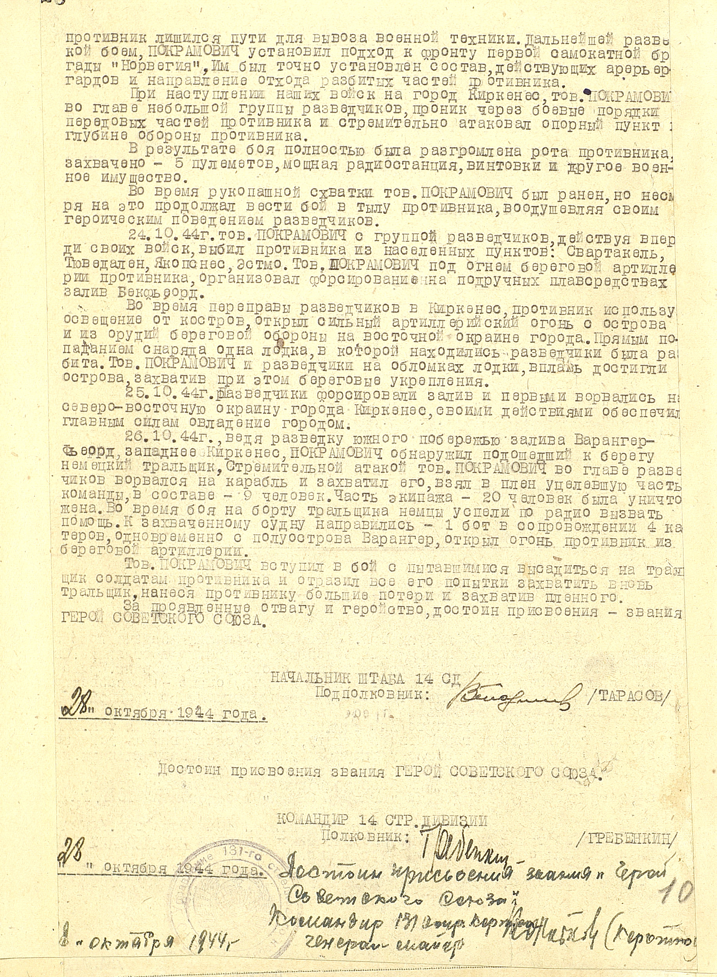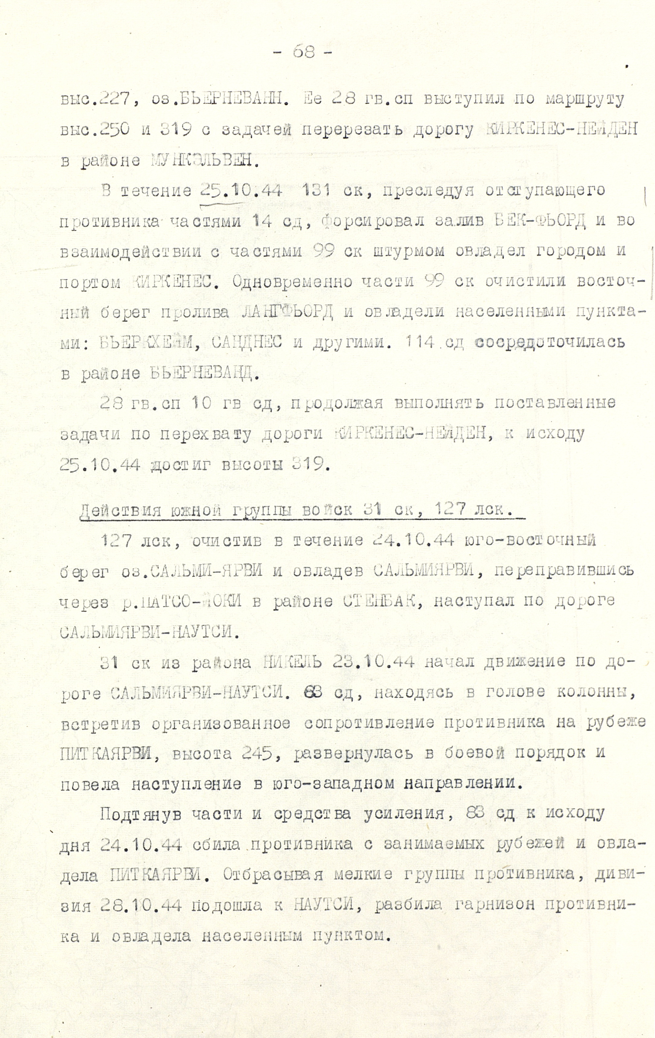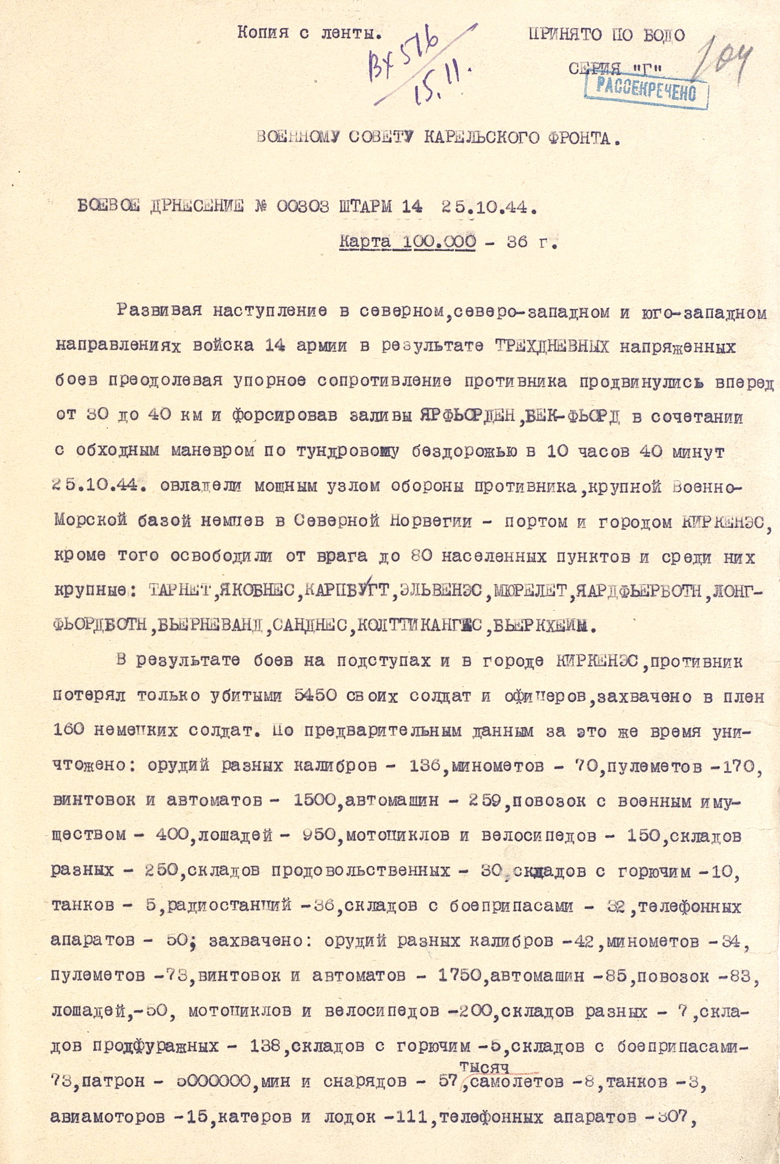 Утром 7 октября после артиллерийской подготовки, продолжавшейся 2 часа 35 минут, войска 14-й армии перешли в наступление. Почти сразу же основная тяжесть ведения боевых действий легла на пехоту, т.к. приданные танки и дивизионная артиллерия из-за бездорожья отстали, а авиация из-за нелётной погоды не смогла оказать должной поддержки наземным войскам. Тем не менее к исходу дня оборона противника была прорвана на участке в 6 км по фронту и на глубину до 8 км. Действовавший на левом фланге 14-й армии 126-й лёгкий стрелковый корпус (полковник В.Н. Соловьёв), не встречая сопротивления, двинулся в глубокий обход противника с юго-запада. В ходе ожесточенных боёв 8-9 октября части 131-го (генерал-майор З.Н. Алексеев, с 24 октября генерал-майор Ф.Ф. Коротков) и 99-го (генерал-майор С.П. Микульский) стрелковых корпусов прорвали вторую полосу обороны противника и развернули наступление на Луостари. 126-й лёгкий стрелковый корпус тем временем вышел в район юго-западнее Луостари, создав угрозу правому флангу и тылу 19-го горнострелкового корпуса противника. В ночь на 10 октября в районе губы М. Волоковая корабли Северного флота высадили морской десант (63-я бригада морской пехоты (полковник А.М. Крылов), который нанёс удар во фланг и в тыл немецкой 193-й пехотной бригады, оборонявшейся на перешейке полуострова Средний. Утром 10 октября на этом перешейке перешла в наступление 12-я бригада морской пехоты (полковник В.В. Рассохин). Прорвав оборону врага, она соединилась с морским десантом, и обе бригады развернули наступление на Петсамо с востока. На направлении главного удара советские войска 12 октября овладели Луостари и начали развивать успех на Петсамо с юга. Вечером 12 октября в Линахамари был высажен морской десант, который на следующий день овладел портом и развернул наступление на Петсамо с севера. 15 октября войска 14-й армии во взаимодействии с силами Северного флота освободили этот город и порт. Однако 19-й горнострелковый корпус, потеряв до 2/3 своего состава и всю боевую технику, всё же сумел избежать окружения. После взятия Петсамо командование Карельским фронтом приостановило наступление и произвело перегруппировку сил. 18 октября оно возобновилось. Войскам 14-й армии предстояло разгромить подошедшие резервы противника (части 18-го горнострелкового и 36-го армейского корпусов), а в случае их отхода на территорию Норвегии и Финляндии продолжать преследование до полного разгрома. Северный флот получил задачу воспрепятствовать эвакуации врага морем. 21 октября части 131-го стрелкового корпуса перешли норвежскую границу и на следующий день освободили г. Тарнет. К этому времени противостоявшая советским войскам группировка противника была рассечена на две части – одна из них отходила на северо-запад, к Киркенесу, другая – на юго-запад, к Наутси. 22 октября части введённых в сражение из 2-го эшелона армии разгромили корпусную группу «Рюбель» 36-го армейского корпуса и овладели г. Никель, а также находившимися в этом районе никелевыми разработками. Для содействия наступлению войск 14-й армии Северный флот 18 - 25 октября высадил морской десант на побережье залива Варангер-фьорд. 25 октября войска 99-го и 131-го стрелковых корпусов после упорных боёв освободили город и порт Киркенес, являвшийся главной базой снабжения немецких войск в Заполярье. 27 октября части 126-го лёгкого ст