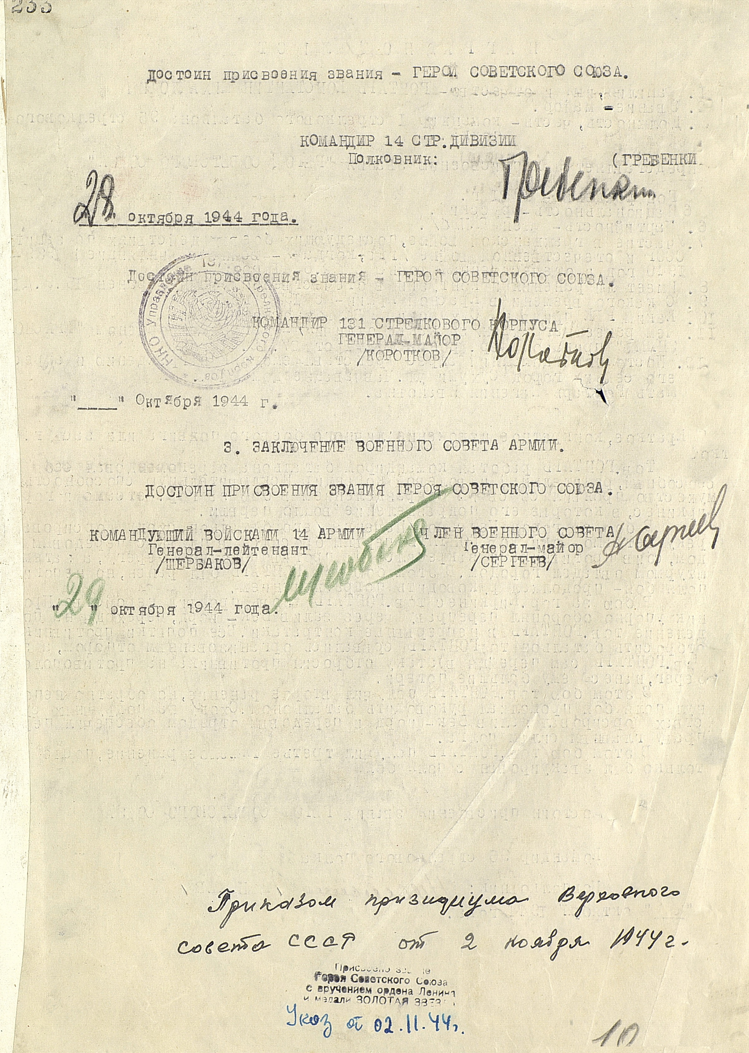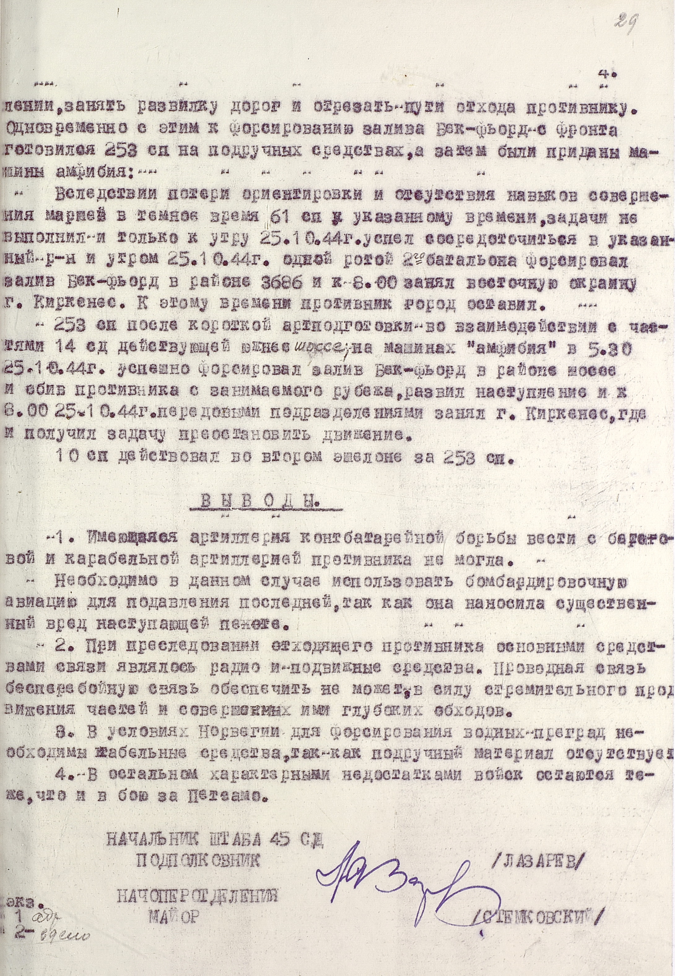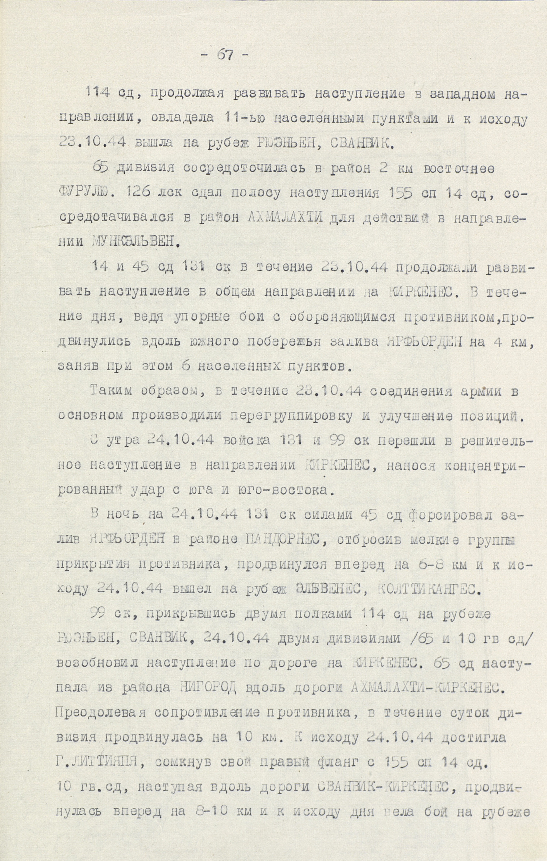 Утром 7 октября после артиллерийской подготовки, продолжавшейся 2 часа 35 минут, войска 14-й армии перешли в наступление. Почти сразу же основная тяжесть ведения боевых действий легла на пехоту, т.к. приданные танки и дивизионная артиллерия из-за бездорожья отстали, а авиация из-за нелётной погоды не смогла оказать должной поддержки наземным войскам. Тем не менее к исходу дня оборона противника была прорвана на участке в 6 км по фронту и на глубину до 8 км. Действовавший на левом фланге 14-й армии 126-й лёгкий стрелковый корпус (полковник В.Н. Соловьёв), не встречая сопротивления, двинулся в глубокий обход противника с юго-запада. В ходе ожесточенных боёв 8-9 октября части 131-го (генерал-майор З.Н. Алексеев, с 24 октября генерал-майор Ф.Ф. Коротков) и 99-го (генерал-майор С.П. Микульский) стрелковых корпусов прорвали вторую полосу обороны противника и развернули наступление на Луостари. 126-й лёгкий стрелковый корпус тем временем вышел в район юго-западнее Луостари, создав угрозу правому флангу и тылу 19-го горнострелкового корпуса противника. В ночь на 10 октября в районе губы М. Волоковая корабли Северного флота высадили морской десант (63-я бригада морской пехоты (полковник А.М. Крылов), который нанёс удар во фланг и в тыл немецкой 193-й пехотной бригады, оборонявшейся на перешейке полуострова Средний. Утром 10 октября на этом перешейке перешла в наступление 12-я бригада морской пехоты (полковник В.В. Рассохин). Прорвав оборону врага, она соединилась с морским десантом, и обе бригады развернули наступление на Петсамо с востока. На направлении главного удара советские войска 12 октября овладели Луостари и начали развивать успех на Петсамо с юга. Вечером 12 октября в Линахамари был высажен морской десант, который на следующий день овладел портом и развернул наступление на Петсамо с севера. 15 октября войска 14-й армии во взаимодействии с силами Северного флота освободили этот город и порт. Однако 19-й горнострелковый корпус, потеряв до 2/3 своего состава и всю боевую технику, всё же сумел избежать окружения. После взятия Петсамо командование Карельским фронтом приостановило наступление и произвело перегруппировку сил. 18 октября оно возобновилось. Войскам 14-й армии предстояло разгромить подошедшие резервы противника (части 18-го горнострелкового и 36-го армейского корпусов), а в случае их отхода на территорию Норвегии и Финляндии продолжать преследование до полного разгрома. Северный флот получил задачу воспрепятствовать эвакуации врага морем. 21 октября части 131-го стрелкового корпуса перешли норвежскую границу и на следующий день освободили г. Тарнет. К этому времени противостоявшая советским войскам группировка противника была рассечена на две части – одна из них отходила на северо-запад, к Киркенесу, другая – на юго-запад, к Наутси. 22 октября части введённых в сражение из 2-го эшелона армии разгромили корпусную группу «Рюбель» 36-го армейского корпуса и овладели г. Никель, а также находившимися в этом районе никелевыми разработками. Для содействия наступлению войск 14-й армии Северный флот 18 - 25 октября высадил морской десант на побережье залива Варангер-фьорд. 25 октября войска 99-го и 131-го стрелковых корпусов после упорных боёв освободили город и порт Киркенес, являвшийся главной базой снабжения немецких войск в Заполярье. 27 октября части 126-го лёгкого ст