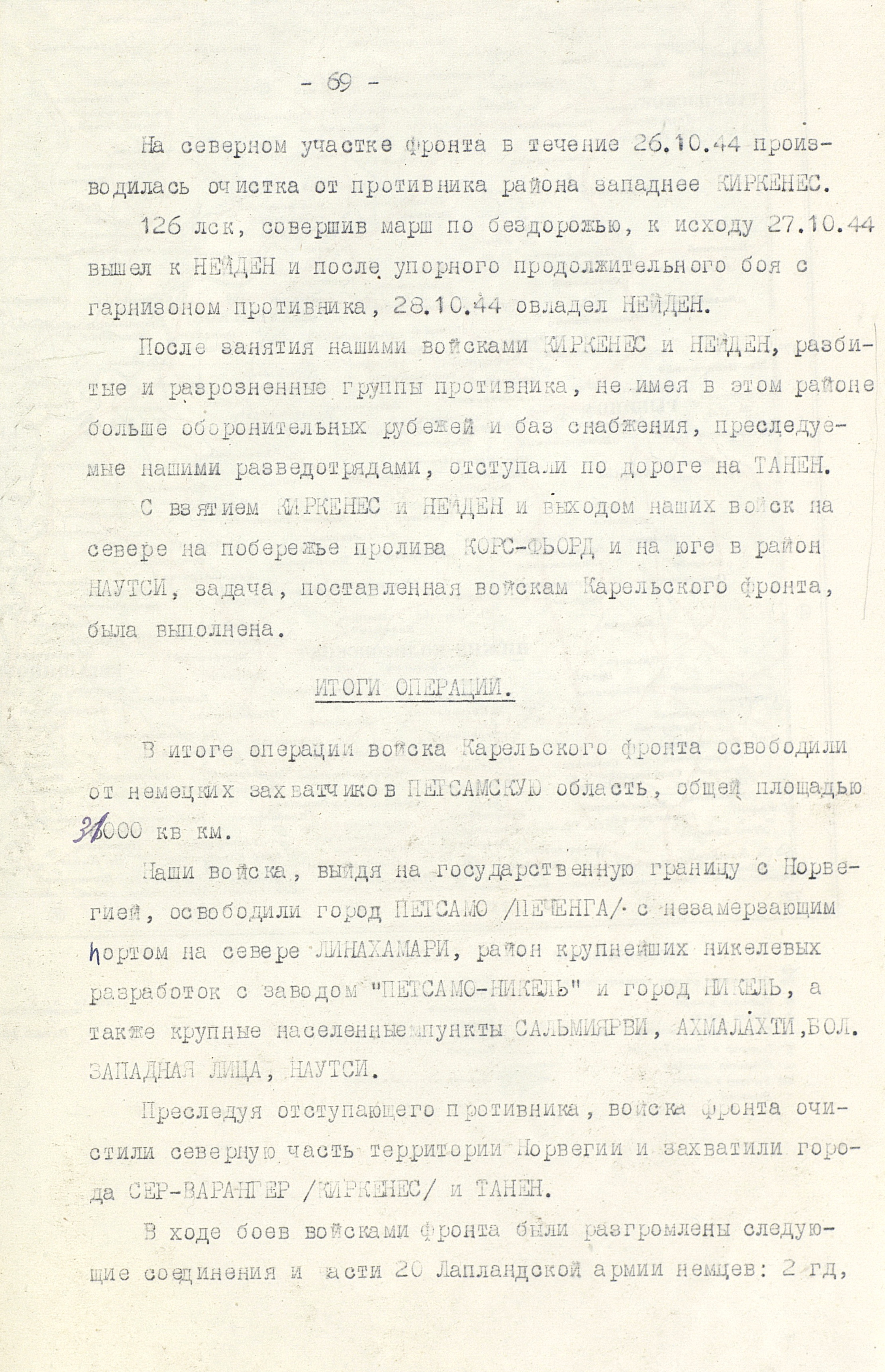 В результате операции были освобождены от немецких оккупантов Советское Заполярье и северные районы Норвегии, нанесено тяжелое поражение немецкой 20-й горной армии и германским ВМФ, резко ограничены действия последнего на советских северных морских коммуникациях, Германия лишилась одного из важнейших источников стратегического сырья. Наступая в полосе 60-90 км, войска 14-й армии продвинулись на глубину 100-120 км.