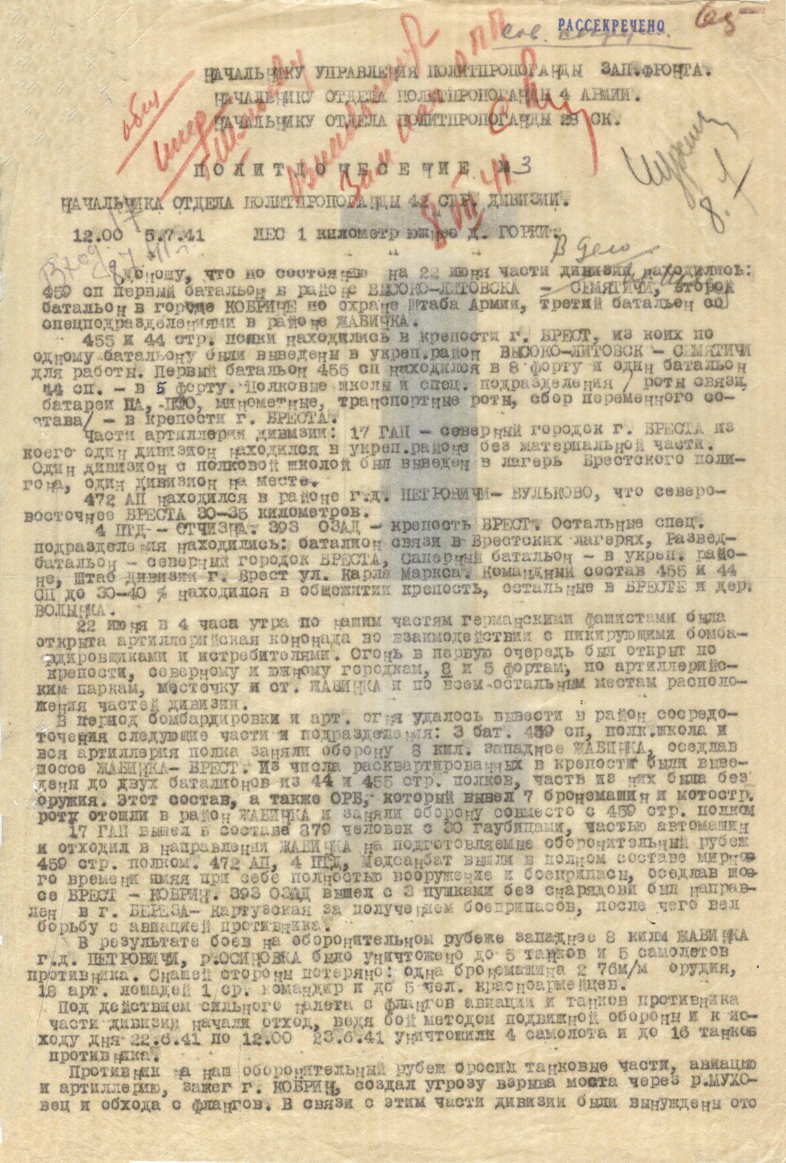 Созданный на базе Западного Особого военного округа Западный фронт [44 дивизии (в т. ч. 12 танковых и 6 моторизованных), 3 воздушно-десантные, 3 артиллерийские бригады, 8 укрепленных районов (УРов), 8 авиационных дивизии, 2 бригады ПВО - всего 671,2 тыс. человек, 13 047 орудий и миномётов, 2192 исправных танка, 1539 исправных боевых самолетов; генерал армии Д.Г. Павлов, со 2 июля маршал Советского Союза С.К. Тимошенко] занимал оборону в 470-км полосе от южной границы Литвы до Влодавы. В 1-м эшелоне фронта находились 3-я армия (генерал-лейтенант В.И. Кузнецов), 10-я армия (генерал-майор К.Д. Голубев) и 4-я армия (генерал-майор А.А. Коробков), в районе Могилёв, Минск, Слуцк формировалась 13-я армия (генерал-лейтенант П.М. Филатов). На стыке Западного и Киевского особых военных округов действовала Пинская военная флотилия (контр-адмирал Д.Д. Рогачев). На территории Белоруссии находились 11 пограничных отрядов Белорусского пограничного округа (генерал-лейтенант И.А. Богданов) и полк оперативных войск НКВД. В 1-м эшелоне армий прикрытия на удалении до 50 км от государственной границы располагалось 12 стрелковых и 1 кавалерийская дивизии, в резерве фронта (100-400 км от границы) - 12 стрелковых, 4 танковых и 2 моторизованные дивизии. Войска 1-го и 2-го эшелонов армий занимали пункты постоянной дислокации. Соединения фронта были укомплектованы не полностью, большая часть танков и самолётов была устаревших конструкций, материальные средства находились на складах. Вблизи границы немногочисленные подразделения и части занимались строительством укреплений. Оперативная плотность на фронте армий прикрытия составляла 30-37 км на дивизию.