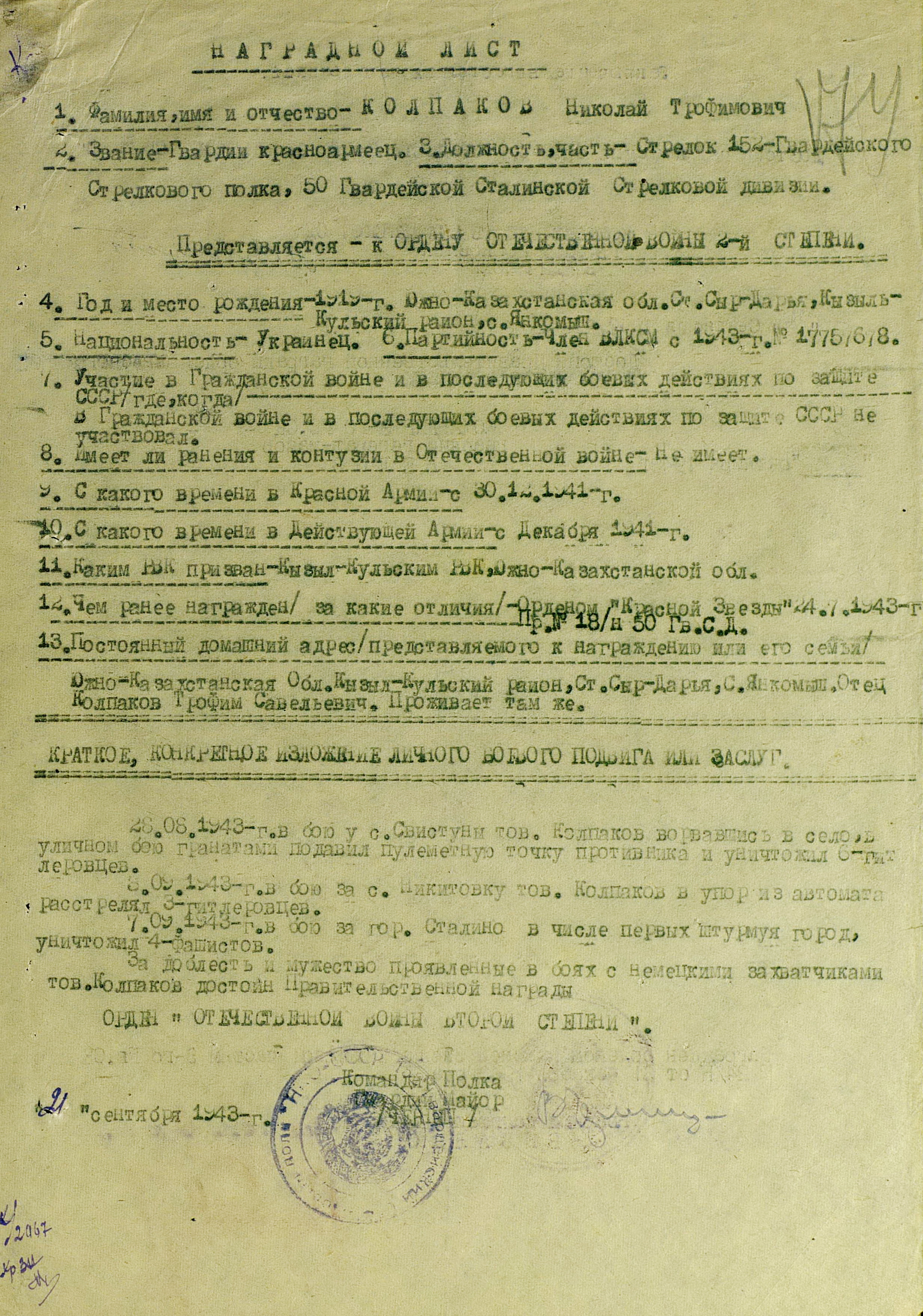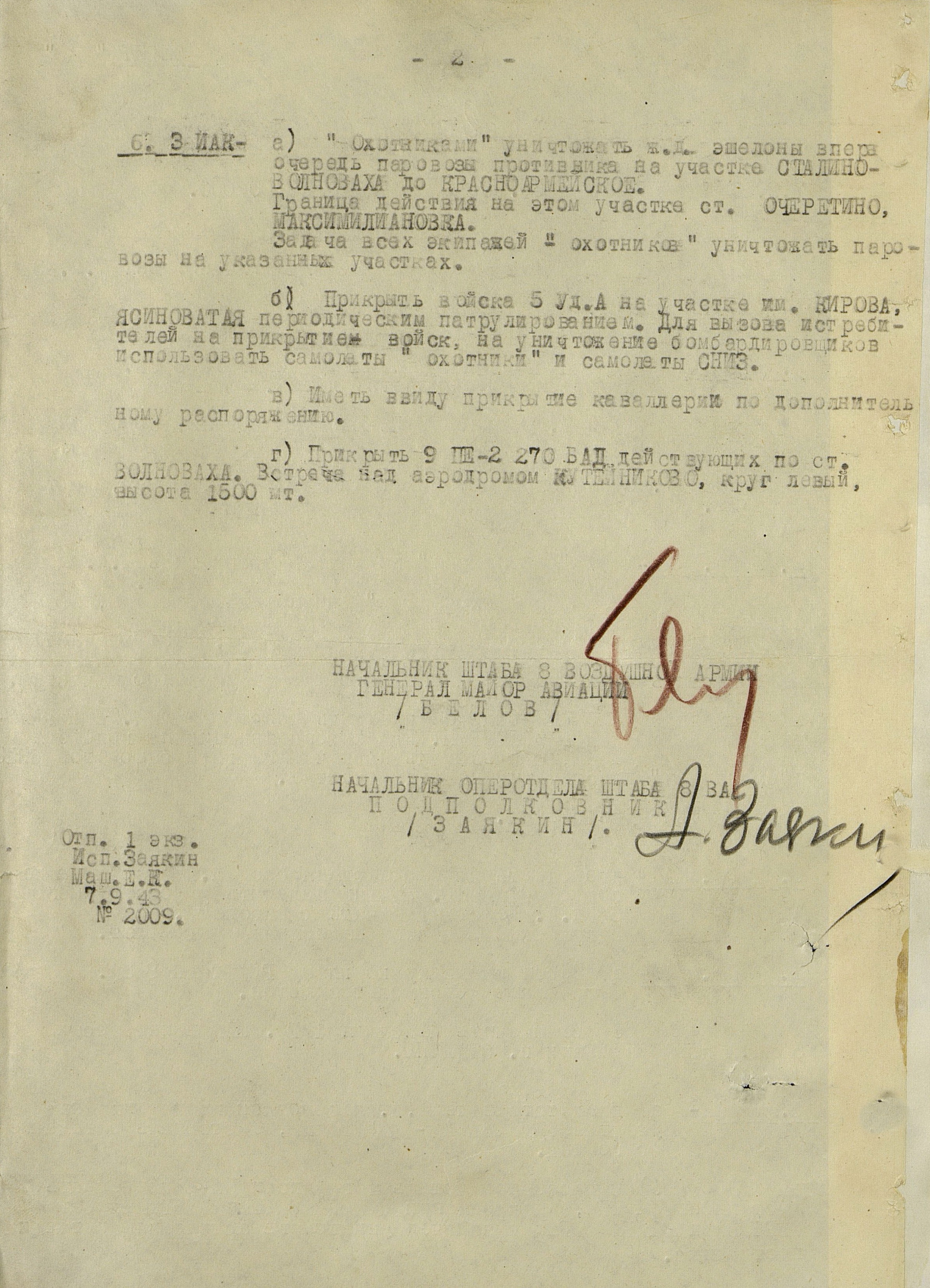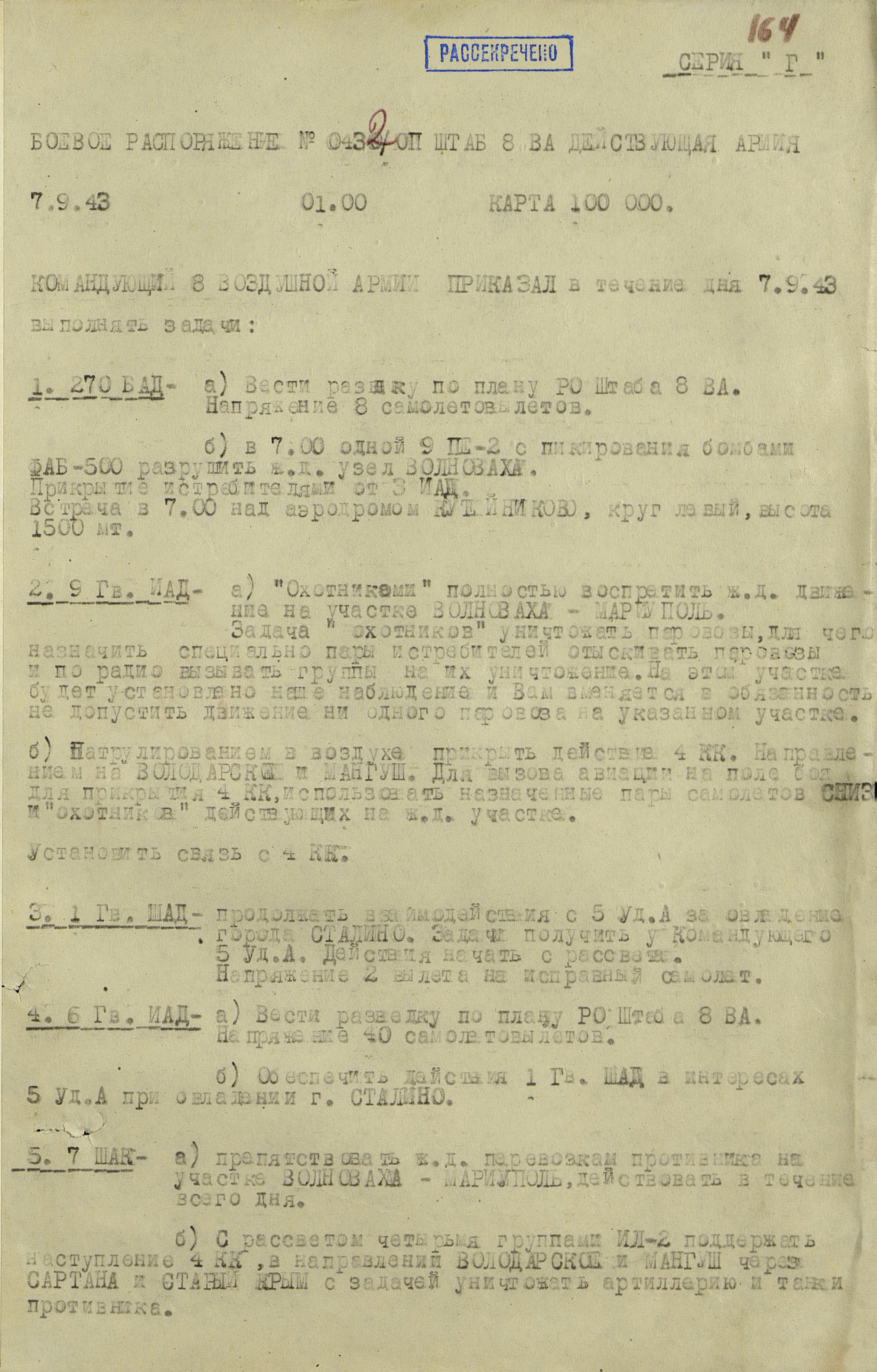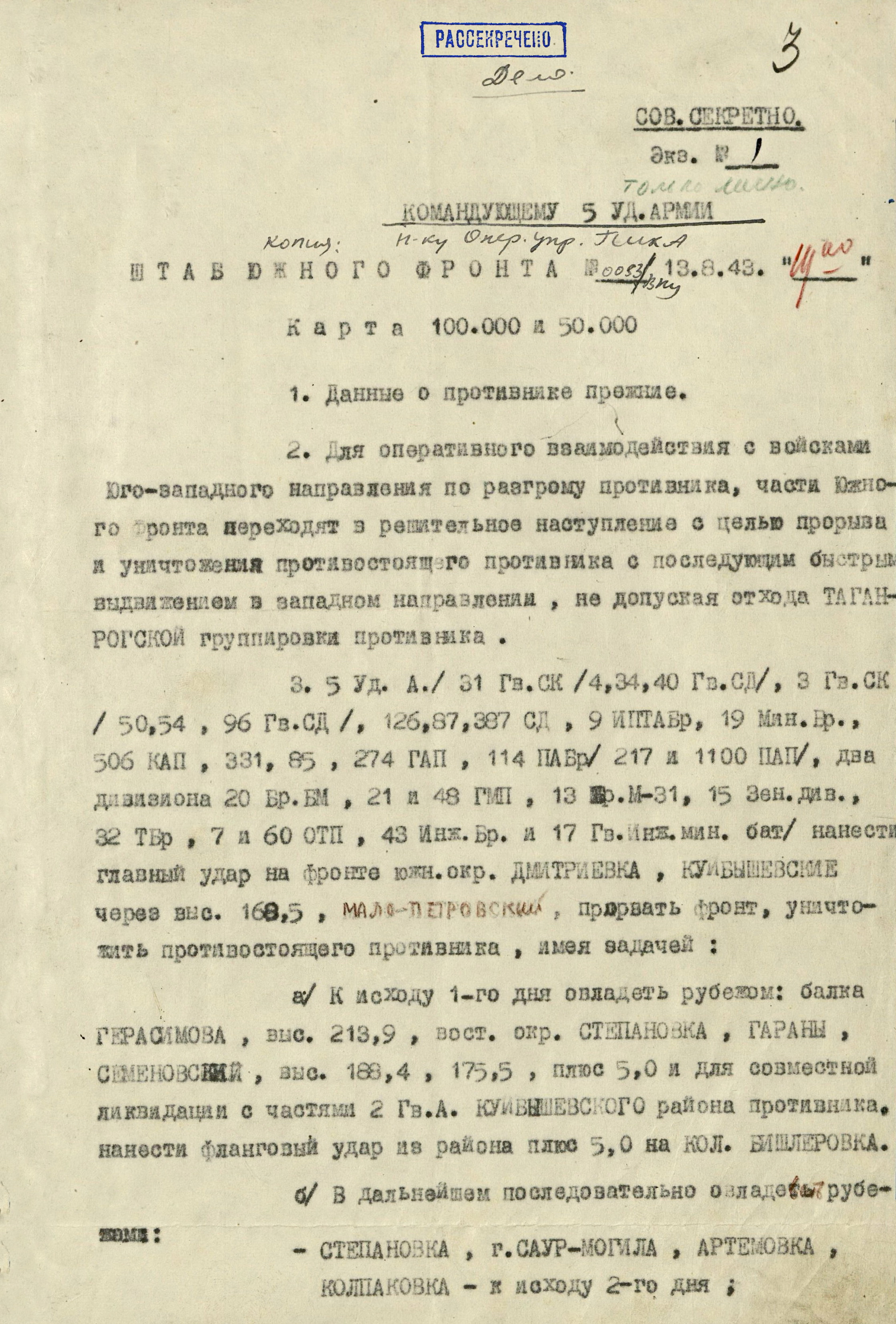 План Донбасской наступательной операции, разработанный и согласованный командованием фронтов, 8 августа 1943 г. был представлен в Ставку ВГК, которая 10 августа его утвердила. А 12 августа Ставка ВГК уточнила Юго-Западному фронту его задачу: нанести главный удар из района Изюм на Барвенково, Павлоград, Орехов, разгромить противника и, выйдя в район Запорожье, Пологи, отрезать пути отхода на запад. Войска Южного фронта в соответствии с планом Донбасской операции наносили главный удар из района Куйбышево на Сталино (Донецк) с целью прорвать оборону противника на р. Миус, во взаимодействии с войсками Юго-Западного фронта разгромить его группировку на юге Донбасса и в дальнейшем наступать в направлении Крыма и низовий Днепра. Координация действий фронтов была возложена на маршала Советского Союза А.М. Василевского.