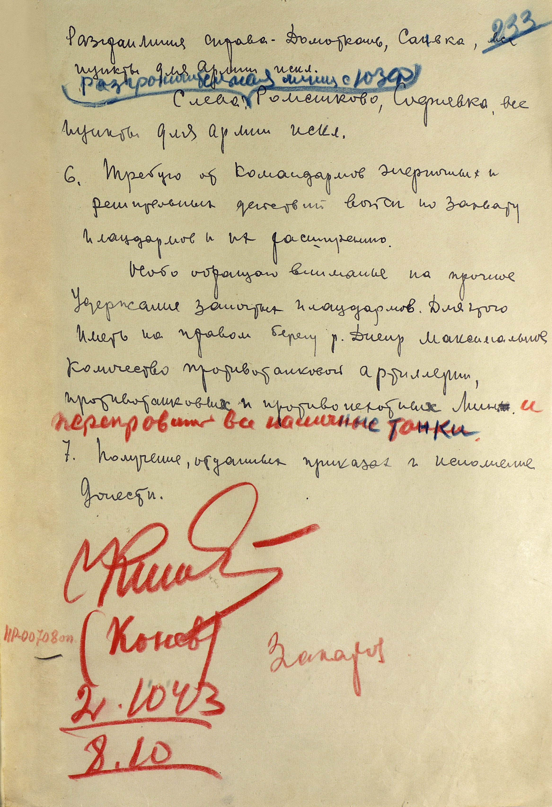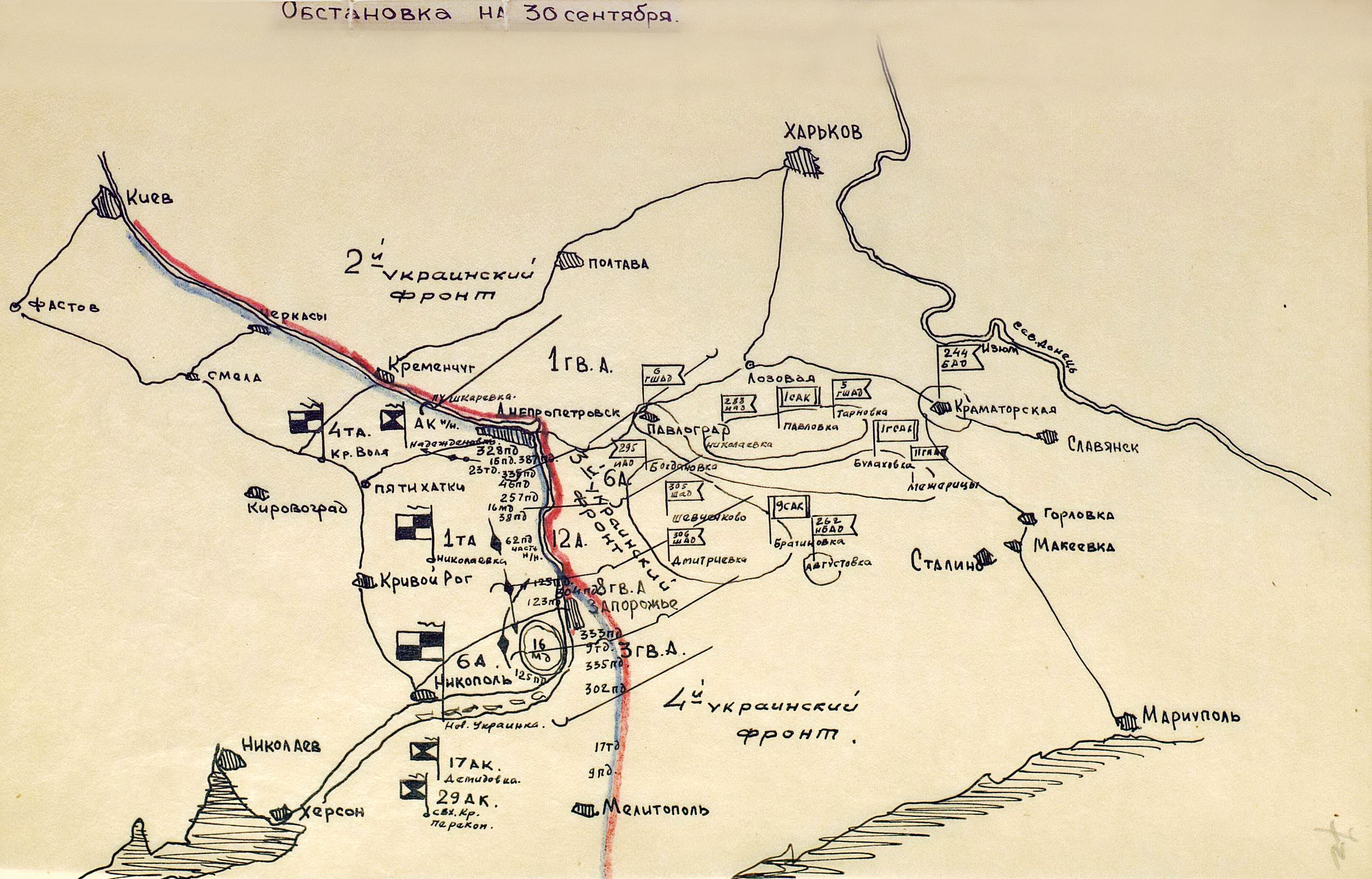 Осуществляя преследование противника, войска Степного фронта (генерал армии И.С. Конев) к исходу 25 сентября вышли на подступы к Кременчугу. Юго-Западный фронт (генерал армии Р.Я. Малиновский) войсками правого крыла достиг Днепра южнее Днепропетровска и, форсировав его, захватил на правом берегу небольшие плацдармы, а левым крылом вышел к внешнему обводу запорожского плацдарма противника. Войска Южного фронта (генерал армии Ф.И. Толбухин) подошли к оборонительному рубежу на р. Молочная, где встретили организованное сопротивление противника. В составе трёх фронтов имелось более 1,5 млн человек, 24 437 орудий и миномётов, 1160 танков и САУ, 2 тыс. боевых самолетов.