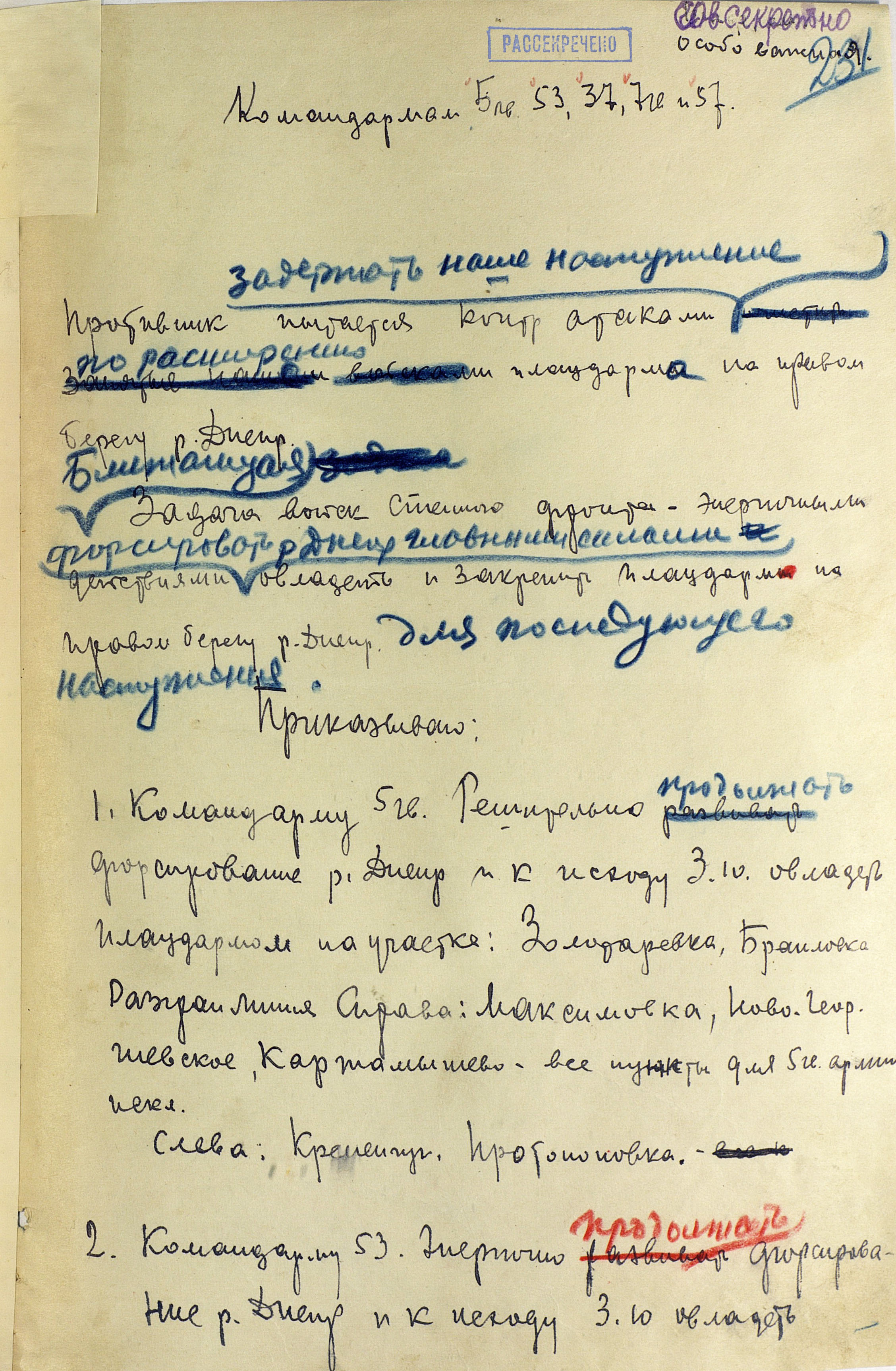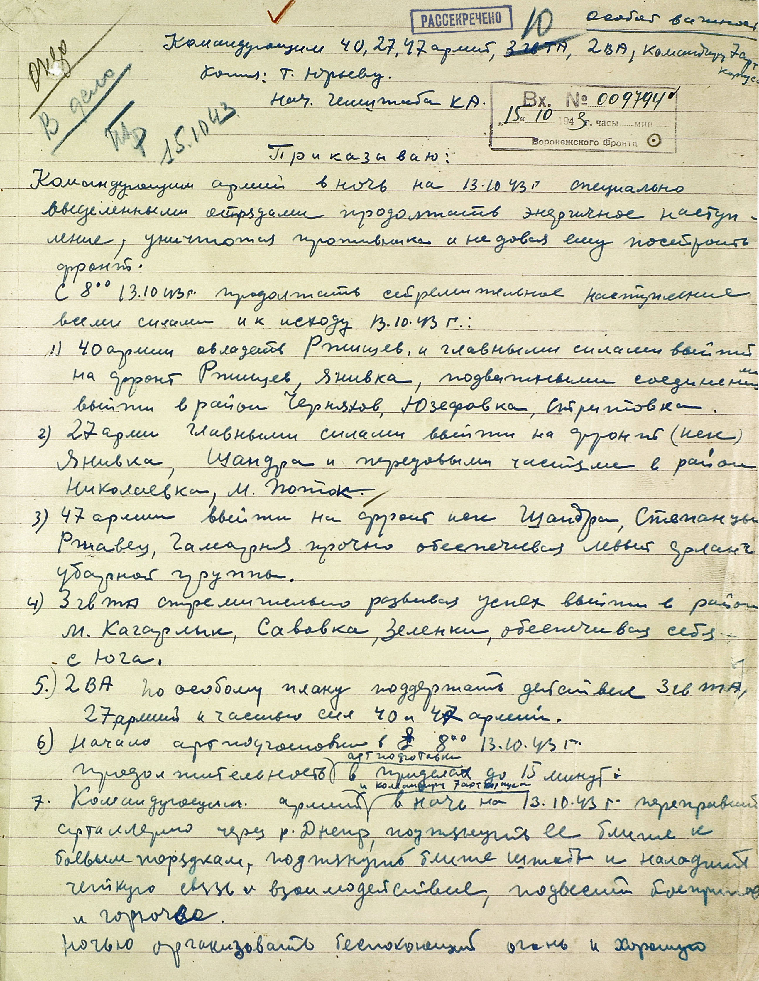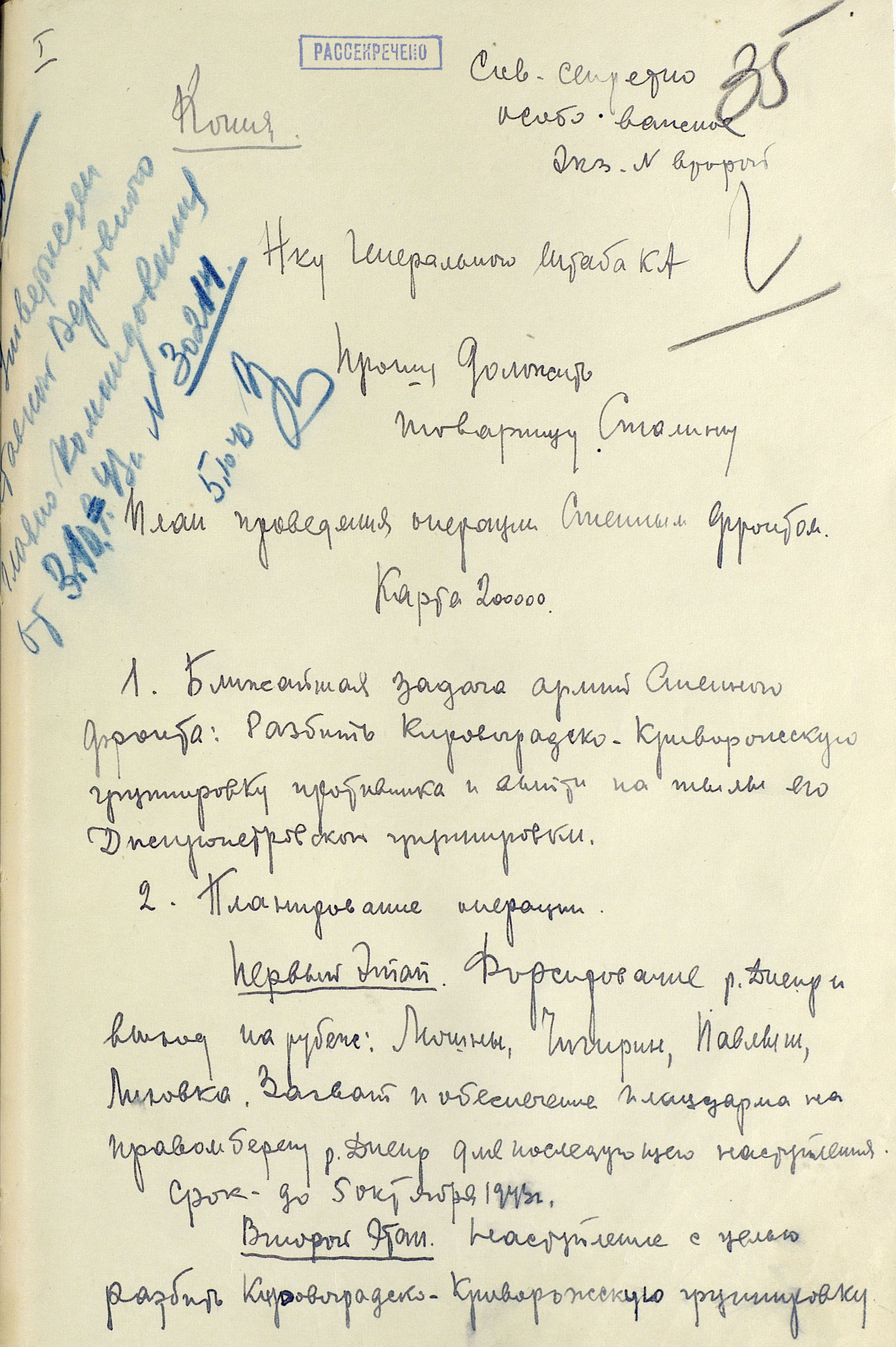 Замыслом советского Верховного главнокомандования (ВГК) предусматривалось не допустить планомерного отхода противника за Днепр, выйти к реке на широком фронте и создать стратегический плацдарм на её правом берегу. Главные удары наносились на кременчугском, днепропетровском и мелитопольском направлениях. Фронтовые операции были нацелены на разгром группировок противника в важных экономических районах и центрах страны. Степной фронт должен был разгромить кременчугско-криворожскую группировку противника и выйти в тыл немецких войск в районе Днепропетровска. Юго-Западному фронту предстояло ликвидировать запорожский плацдарм противника, расширить захваченные плацдармы на правом берегу Днепра и во взаимодействии со Степным фронтом разгромить группировку врага в районе Днепропетровска и Кривого Рога. Южный фронт имел задачу прорвать оборону противника на р. Молочная, развернуть наступление на Каховку и Херсон, а также на Армянск, частью сил - на Сальково, блокировать с суши его группировку в Крыму и по возможности ворваться на полуостров для его полного освобождения.