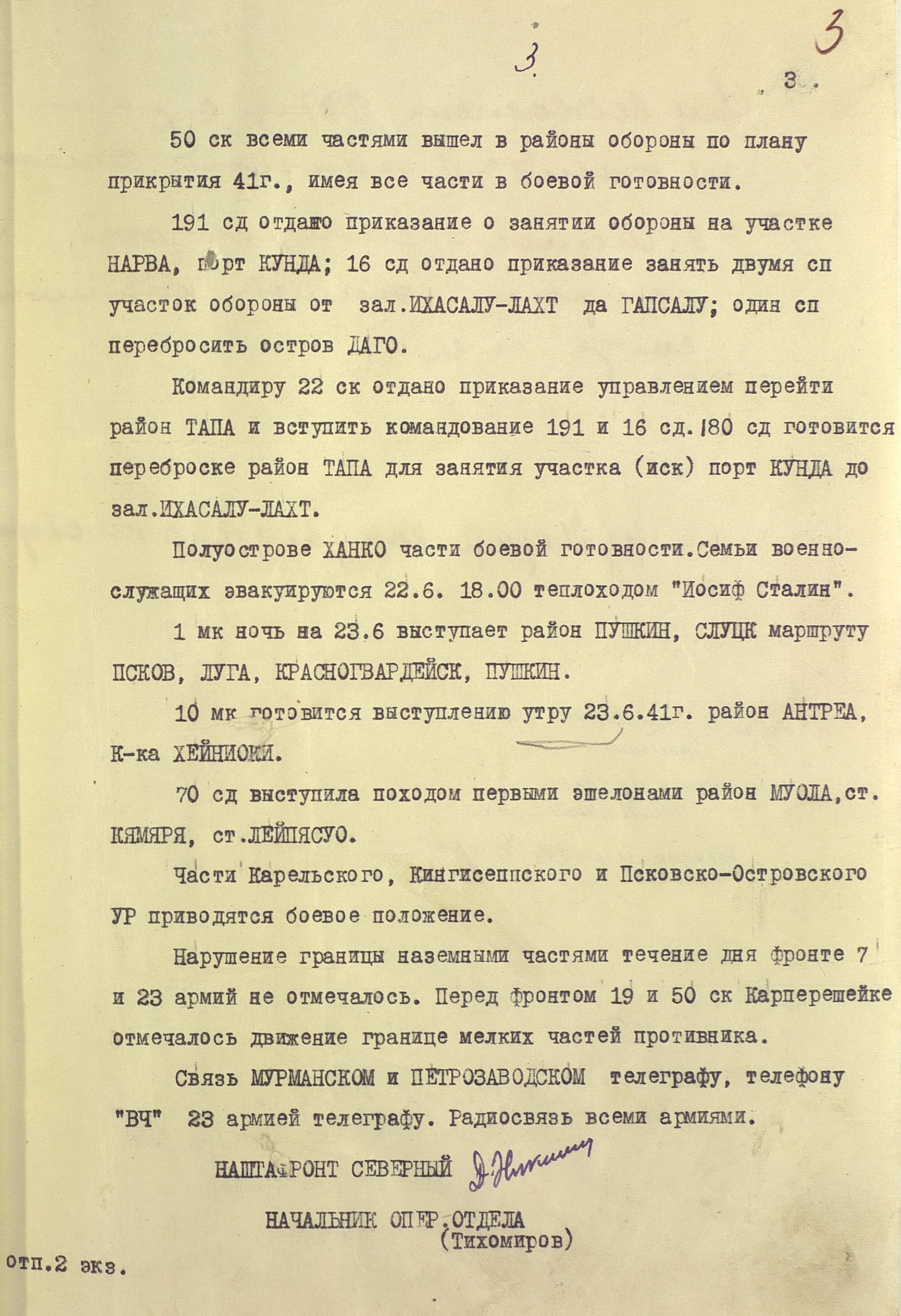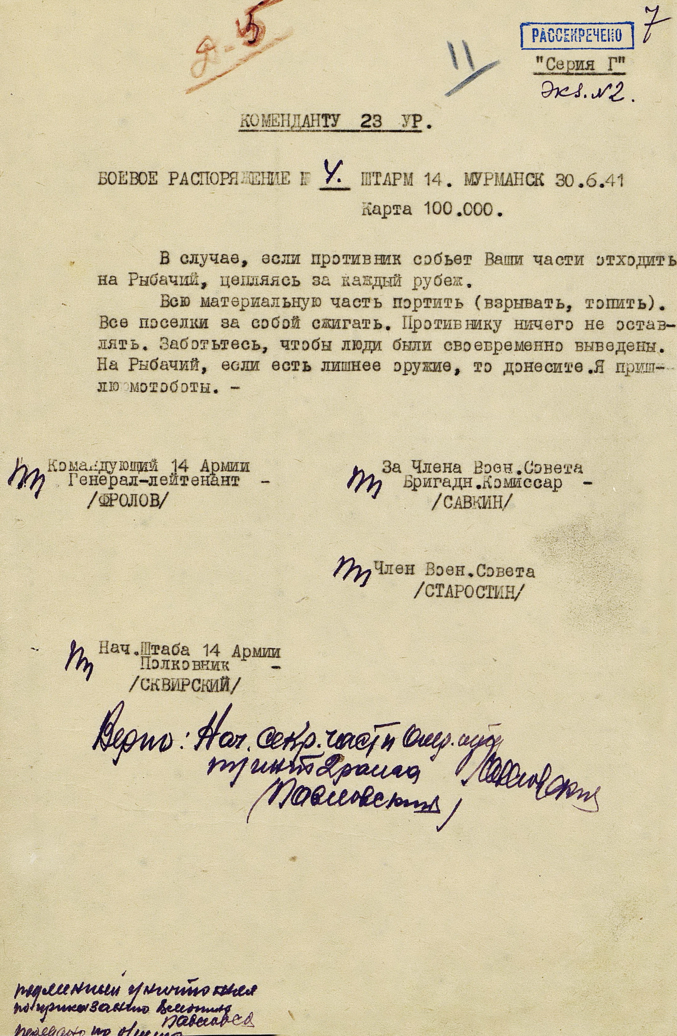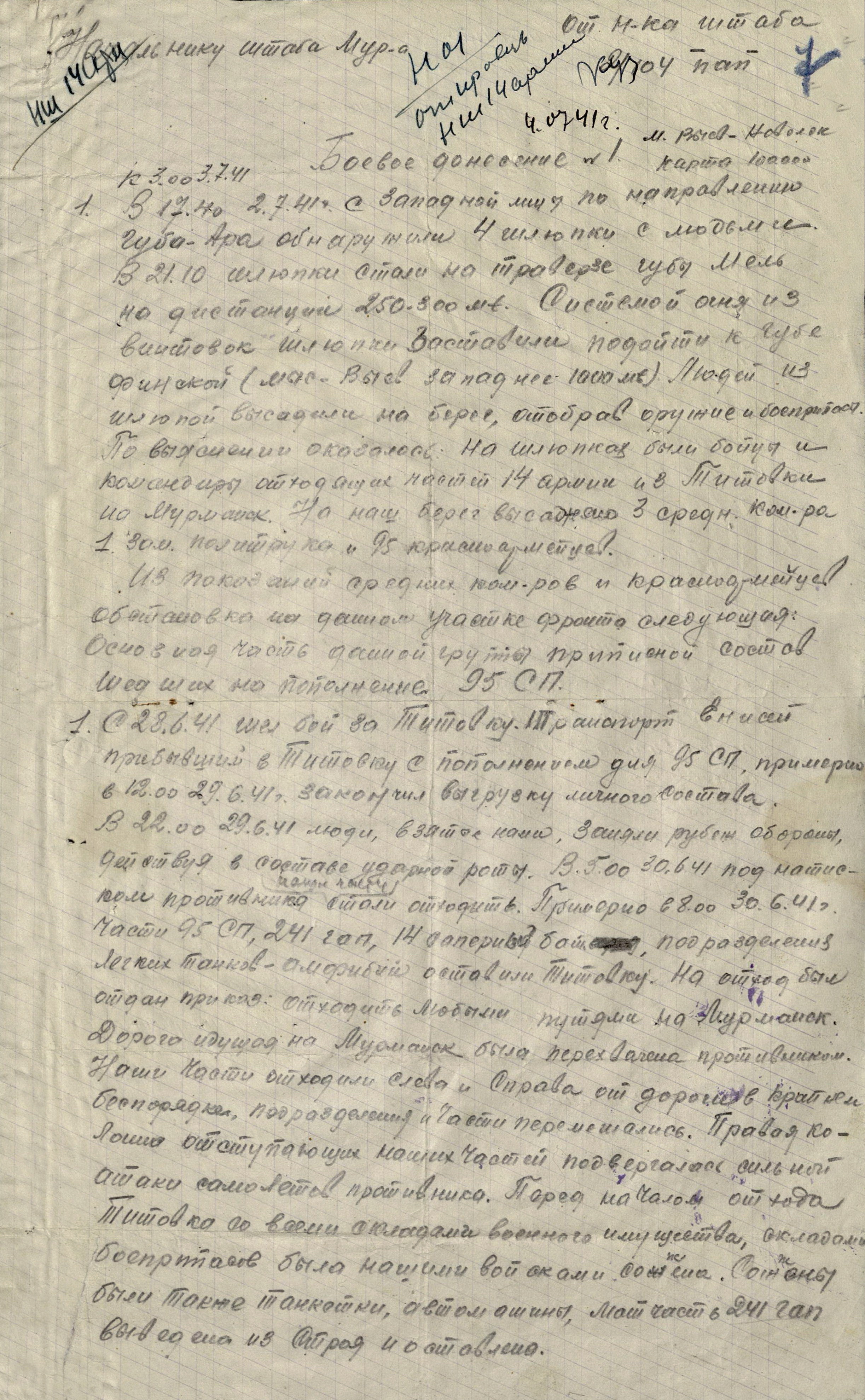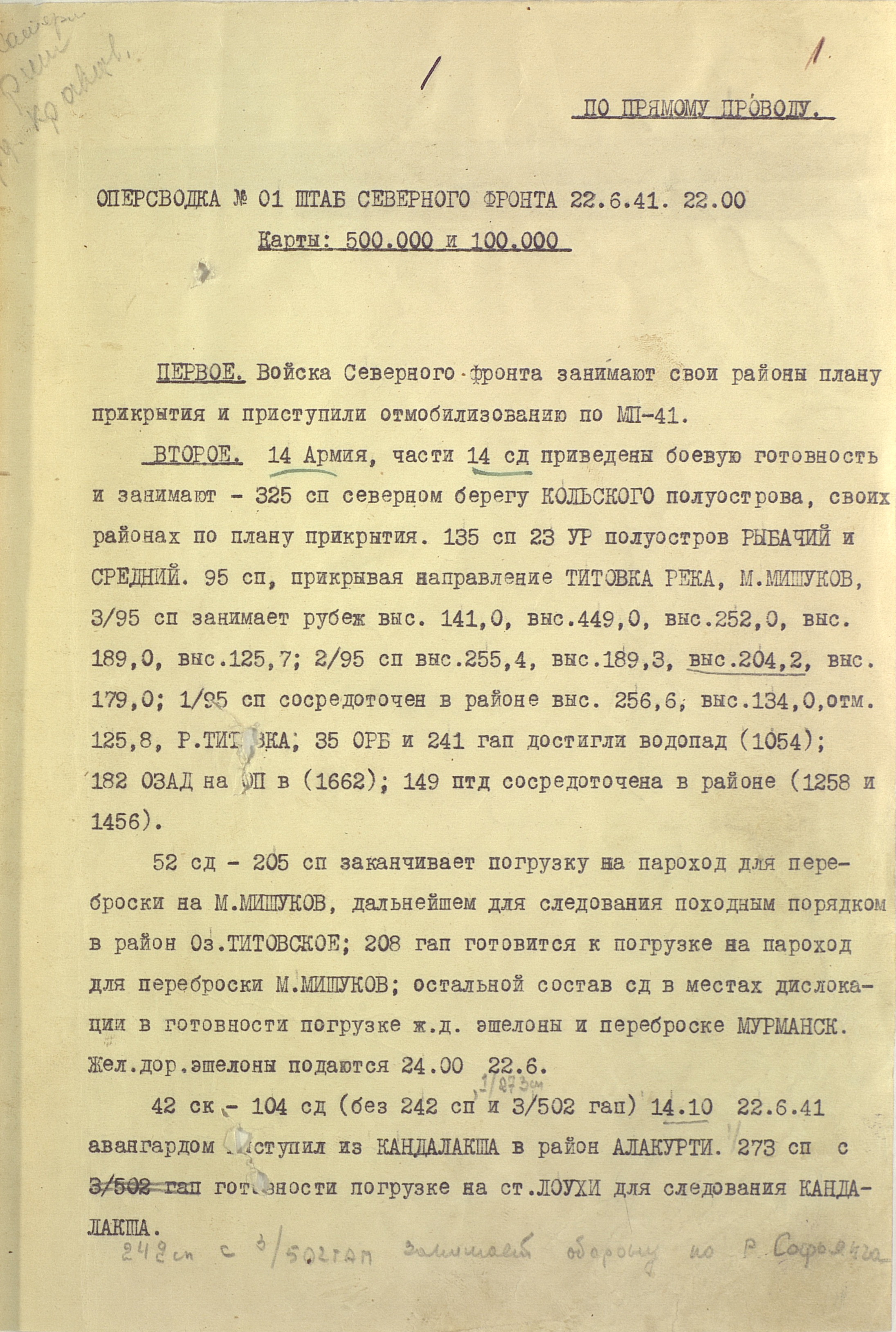 Границу СССР с Норвегией и Финляндией прикрывали войска Северного фронта (генерал-лейтенант М.М. Попов) совместно с Северным флотом (контр-адмирал, с 16.9.1941 г. вице-адмирал А.Г. Головко) - всего 402 тыс. человек, 1543 танка, 7750 орудий и миномётов, 32 надводных корабля, 15 подводных лодок, 1794 самолета. В соответствии с планом прикрытия Государственной границы перед армиями стояла задача не допустить прорыва противника на важнейших направлениях. Войска Северного фронта и силы Северного флота к 27 июня были приведены в полную боевую готовность, а стрелковые соединения и части заняли оборонительные позиции у Государственной границы и готовились к отражению вражеского наступления.