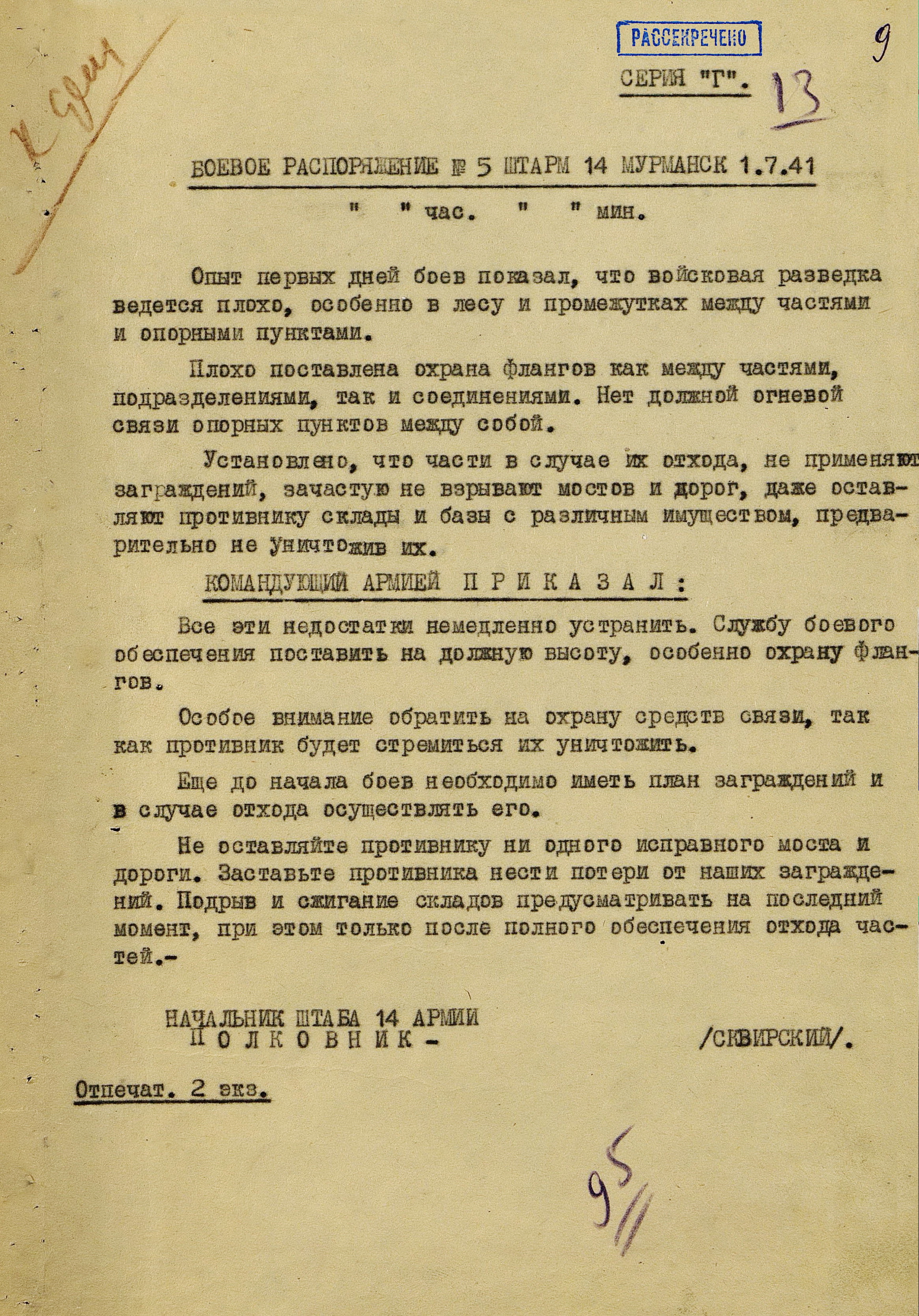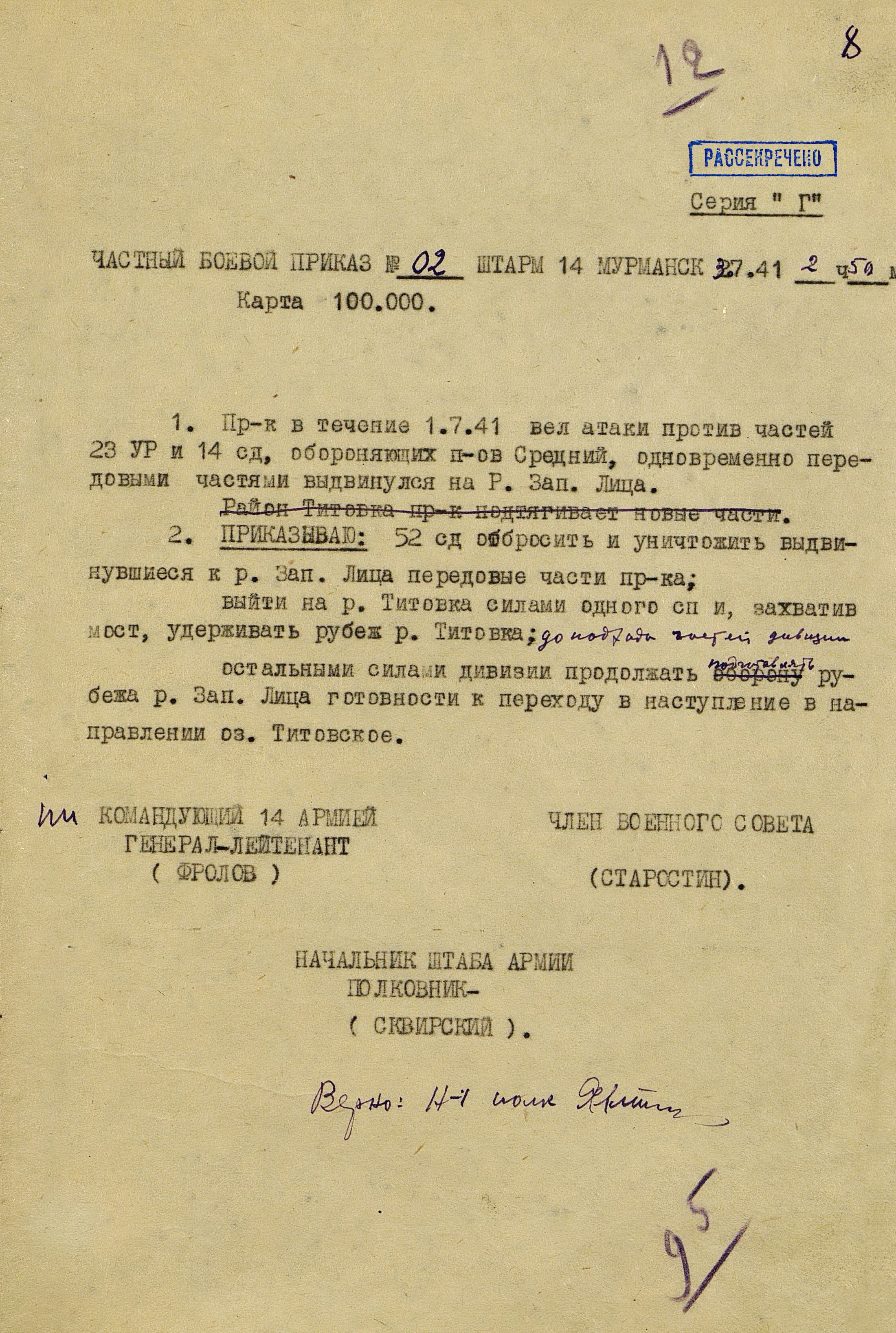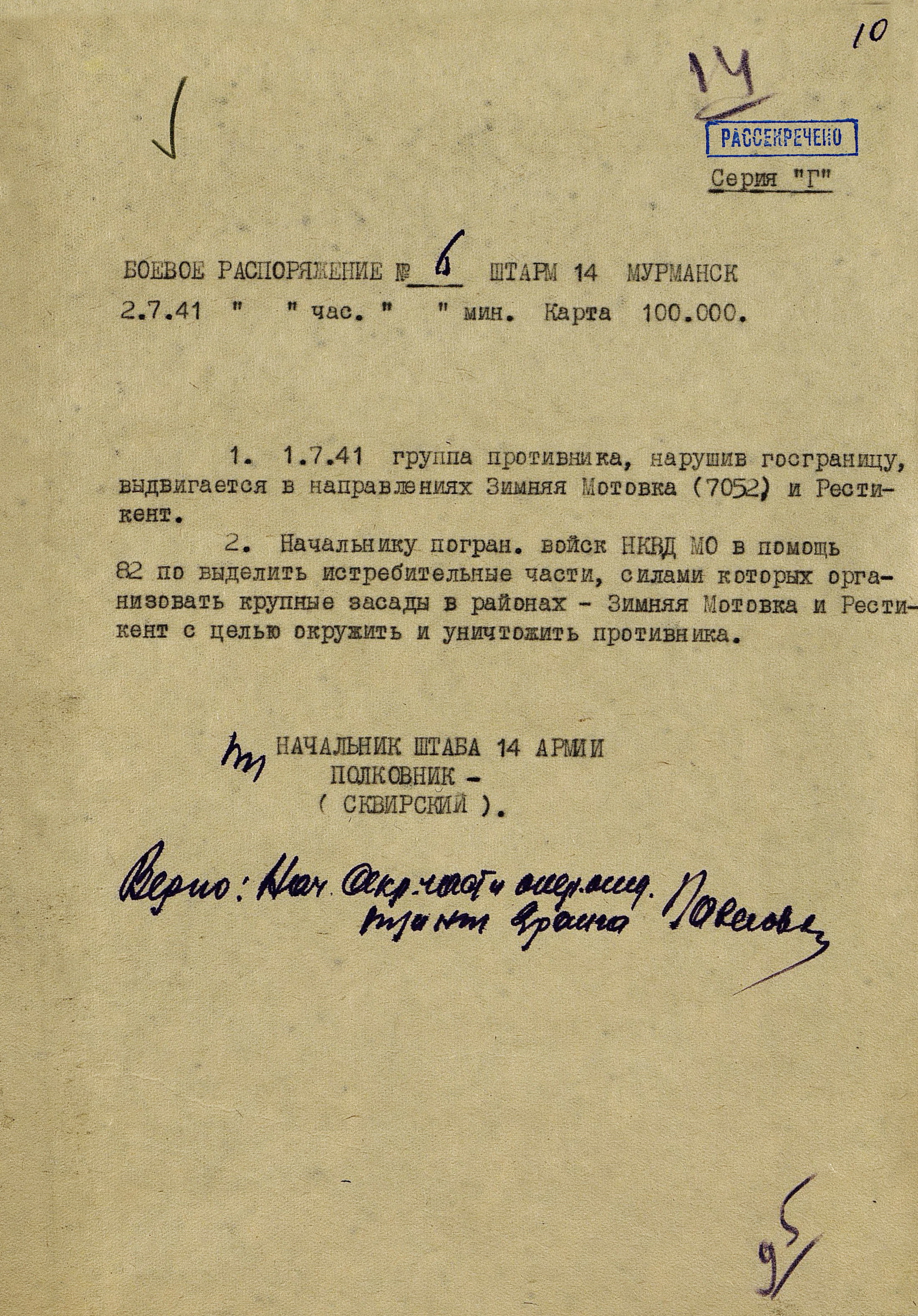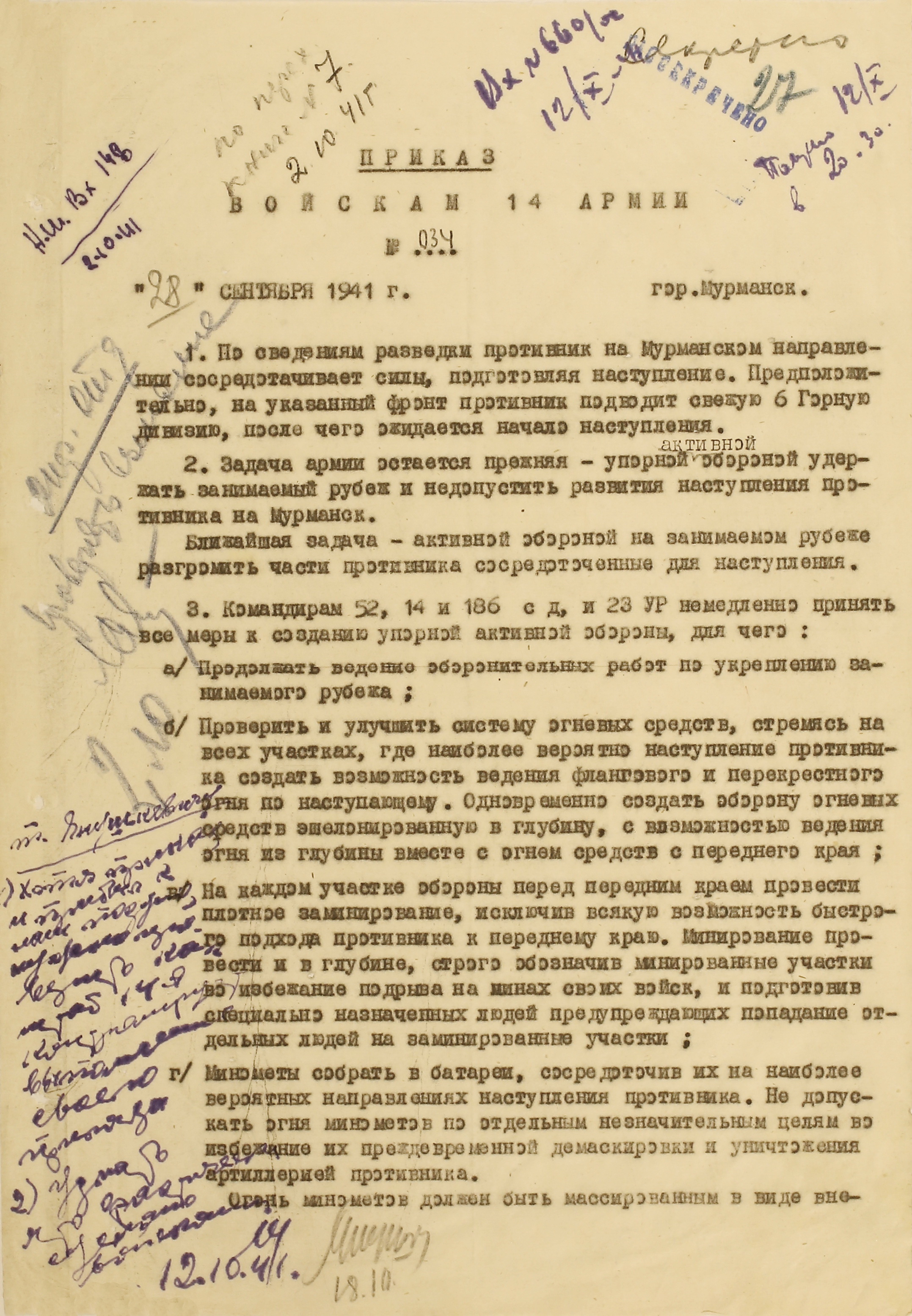 Границу СССР с Норвегией и Финляндией прикрывали войска Северного фронта (генерал-лейтенант М.М. Попов) совместно с Северным флотом (контр-адмирал, с 16.9.1941 г. вице-адмирал А.Г. Головко) - всего 402 тыс. человек, 1543 танка, 7750 орудий и миномётов, 32 надводных корабля, 15 подводных лодок, 1794 самолета. В соответствии с планом прикрытия Государственной границы перед армиями стояла задача не допустить прорыва противника на важнейших направлениях. Войска Северного фронта и силы Северного флота к 27 июня были приведены в полную боевую готовность, а стрелковые соединения и части заняли оборонительные позиции у Государственной границы и готовились к отражению вражеского наступления.