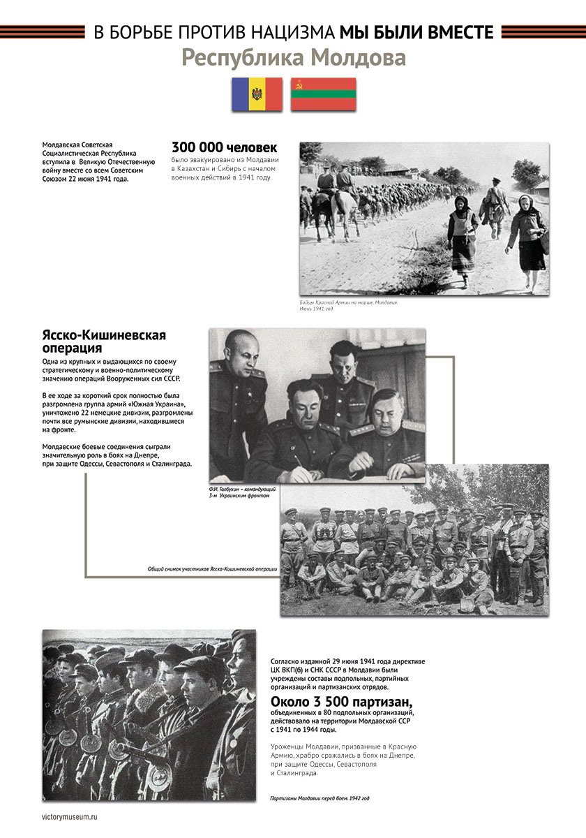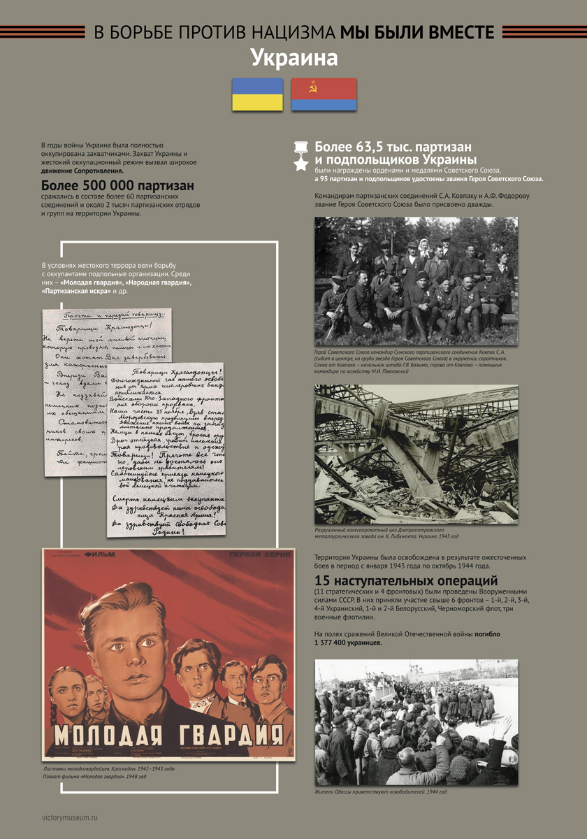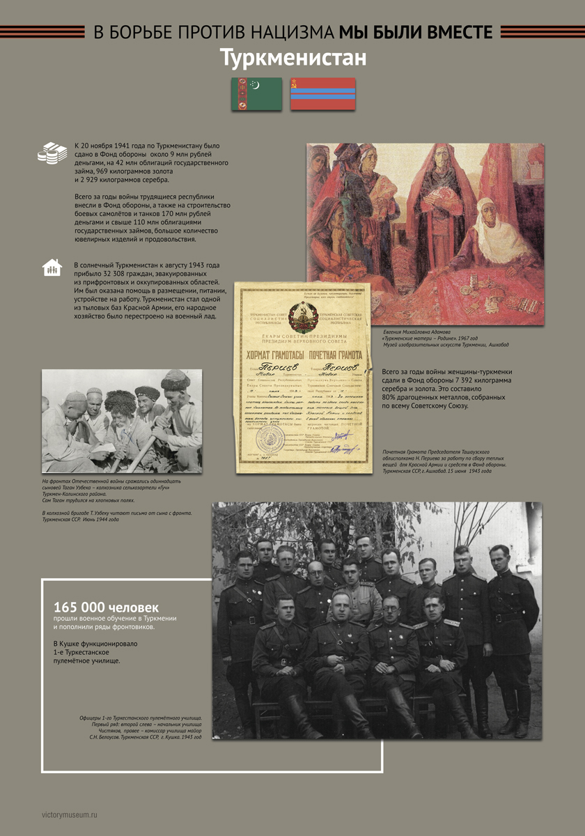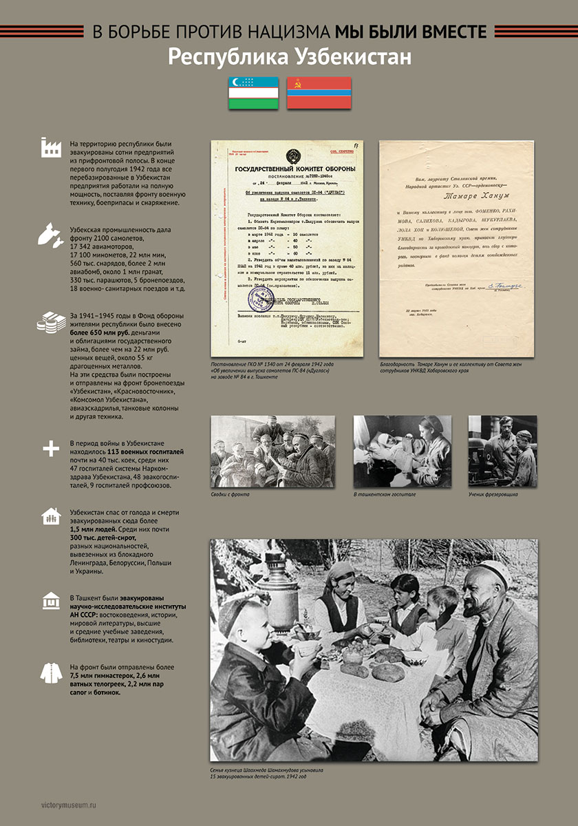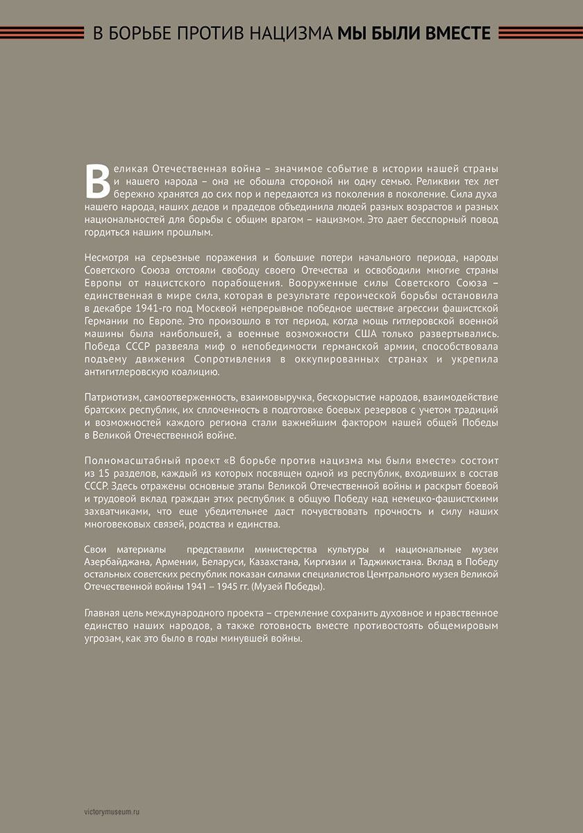 В выставке будут отражены основные этапы Великой Отечественной войны и раскрыт боевой и трудовой вклад граждан этих республик в общую Победу над немецко-фашистскими захватчиками.
