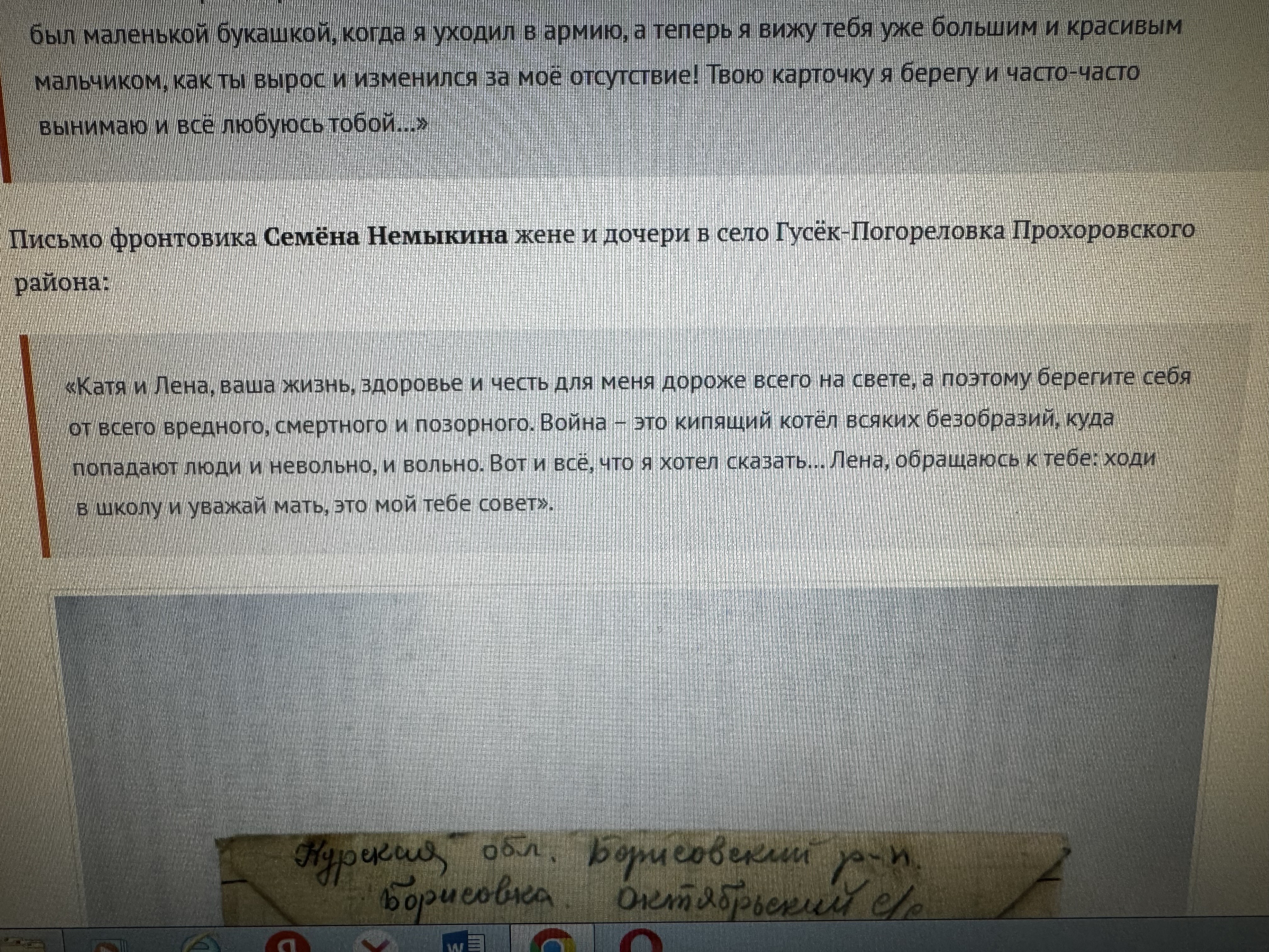 Катя, Лена, ваша жизнь, здоровье и честь для меня дороже всего на свете, а поэтому берегите себя от всего вредного, смертного и позорного. Война это кипящий котел всяких безобразий, куда попадают люди и невольно и вольно. Вот и все, что я хотел сказать. Лена, обращаюсь к тебе. Ходи в школу и уважай мать.