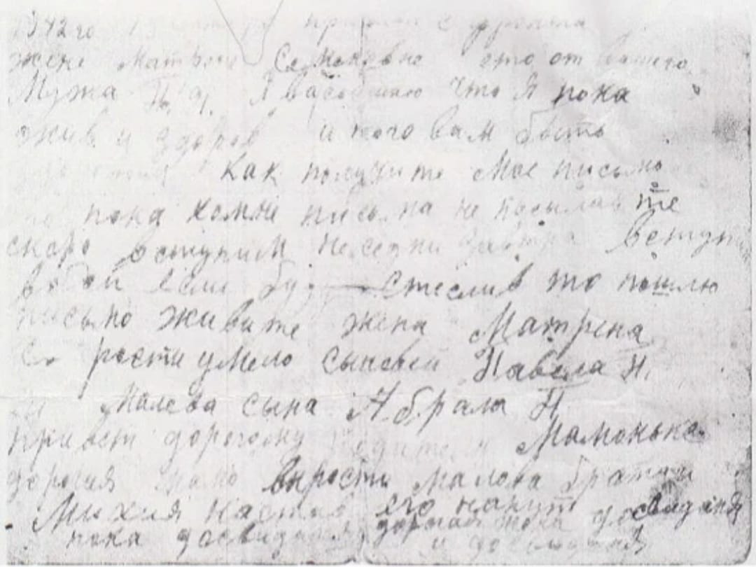 Привет с фронта жене Матрене Семеновне от вашего мужа Павла Ивановича! Я вам сообщаю, что я пока что жив и здоров, и того вам быть здоровым. Как получите мое письмо, то пока что ко мне письма не посылайте. Скоро не сегодня. Завтра вступим в бой.